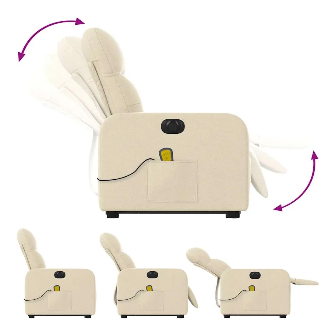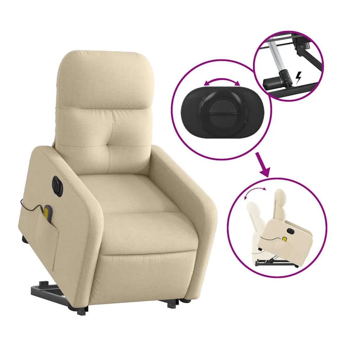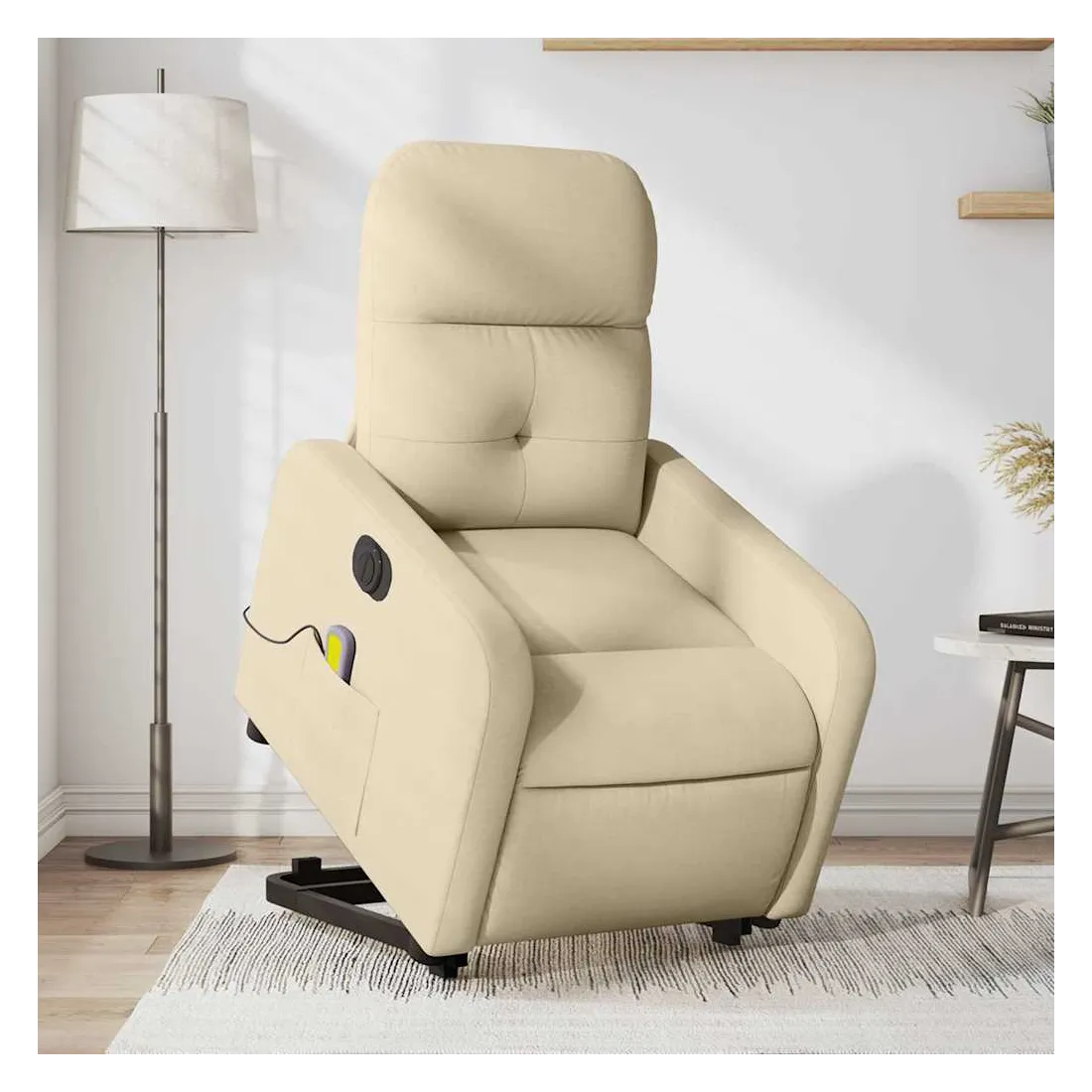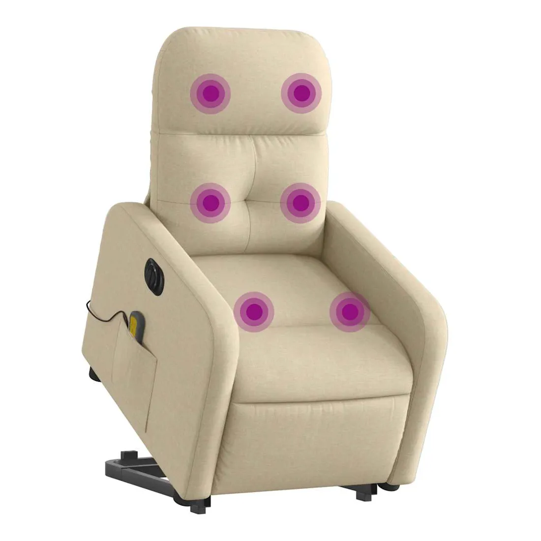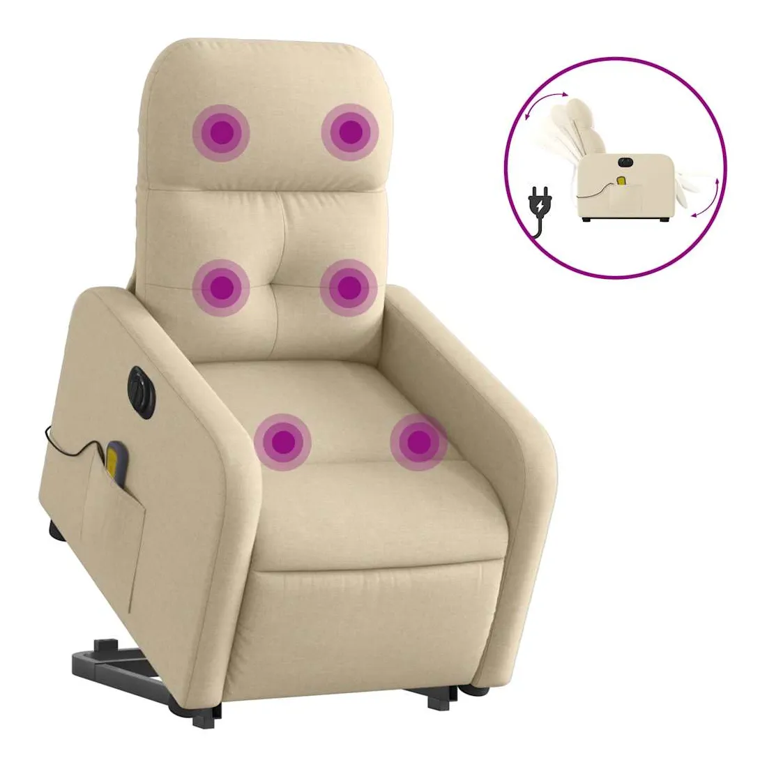 Asseyez-vous et détendez-vous dans ce fauteuil inclinable de massage électrique très confortable ! Fonction de levage électrique : ce fauteuil inclinable pour personnes âgées est équipé d'un moteur électrique pour la fonction de levage. Grâce à la fonction qui pousse toute la chaise vers le haut, vous pouvez facilement vous tenir debout sans stresser votre dos et vos genoux en appuyant simplement sur le bouton.Fonction d'inclinaison électrique : ce fauteuil inclinable est également équipé d'un moteur électrique qui permet de régler automatiquement le repose-pied et le dossier dans n'importe quelle position, selon votre confort, en appuyant simplement sur le bouton situé sur le côté du fauteuil. Cette fonction permet une inclinaison maximale de 135 degrés. En outre, le dossier peut revenir automatiquement à sa position d'origine par une simple pression sur le bouton.Fonction de vibration : les 6 points de massage vous permettent de faire l'expérience d'un massage mieux ciblé. De plus, la télécommande incluse vous permet de choisir différents programmes de massage. La fonction de massage est alimentée par le connecteur USB qui nécessite une source d'alimentation USB certifiée de 5 V (non fournie).Expérience d'assise confortable : le siège, le dossier et les larges accoudoirs bien rembourrés recouverts de tissu procurent une sensation confortable et chaleureuse, vous permettant de vous sentir enveloppé lorsque vous êtes assis. Le tissu présente un aspect simple et épuré et est respirant et durable.Poche latérale pratique : ce fauteuil est doté d'une poche latérale pour ranger votre télécommande ou garder vos objets essentiels à portée de main.