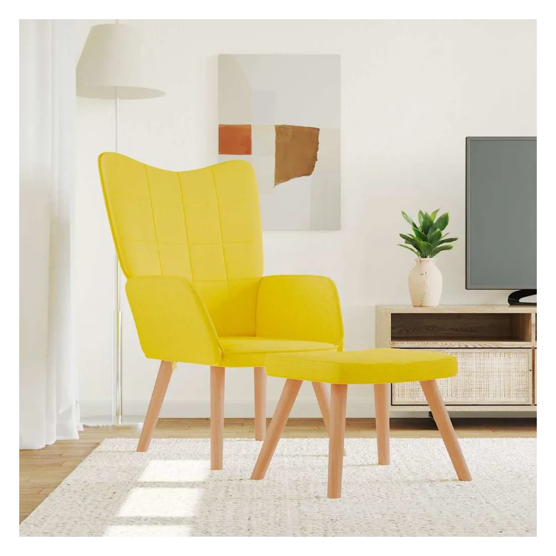 Cette chaise de relaxation avec tabouret au design chic et élégant apportera une touche de modernité à votre déco. Doté de quelques blocs, ce fauteuil est esthétique. Grâce à sa mousse rembourrée recouverte d'un tissu doux au toucher, vous pourrez profiter d'un confort optimal pendant votre temps d'assise. De plus, soutenue par un cadre en acier et des pieds en bois, la chaise à manger avec tabouret est stable et durable.