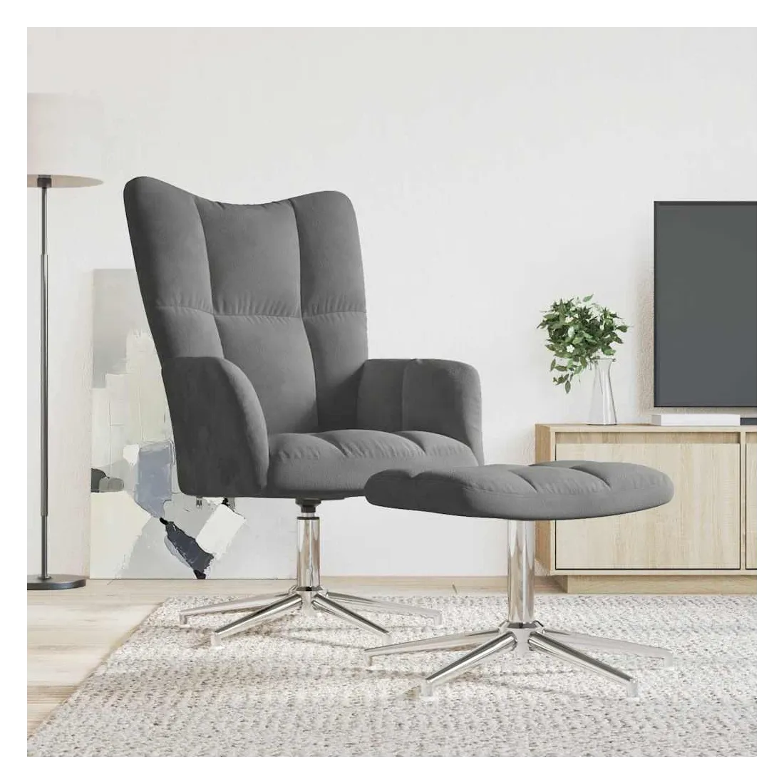 Cette chaise de relaxation avec repose-pied au design chic et élégant apportera une touche de modernité à votre déco. Avec quelques blocs, ce fauteuil est esthétique. Grâce à sa mousse bien rembourrée recouverte de velours doux au toucher, vous pourrez profiter d'un confort optimal pendant votre temps d'assise. Ce siège de relaxation peut pivoter à 360 degrés pour une grande flexibilité. De plus, soutenue par un cadre en acier et des pieds croisés, la chaise de relaxation avec un tabouret est stable et durable.