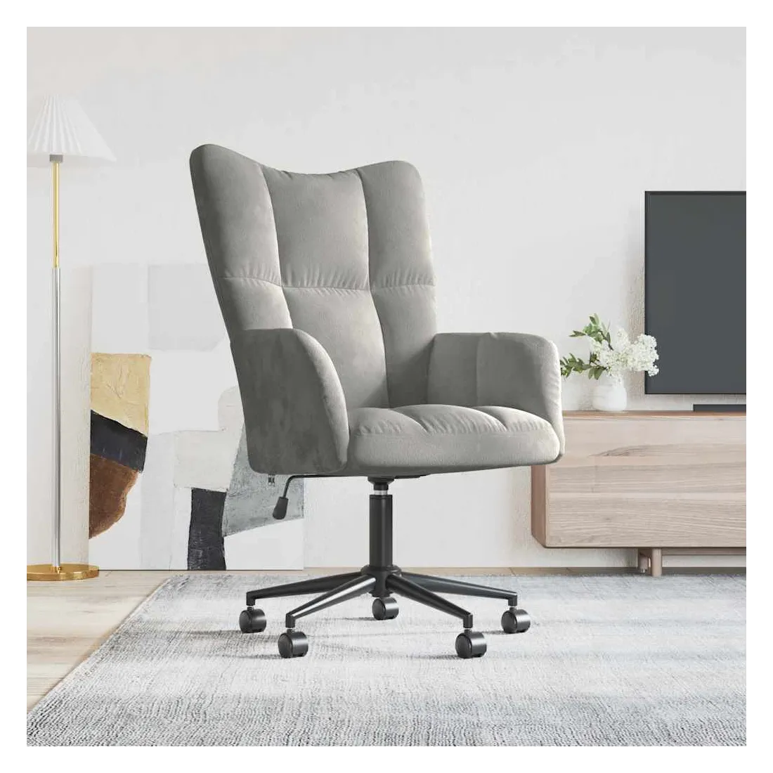 Cette chaise de relaxation, au design chic et élégant, apportera une touche de modernité à votre décoration. Avec quelques blocs, cette chaise de bureau est esthétiquement agréable. Grâce à sa mousse bien rembourrée recouverte de velours doux au toucher, vous pourrez profiter d'un confort optimal pendant votre temps d'assise. Équipé de mécanisme de levage à gaz, ce fauteuil de salon est réglable en hauteur, vous aidant à trouver la position parfaite. Ses roulettes et son pivotement à 360 degrés signifient également une fantastique flexibilité de mouvement. De plus, soutenu par un cadre en acier et des pieds croisés, le fauteuil de relaxation est stable et durable.