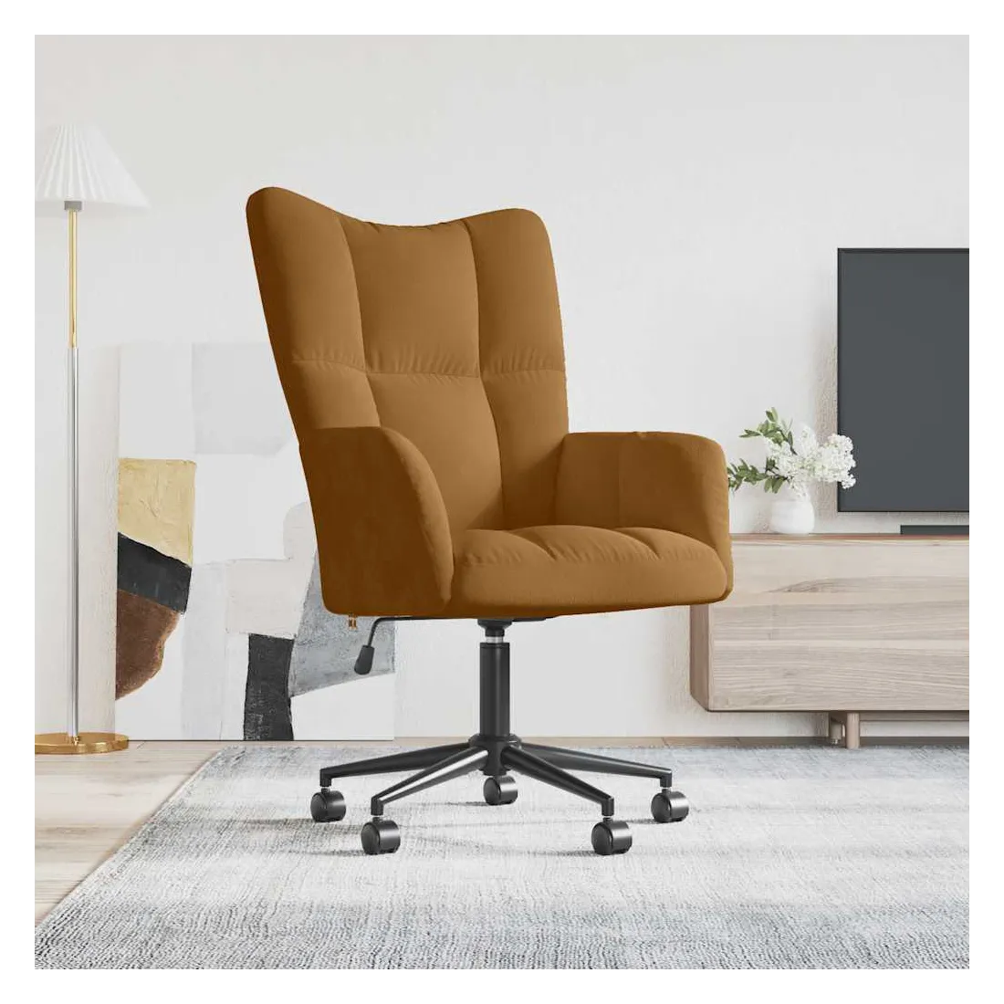 Cette chaise de relaxation, au design chic et élégant, apportera une touche de modernité à votre décoration. Avec quelques blocs, cette chaise de bureau est esthétiquement agréable. Grâce à sa mousse bien rembourrée recouverte de velours doux au toucher, vous pourrez profiter d'un confort optimal pendant votre temps d'assise. Équipé de mécanisme de levage à gaz, ce fauteuil de salon est réglable en hauteur, vous aidant à trouver la position parfaite. Ses roulettes et son pivotement à 360 degrés signifient également une fantastique flexibilité de mouvement. De plus, soutenu par un cadre en acier et des pieds croisés, le fauteuil de relaxation est stable et durable.