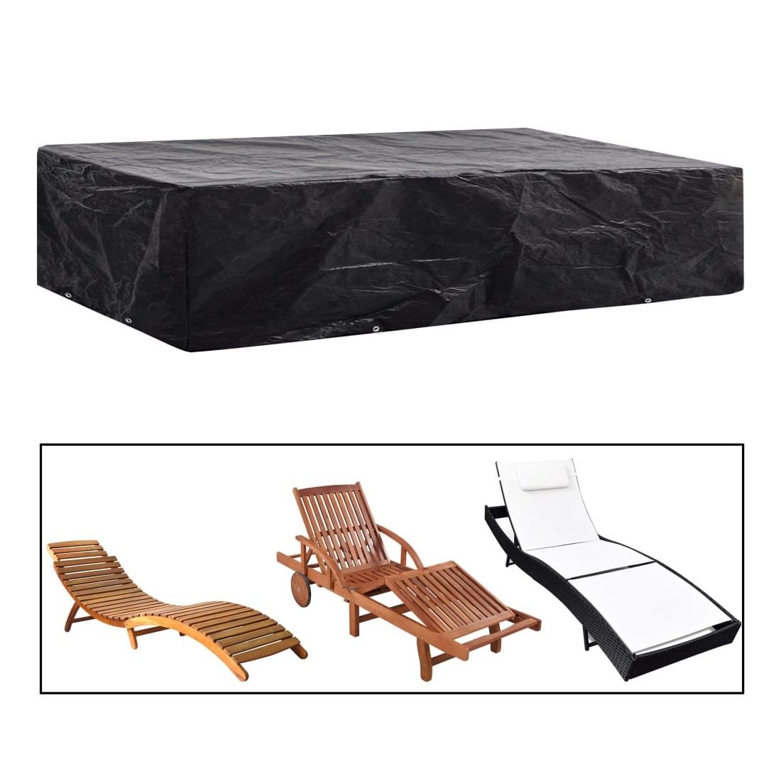 Notre housse de mobilier de jardin de haute qualité protège vos chaises longues de la saleté, du vent, de la pluie et de la lumière UV tout au long de l'année. Elle peut également être utilisée pour protéger des bancs ou des tables d'extérieur. La housse est faite de polyéthylène durable, qui est imperméable, résistant aux UV et à l'usure. Elle est dotée de 8 œillets en aluminium et d'une corde de fixation pour s'adapter à vos meubles d'extérieur. La housse en PE est lavable et peut être facilement pliée lorsqu'elle n'est pas utilisée. La livraison comprend 2 housses de mobilier de jardin. Remarque : ce produit n'est pas 100 % étanche. Ainsi, nous vous recommandons de le traiter avec un spray imperméabilisant pour une meilleure fonction d'imperméabilité.
