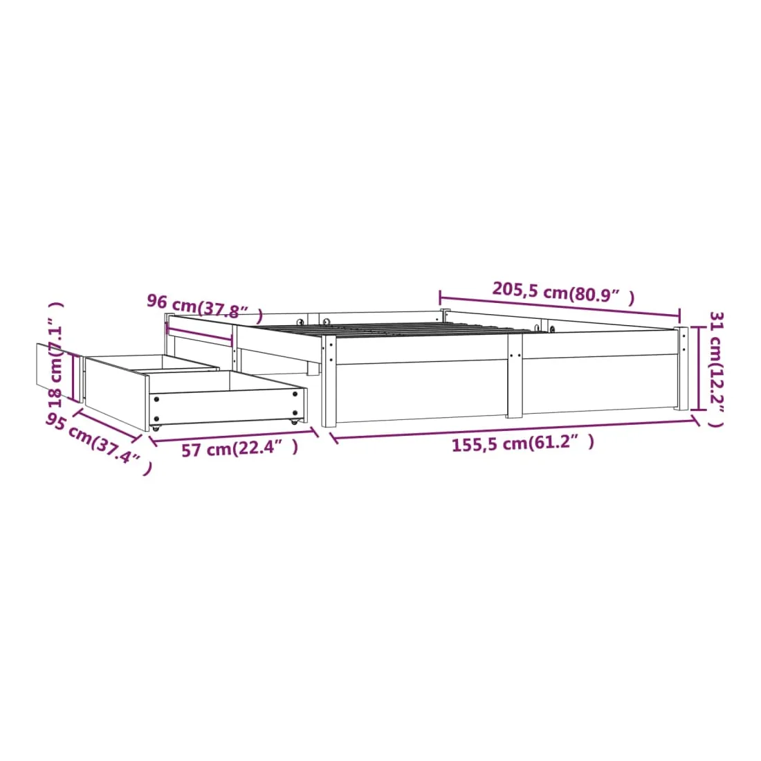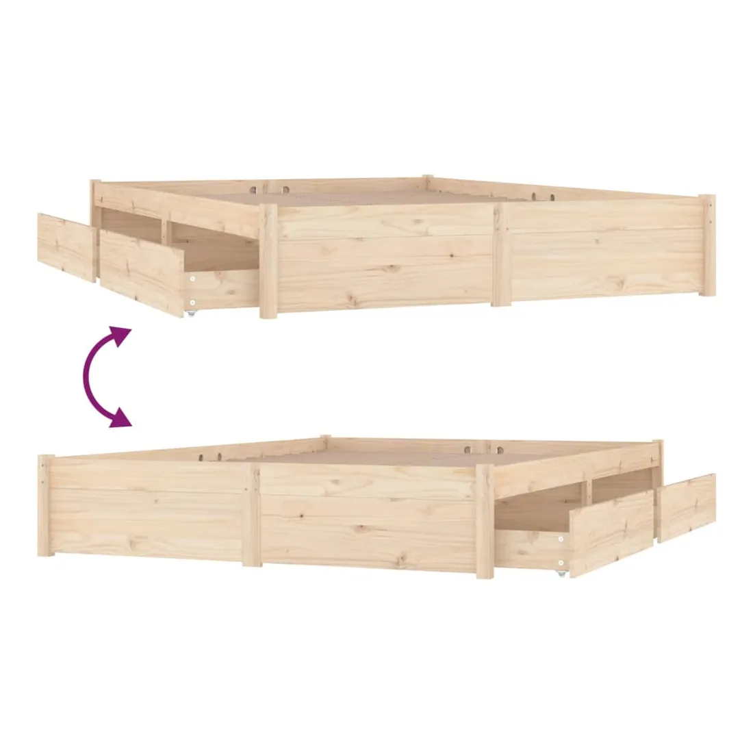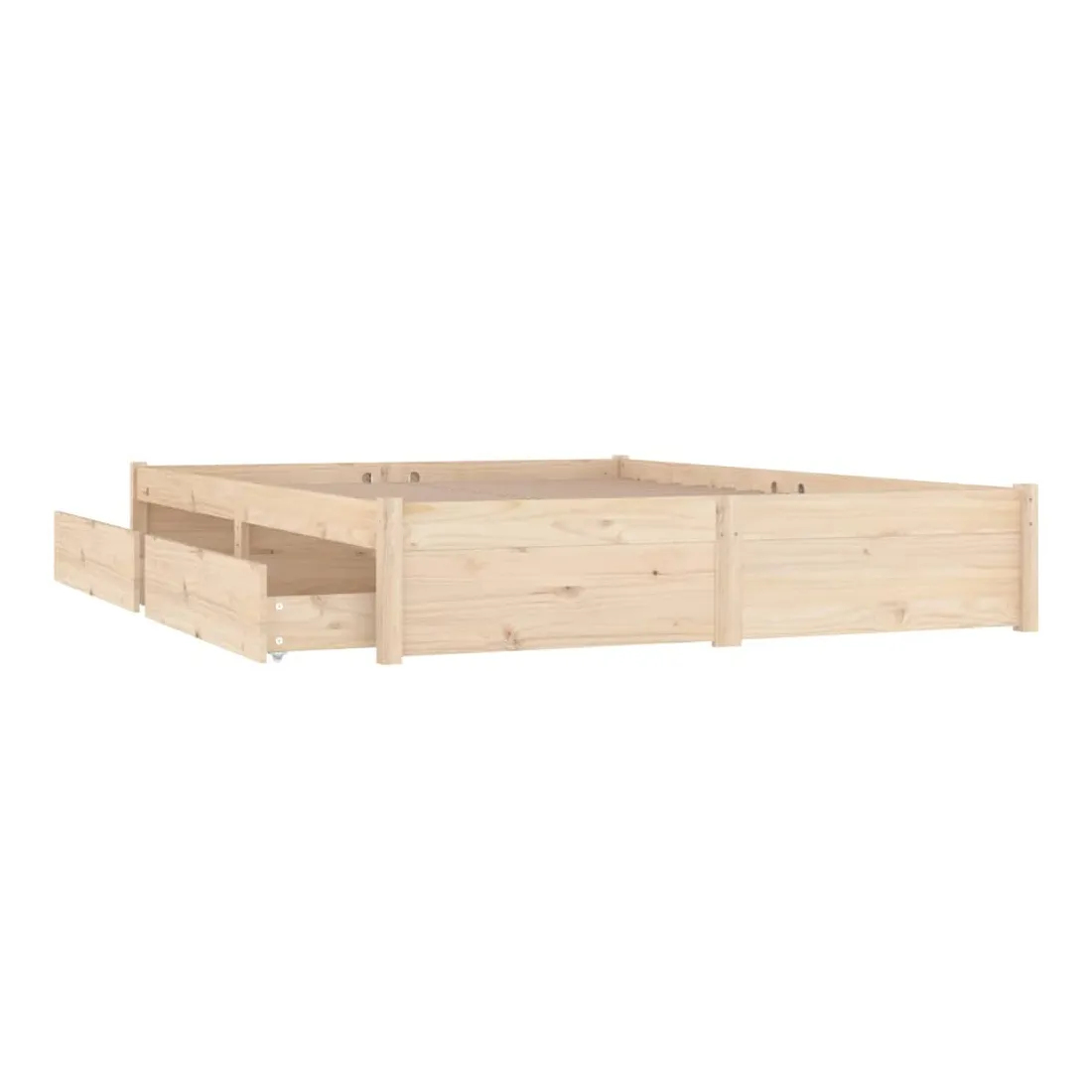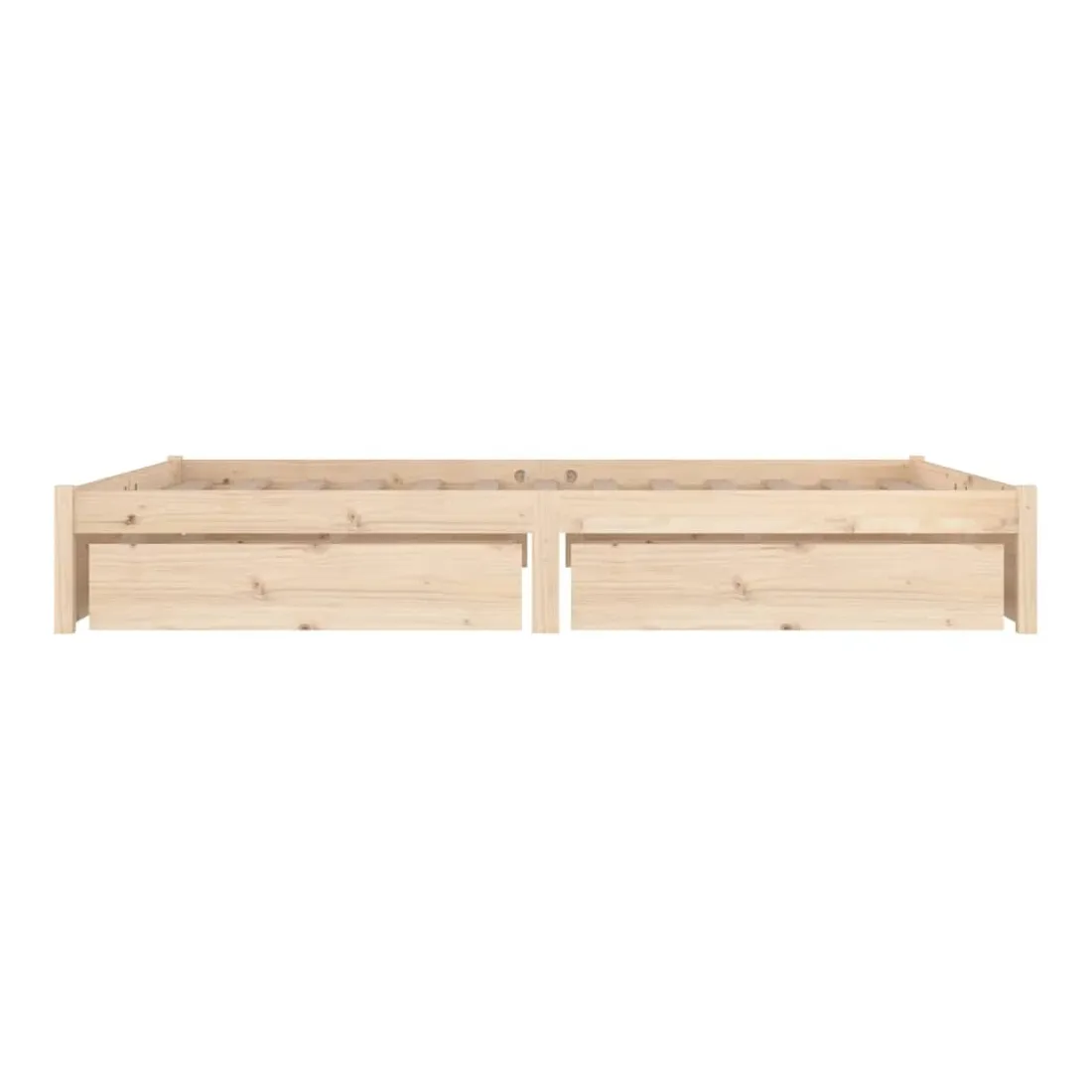 Avec un design simple mais intemporel, ce cadre de lit en bois sera un supplément vraiment pratique et décoratif à votre chambre à coucher. Bois de pin massif : le bois de pin massif est un matériau naturel magnifique. Le bois de pin a un grain droit et les nœuds donnent au matériau son aspect caractéristique et rustique.Lattes robustes : les lattes de contreplaqué assurent une bonne répartition du poids, garantissant que le matelas reste en place à chaque torsion de votre corps pendant le sommeil.Fonction de rangement : les tiroirs de lit inclus offrent suffisamment d'espace de rangement pour ranger vos articles essentiels, gardant votre pièce propre et bien rangée. Remarque :La livraison comprend uniquement le cadre de lit. Les matelas ne sont pas inclus. Vous pouvez consulter notre boutique pour trouver les matelas assortis.Ce cadre de lit convient à un matelas mesurant 150 x 200 cm (très grand).