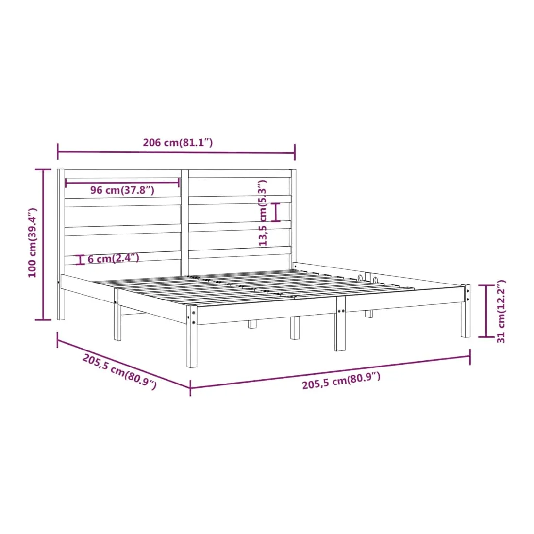- Dimensions de la tête de lit : 206 x 4 x 100 cm (l x P x H)