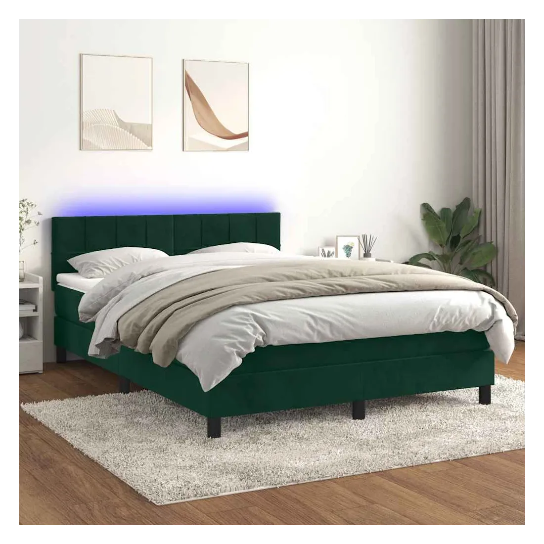 Utilisez ce sommier tapissier avec matelas et LED pour profiter d'un sommeil réparateur ! C'est le point central de votre chambre à coucher. Velours doux : le velours est un tissu doux et luxueux qui se reconnaît à son tas dense de fibres uniformément coupées qui ont une touche lisse. Le tissu en velours présente un toucher doux distinctif, ce qui le rend confortable au toucher.Tête de lit pratique : la tête de lit est réglable en hauteur selon vos préférences. La tête de lit vous offre un excellent soutien du dos lorsque vous êtes assis dans votre lit pour lire ou regarder la télévision.Bande LED colorée : apportez de l'éclairage dans l'obscurité avec des lumières LED colorées !Matelas à ressorts ensachés : le ressort ensaché individuel intégré est connu pour sa très haute qualité tout en assurant un haut niveau de durabilité et d'adaptabilité. Il peut absorber efficacement le bruit et les chocs causés par les sauts et les rotations.Protège-matelas doux pour la peau : le protège-matelas est recouvert d'un tissu résistant et doux pour la peau, ce qui le rend souple et confortable. Remarque :Pour des raisons d'hygiène, le matelas ne peut pas être retourné si l'emballage est retiré ou ouvert.Chaque produit est livré avec un manuel de montage dans la boîte pour un montage facile.Seule la partie avec un symbole de ciseaux peut être coupée et seule la partie avec l'USB continuera à fonctionner comme avant.Ce produit est doté d'un connecteur USB, mais la source d'alimentation certifiée de USB 5V n'est pas incluse.