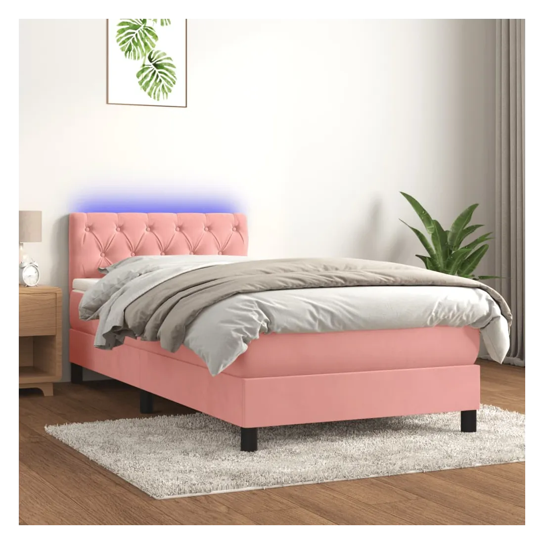 Utilisez ce sommier tapissier avec matelas et LED pour profiter d'un sommeil réparateur ! C'est le point central de votre chambre à coucher. Velours doux : le velours est un tissu doux et luxueux qui se reconnaît à son tas dense de fibres uniformément coupées qui ont une touche lisse. Le tissu en velours présente un toucher doux distinctif, ce qui le rend confortable au toucher.Tête de lit pratique : la tête de lit est réglable en hauteur selon vos préférences. La tête de lit vous offre un excellent soutien du dos lorsque vous êtes assis dans votre lit pour lire ou regarder la télévision.Bande LED colorée : apportez de l'éclairage dans l'obscurité avec des lumières LED colorées !Matelas à ressorts ensachés : le ressort ensaché individuel intégré est connu pour sa très haute qualité tout en assurant un haut niveau de durabilité et d'adaptabilité. Il peut absorber efficacement le bruit et les chocs causés par les sauts et les rotations.Protège-matelas doux pour la peau : le protège-matelas est recouvert d'un tissu résistant et doux pour la peau, ce qui le rend souple et confortable. Remarque :Pour des raisons d'hygiène, le matelas ne peut pas être retourné si l'emballage est retiré ou ouvert.Chaque produit est livré avec un manuel de montage dans la boîte pour un montage facile.Seule la partie avec un symbole de ciseaux peut être coupée et seule la partie avec l'USB continuera à fonctionner comme avant.Ce produit est doté d'un connecteur USB, mais la source d'alimentation certifiée de USB 5V n'est pas incluse.