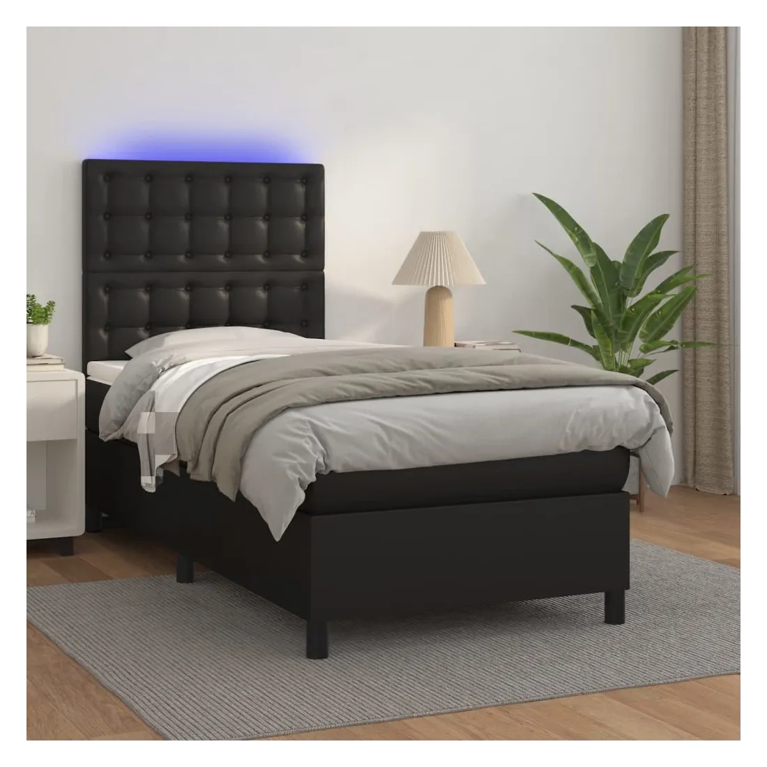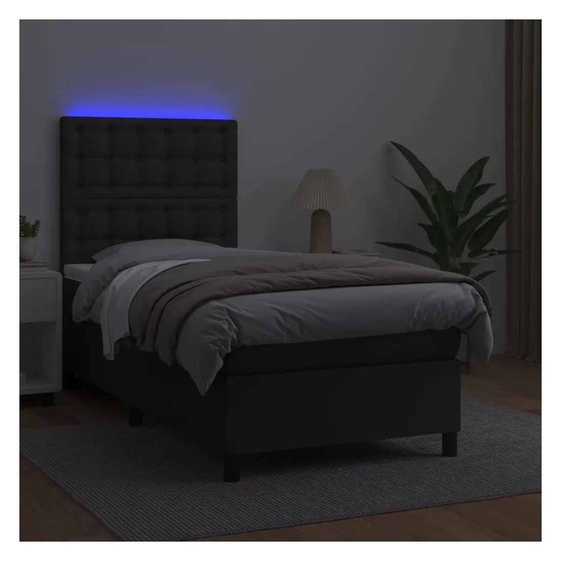 Utilisez ce sommier tapissier avec matelas et LED pour profiter d'un sommeil réparateur ! C'est le point central de votre chambre à coucher. Similicuir durable : le similicuir de qualité supérieure est un matériau très durable. Il est résistant aux taches, ce qui le rend facile à nettoyer avec un chiffon humide. La surface lisse donne également un aspect luxueux et la beauté du cuir véritable.Tête de lit pratique : la tête de lit est réglable en hauteur selon vos préférences. La tête de lit vous offre un excellent soutien du dos lorsque vous êtes assis dans votre lit pour lire ou regarder la télévision.Bande LED colorée : apportez de l'éclairage dans l'obscurité avec des lumières LED colorées !Matelas à ressorts ensachés : le ressort ensaché individuel intégré est connu pour sa très haute qualité tout en assurant un haut niveau de durabilité et d'adaptabilité. Il peut absorber efficacement le bruit et les chocs causés par les sauts et les rotations.Protège-matelas doux pour la peau : le protège-matelas est recouvert d'un tissu résistant et doux pour la peau, ce qui le rend souple et confortable. Remarque :Pour des raisons d'hygiène, le matelas ne peut pas être retourné si l'emballage est retiré ou ouvert.Seule la partie avec un symbole de ciseaux peut être coupée et seule la partie avec l'USB continuera à fonctionner comme avant.Chaque produit est livré avec un manuel de montage dans la boîte pour un montage facile.Ce produit est doté d'un connecteur USB, mais la source d'alimentation certifiée de USB 5V n'est pas incluse.