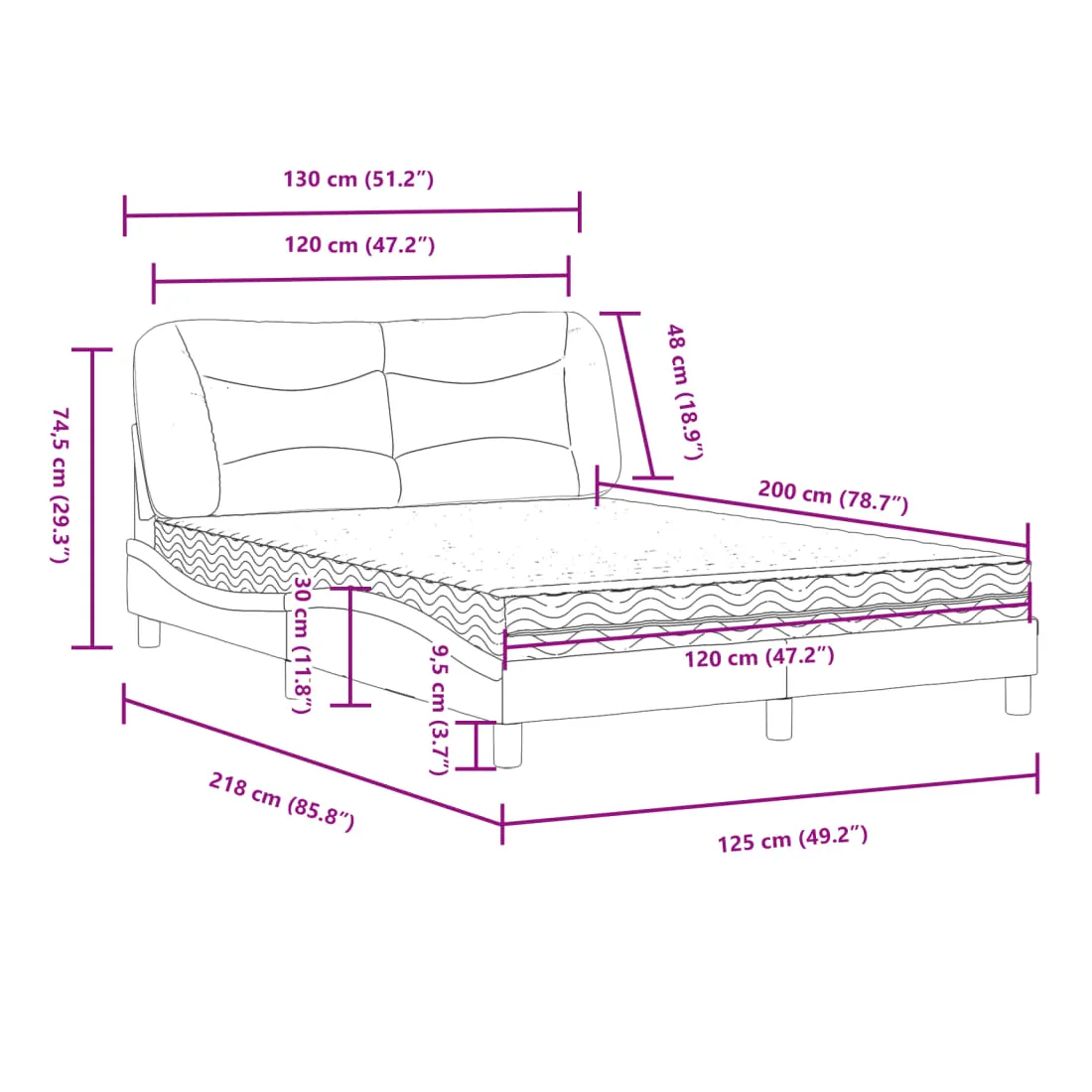 - Dimensions totales : 218 x 125 x 74,5 cm (L x l x H)