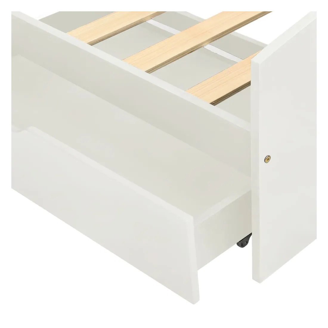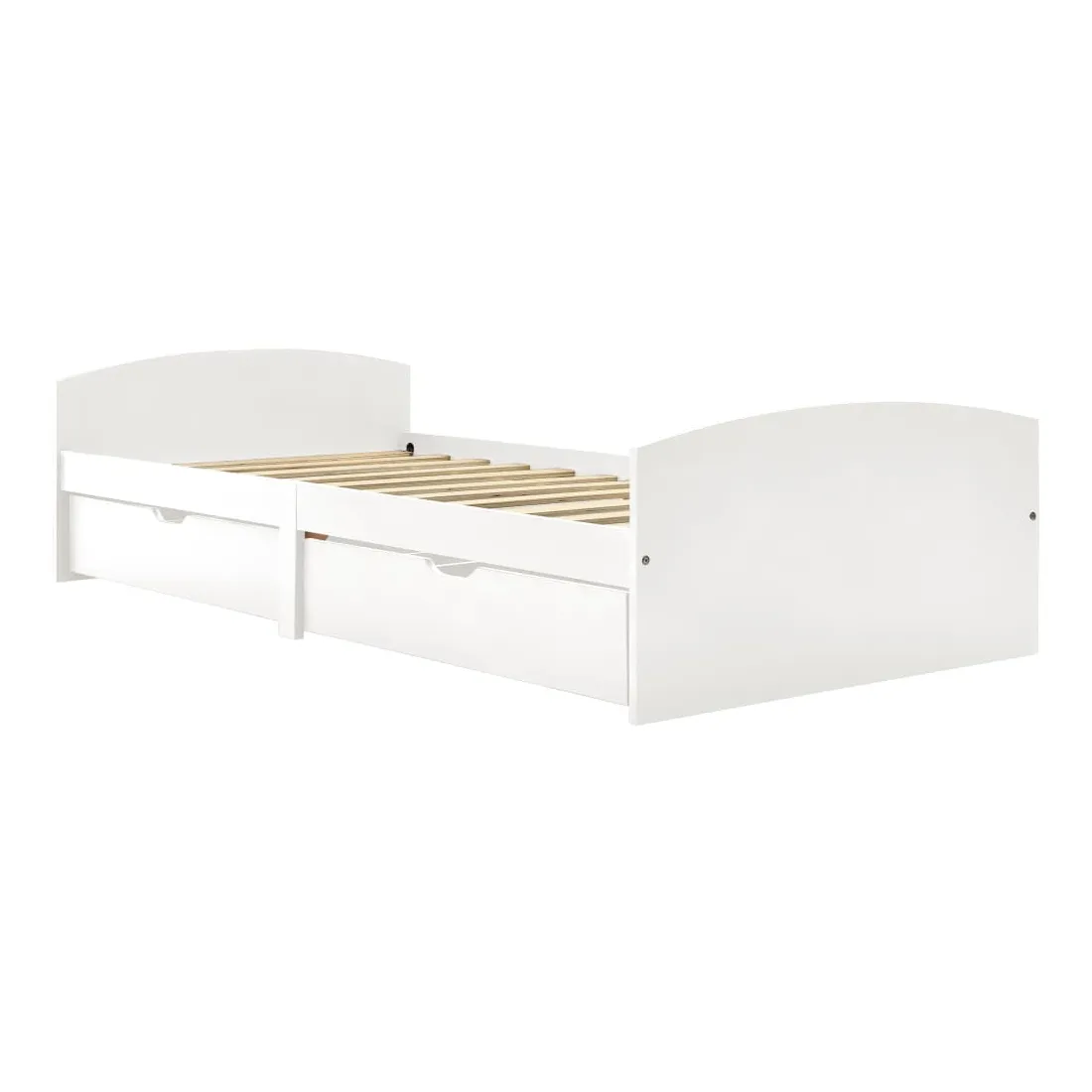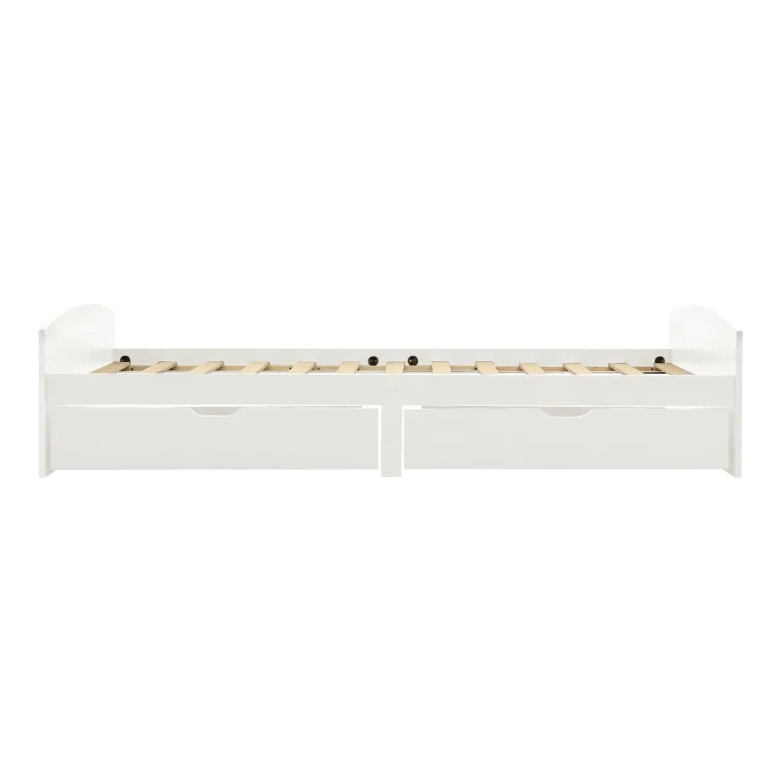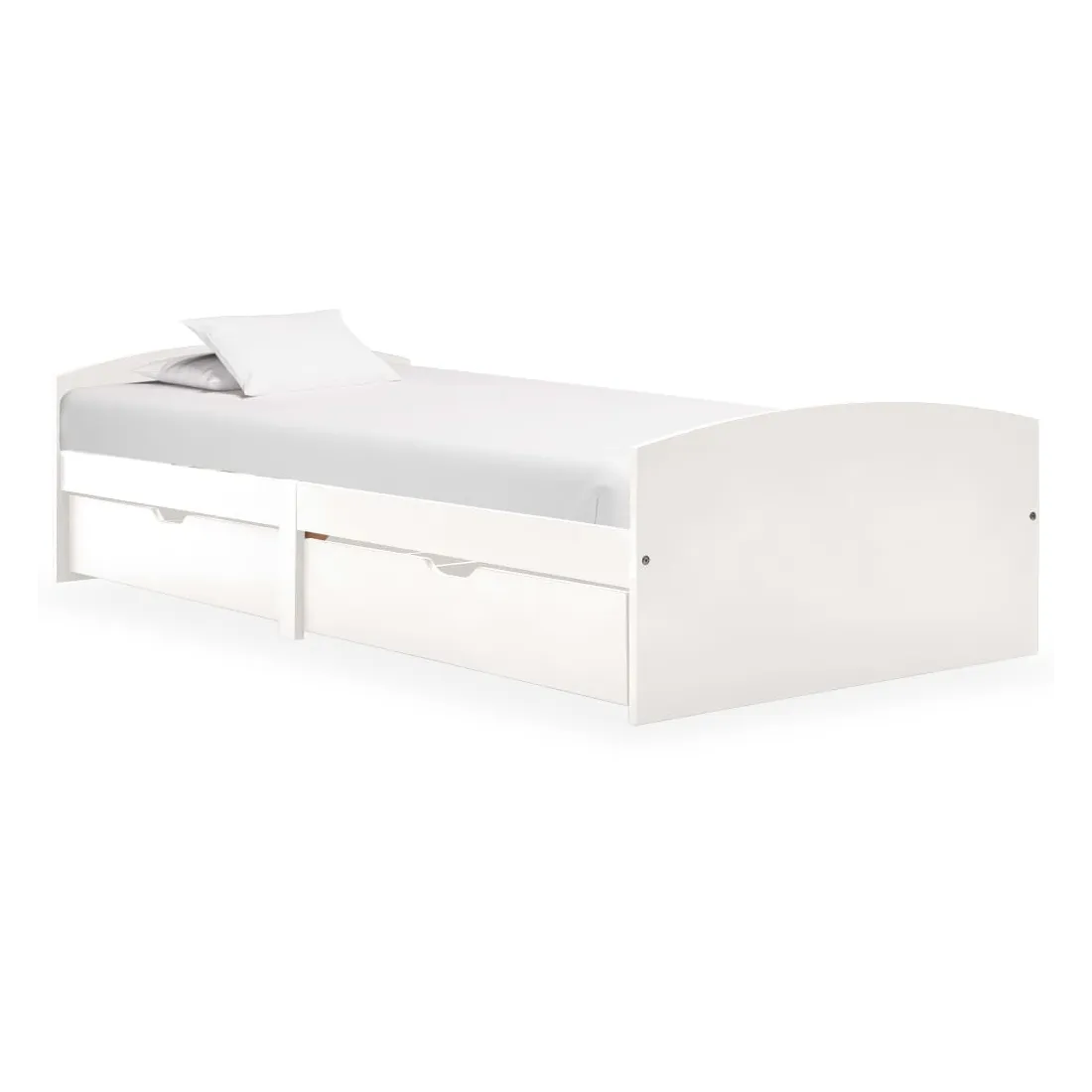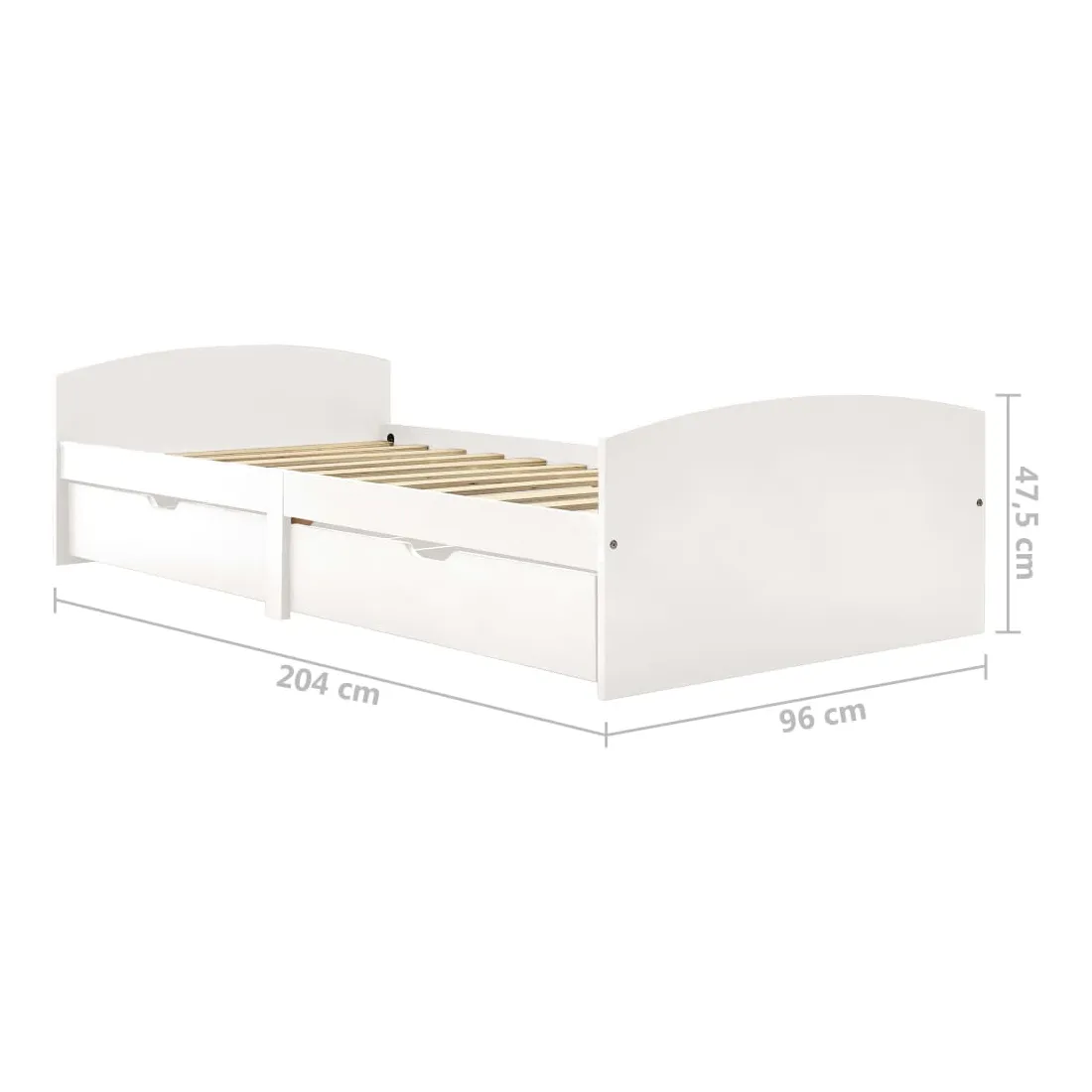 Ce cadre de lit en bois avec tiroirs est un supplément pratique et décoratif à la décoration de toute chambre à coucher. Ce cadre de lit, fabriqué en bois de pin massif, est extrêmement robuste et durable. Les lattes robustes offrent le soutien nécessaire et sont également très confortables. Les 2 tiroirs de lit inclus offrent un grand espace de rangement pour les vêtements pliés, les jouets, etc. et permettent de garder votre pièce propre et bien rangée. Les roues à glissement facile peuvent être utilisées sur des sols en bois ou avec moquette. Avec toutes ces caractéristiques combinées, vous pouvez passer une bonne nuit de sommeil ! Veuillez noter que la livraison inclut un cadre de lit avec un sommier à lattes. Le matelas n'est pas inclus. Vous pouvez chercher le matelas correspondant dans notre boutique.