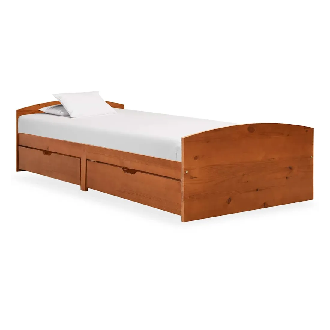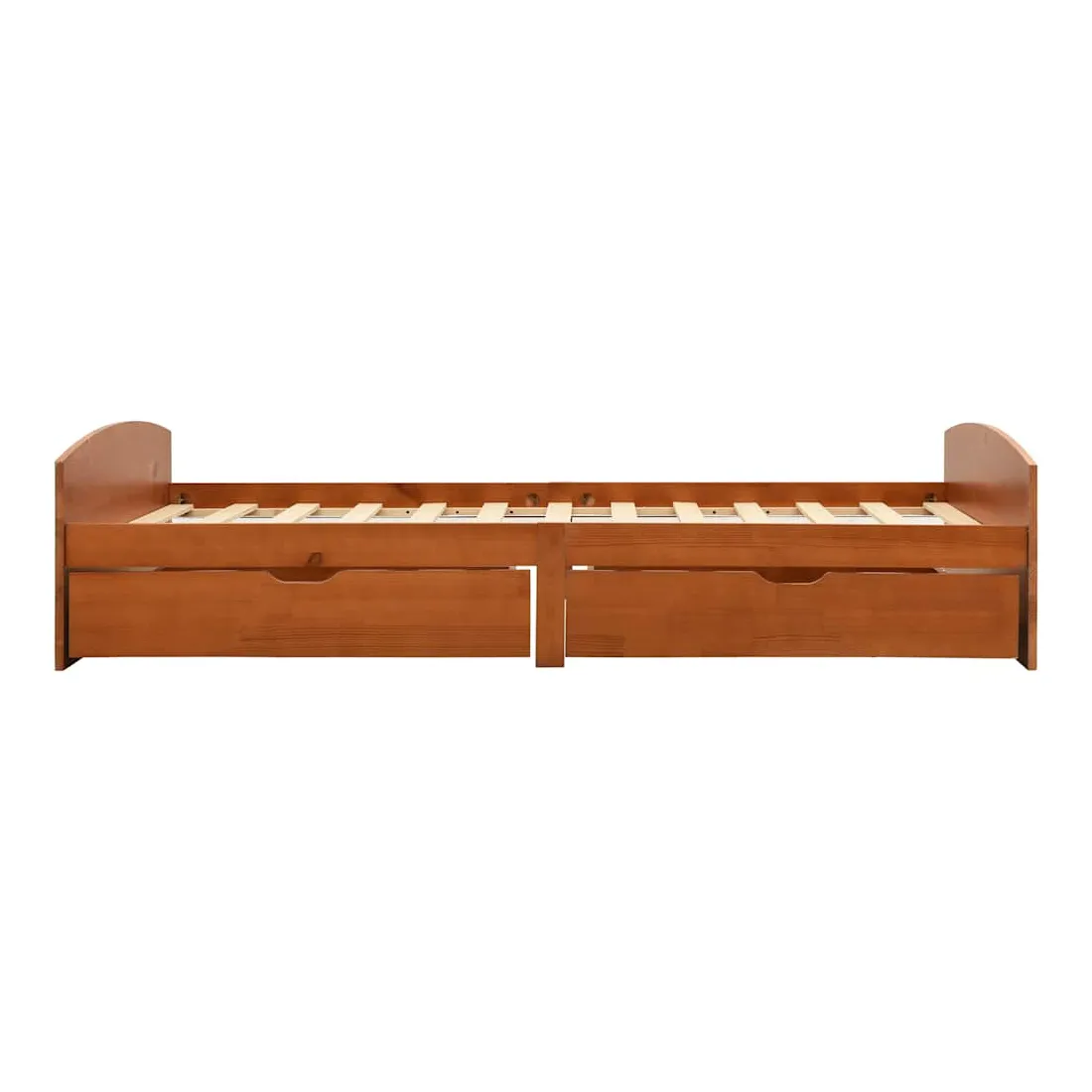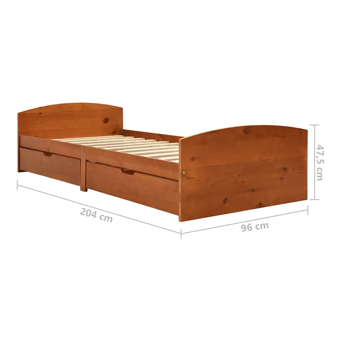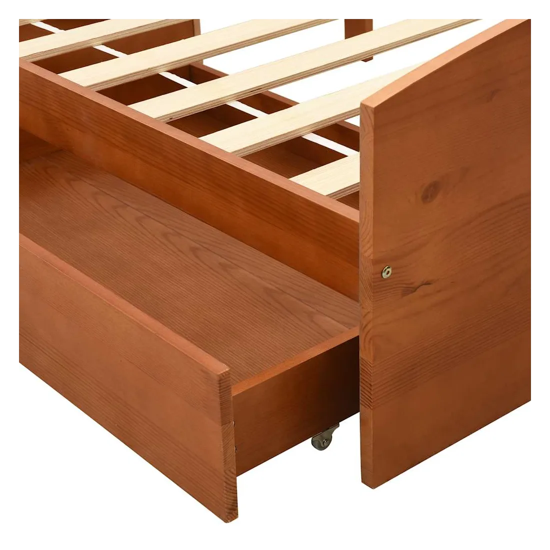 Ce cadre de lit en bois avec tiroirs est un supplément pratique et décoratif à la décoration de toute chambre à coucher. Ce cadre de lit, fabriqué en bois de pin massif, est extrêmement robuste et durable. Les lattes robustes offrent le soutien nécessaire et sont également très confortables. Les 2 tiroirs de lit inclus offrent un grand espace de rangement pour les vêtements pliés, les jouets, etc. et permettent de garder votre pièce propre et bien rangée. Les roues à glissement facile peuvent être utilisées sur des sols en bois ou avec moquette. Avec toutes ces caractéristiques combinées, vous pouvez passer une bonne nuit de sommeil ! Veuillez noter que la livraison inclut un cadre de lit avec un sommier à lattes. Le matelas n'est pas inclus. Vous pouvez chercher le matelas correspondant dans notre boutique.