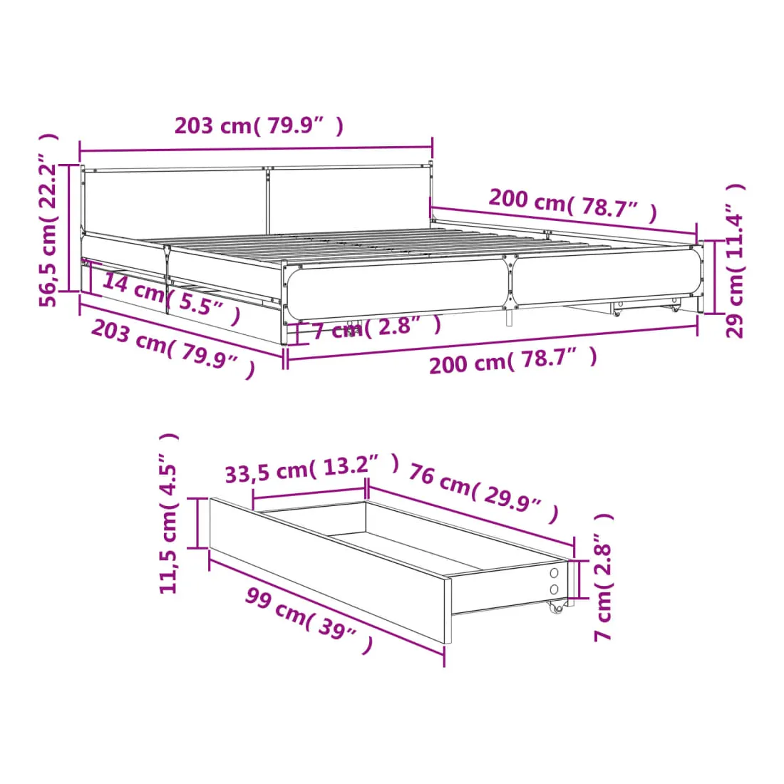 vidaXLObtenez une meilleure nuit de sommeil reposante grâce à ce cadre de lit avec tiroirs ! Il est un supplément accueillant à toute chambre à coucher. Matériau durable : le bois d'ingénierie est d'une qualité exceptionnelle avec une surface lisse et présente également résistance, stabilité et résistance à l'humidité. Pieds en métal : le lit est soutenu par des pieds en métal robustes, qui assurent sa stabilité, sa sécurité et sa fermeté. Lattes de contreplaqué : les lattes de contreplaqué assurent une bonne répartition du poids, garantissant que le matelas reste en place à chaque torsion de votre corps pendant le sommeil. Fonction de rangement : les tiroirs de lit inclus offrent suffisamment d'espace de rangement pour ranger vos articles essentiels, gardant votre pièce propre et bien rangée. Bon à savoir :Un matelas n'est pas inclus avec ce lit. Nous offrons une sélection variée de matelas. Vous pouvez consulter notre boutique pour trouver un matelas assorti.