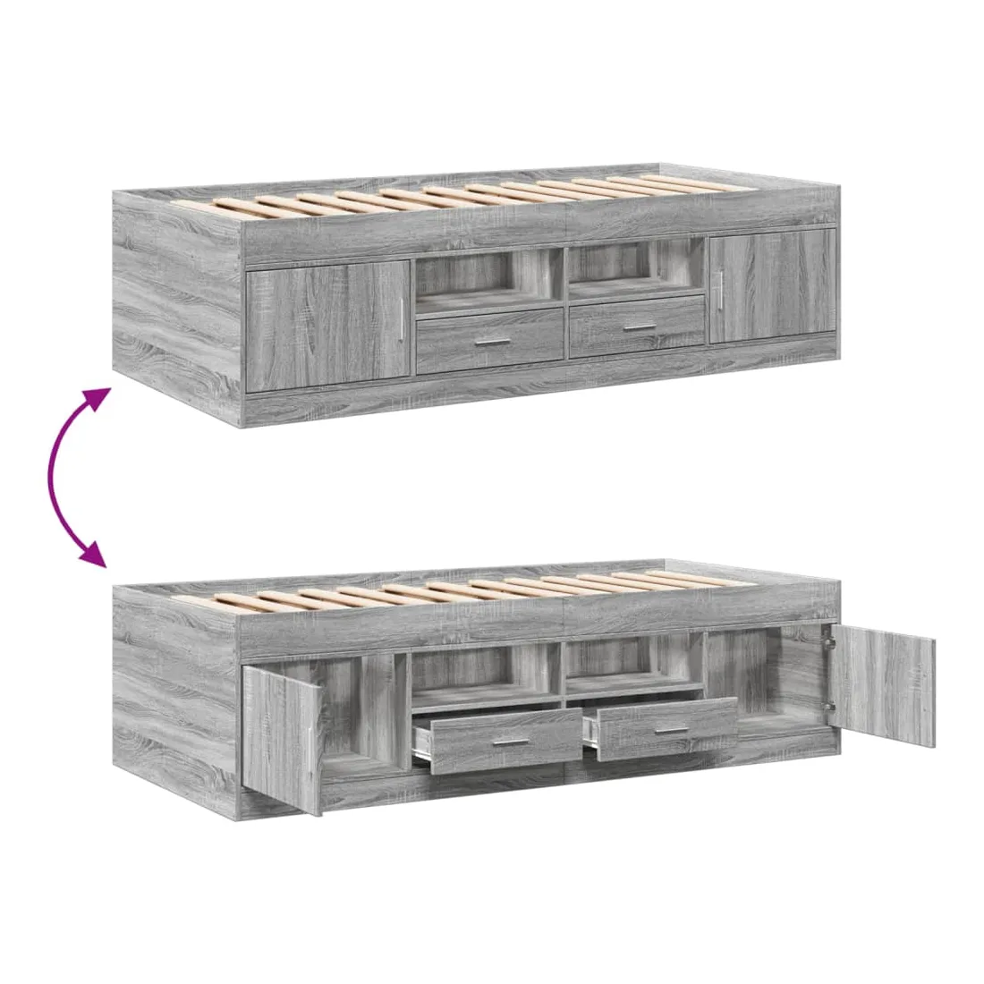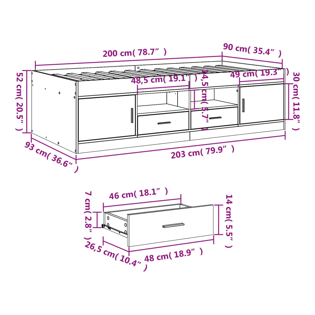 Ce lit de jour polyvalent peut être utilisé non seulement comme lit dans la chambre à coucher, mais aussi comme canapé dans le salon. Il conviendra parfaitement à vos différents besoins, vous offrant beaucoup d'espace pour dormir ou vous reposer. Construction solide : ce canapé-lit est doté d'un cadre robuste en bois d'ingénierie. Le bois d'ingénierie est d'une qualité exceptionnelle avec une surface lisse et se caractérise par sa solidité, sa stabilité et sa résistance à l'humidité.Fonction de rangement : les tiroirs de lit inclus offrent suffisamment d'espace de rangement pour ranger vos articles essentiels, gardant votre pièce propre et bien rangée.Lattes robustes : les lattes de contreplaqué assurent une bonne répartition du poids, garantissant que le matelas reste en place à chaque torsion de votre corps pendant le sommeil. Bon à savoir :Un matelas n'est pas inclus avec ce lit. Nous offrons une sélection variée de matelas. Vous pouvez consulter notre boutique pour trouver un matelas assorti.
