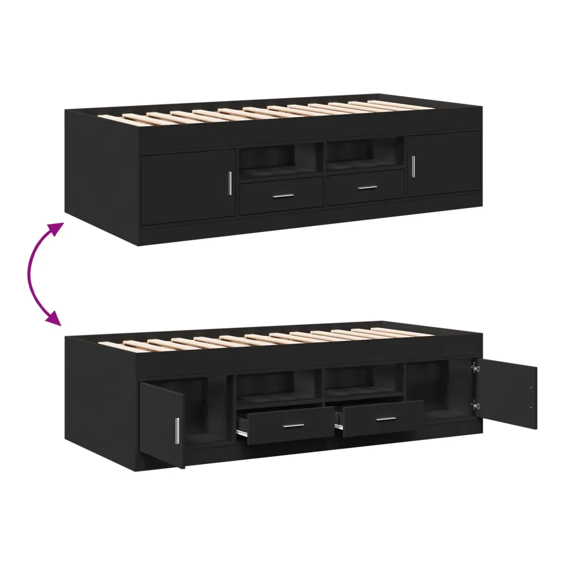 Ce lit de jour polyvalent peut être utilisé non seulement comme lit dans la chambre à coucher, mais aussi comme canapé dans le salon. Il conviendra parfaitement à vos différents besoins, vous offrant beaucoup d'espace pour dormir ou vous reposer. Construction solide : ce canapé-lit est doté d'un cadre robuste en bois d'ingénierie. Le bois d'ingénierie est d'une qualité exceptionnelle avec une surface lisse et se caractérise par sa solidité, sa stabilité et sa résistance à l'humidité.Fonction de rangement : les tiroirs de lit inclus offrent suffisamment d'espace de rangement pour ranger vos articles essentiels, gardant votre pièce propre et bien rangée.Lattes robustes : les lattes de contreplaqué assurent une bonne répartition du poids, garantissant que le matelas reste en place à chaque torsion de votre corps pendant le sommeil. Bon à savoir :Un matelas n'est pas inclus avec ce lit. Nous offrons une sélection variée de matelas. Vous pouvez consulter notre boutique pour trouver un matelas assorti.