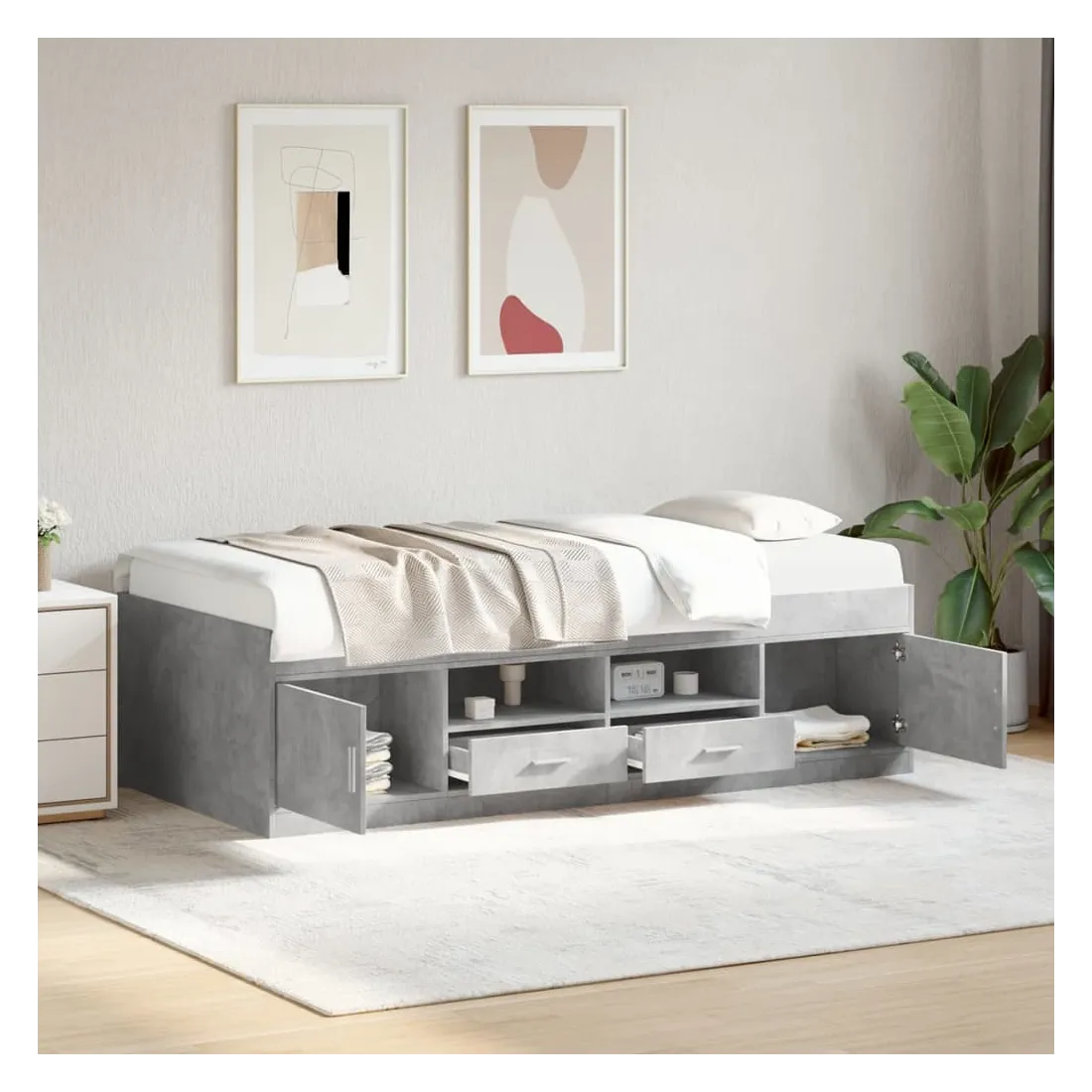 Ce lit de jour polyvalent peut être utilisé non seulement comme lit dans la chambre à coucher, mais aussi comme canapé dans le salon. Il conviendra parfaitement à vos différents besoins, vous offrant beaucoup d'espace pour dormir ou vous reposer. Construction solide : ce canapé-lit est doté d'un cadre robuste en bois d'ingénierie. Le bois d'ingénierie est d'une qualité exceptionnelle avec une surface lisse et se caractérise par sa solidité, sa stabilité et sa résistance à l'humidité.Fonction de rangement : les tiroirs de lit inclus offrent suffisamment d'espace de rangement pour ranger vos articles essentiels, gardant votre pièce propre et bien rangée.Lattes robustes : les lattes de contreplaqué assurent une bonne répartition du poids, garantissant que le matelas reste en place à chaque torsion de votre corps pendant le sommeil. Bon à savoir :Un matelas n'est pas inclus avec ce lit. Nous offrons une sélection variée de matelas. Vous pouvez consulter notre boutique pour trouver un matelas assorti.