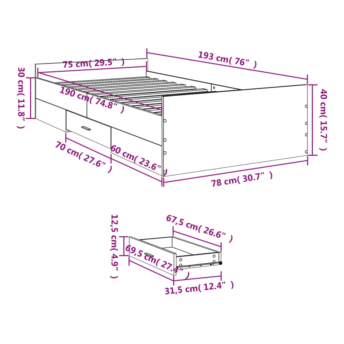 - Dimensions des tiroirs de lit (chacun) : 69,5 x 31,5 x 12,5 cm (L x l x H)