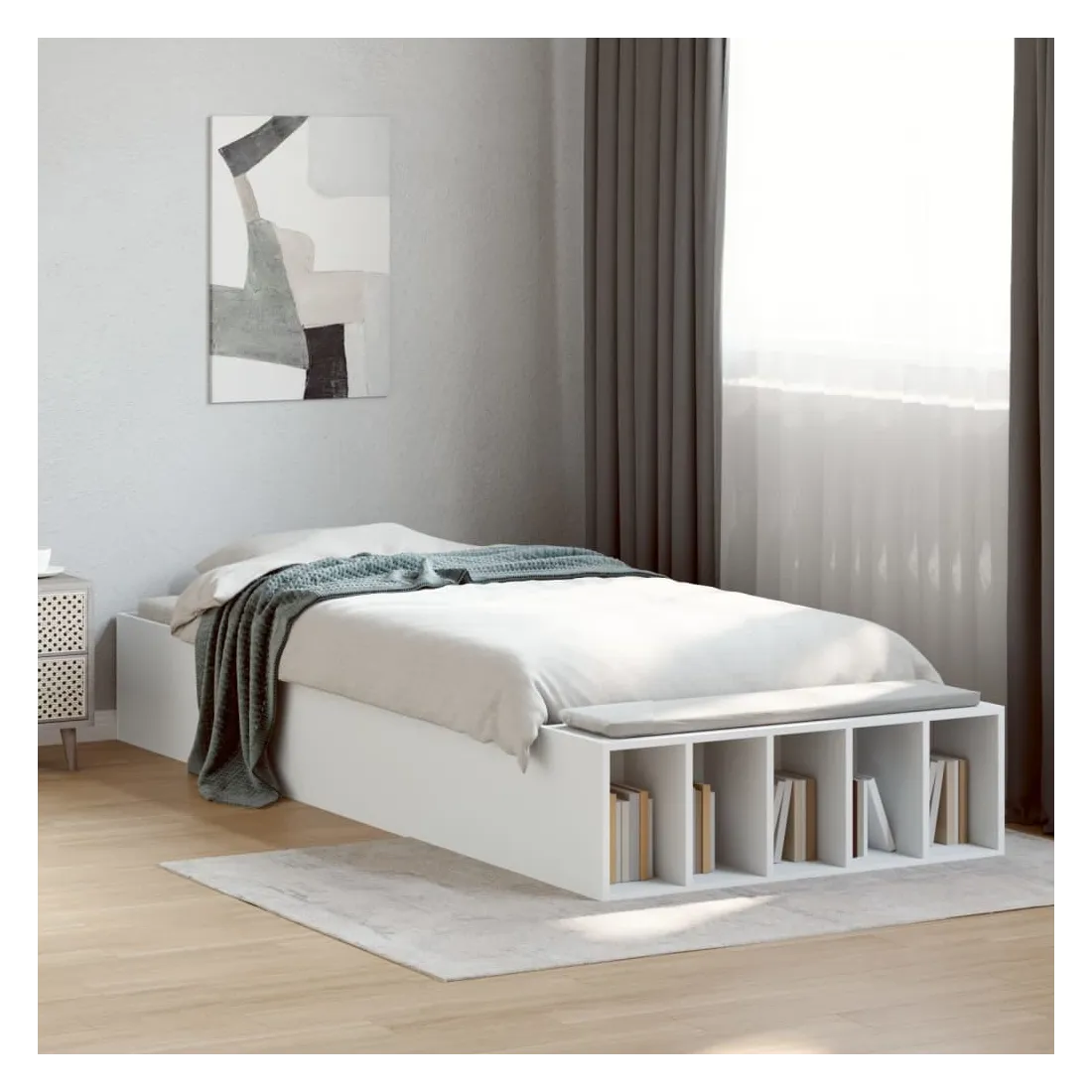 Ajoutez une touche moderne à votre chambre à coucher avec ce cadre de lit ! Il apportera une touche pratique et décorative à votre espace de vie. Matériau durable : le cadre de lit est fabriquée en bois d'ingénierie. Le bois d'ingénierie est d'une qualité exceptionnelle avec une surface lisse et présente également de la résistance, de la stabilité et de la résistance à l'humidité.Lattes robustes : les lattes de contreplaqué assurent une bonne répartition du poids, garantissant que le matelas reste en place à chaque torsion de votre corps pendant le sommeil.Fonction de rangement : les compartiments de lit inclus offrent un grand espace de rangement pour ranger vos articles essentiels, gardant votre chambre propre et bien rangée. Bon à savoir :Un matelas n'est pas inclus avec ce lit. Nous offrons une sélection variée de matelas. Vous pouvez consulter notre boutique pour trouver un matelas assorti.