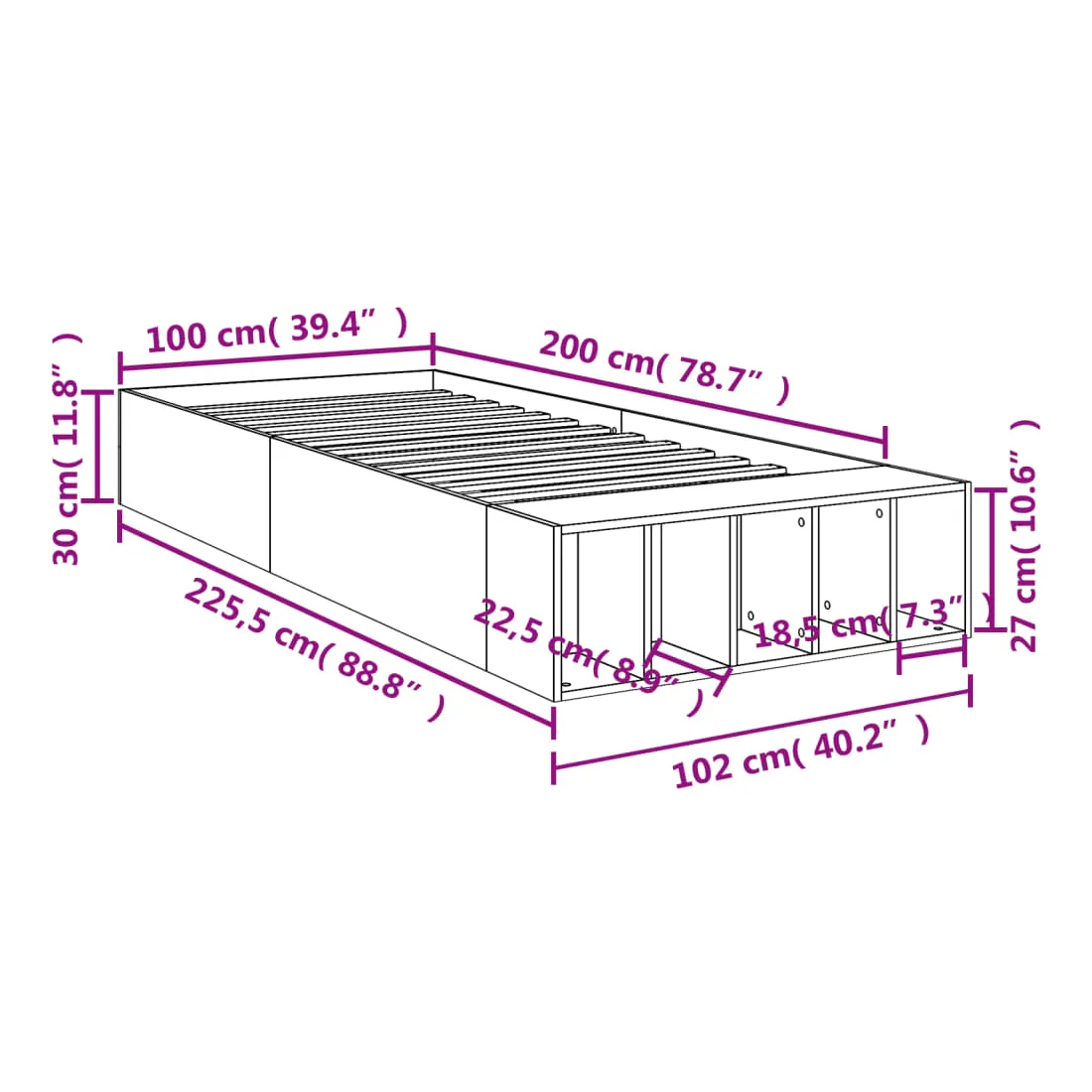 - Dimensions totales : 225,5 x 102 x 30 cm (L x l x H)