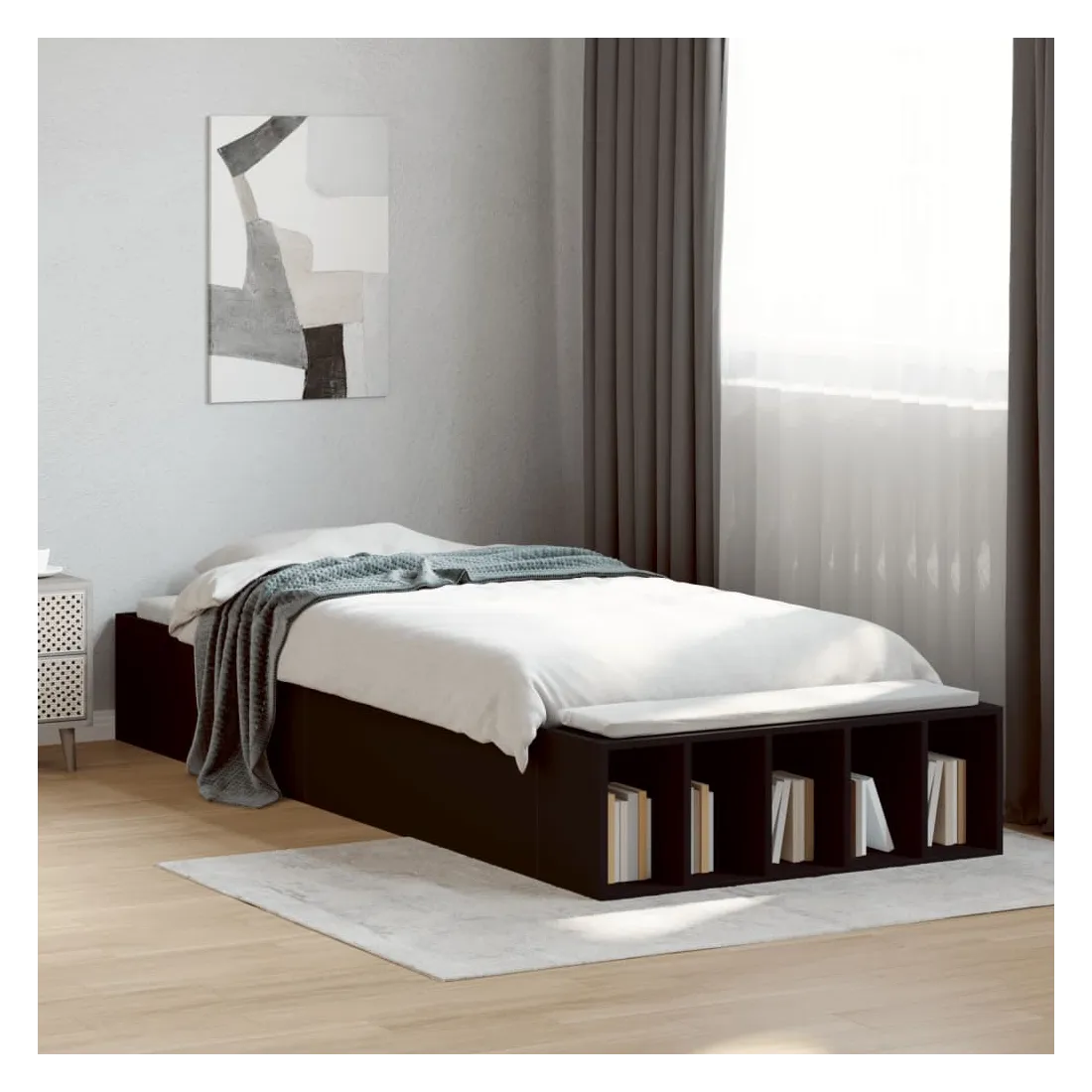 Ajoutez une touche moderne à votre chambre à coucher avec ce cadre de lit ! Il apportera une touche pratique et décorative à votre espace de vie. Matériau durable : le cadre de lit est fabriquée en bois d'ingénierie. Le bois d'ingénierie est d'une qualité exceptionnelle avec une surface lisse et présente également de la résistance, de la stabilité et de la résistance à l'humidité.Lattes robustes : les lattes de contreplaqué assurent une bonne répartition du poids, garantissant que le matelas reste en place à chaque torsion de votre corps pendant le sommeil.Fonction de rangement : les compartiments de lit inclus offrent un grand espace de rangement pour ranger vos articles essentiels, gardant votre chambre propre et bien rangée. Bon à savoir :Un matelas n'est pas inclus avec ce lit. Nous offrons une sélection variée de matelas. Vous pouvez consulter notre boutique pour trouver un matelas assorti.