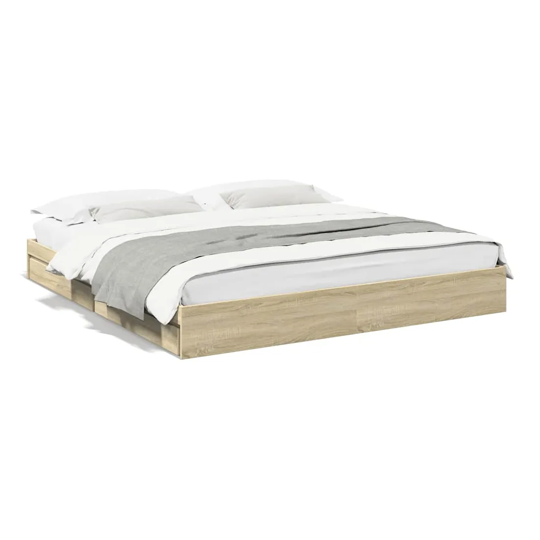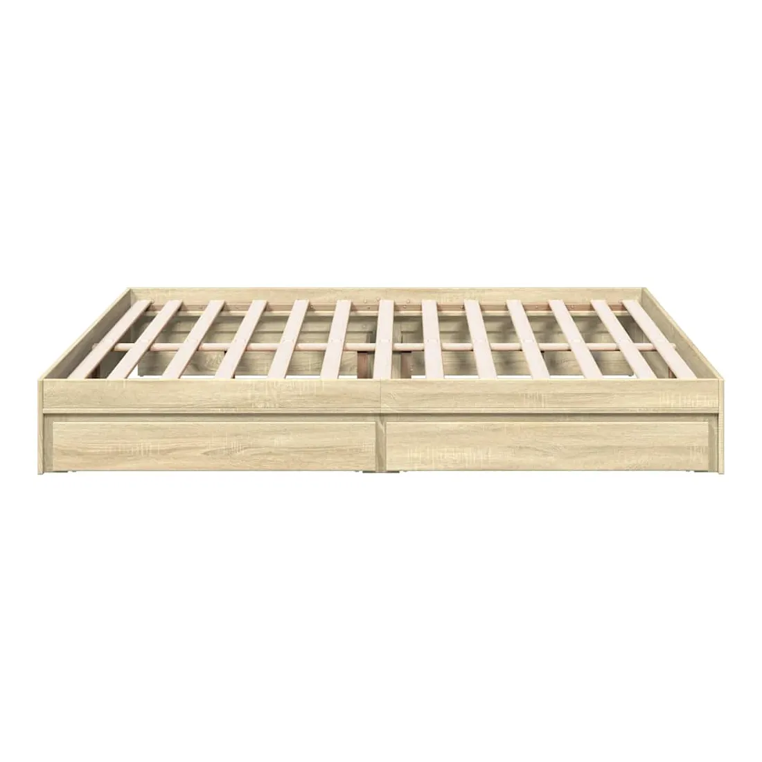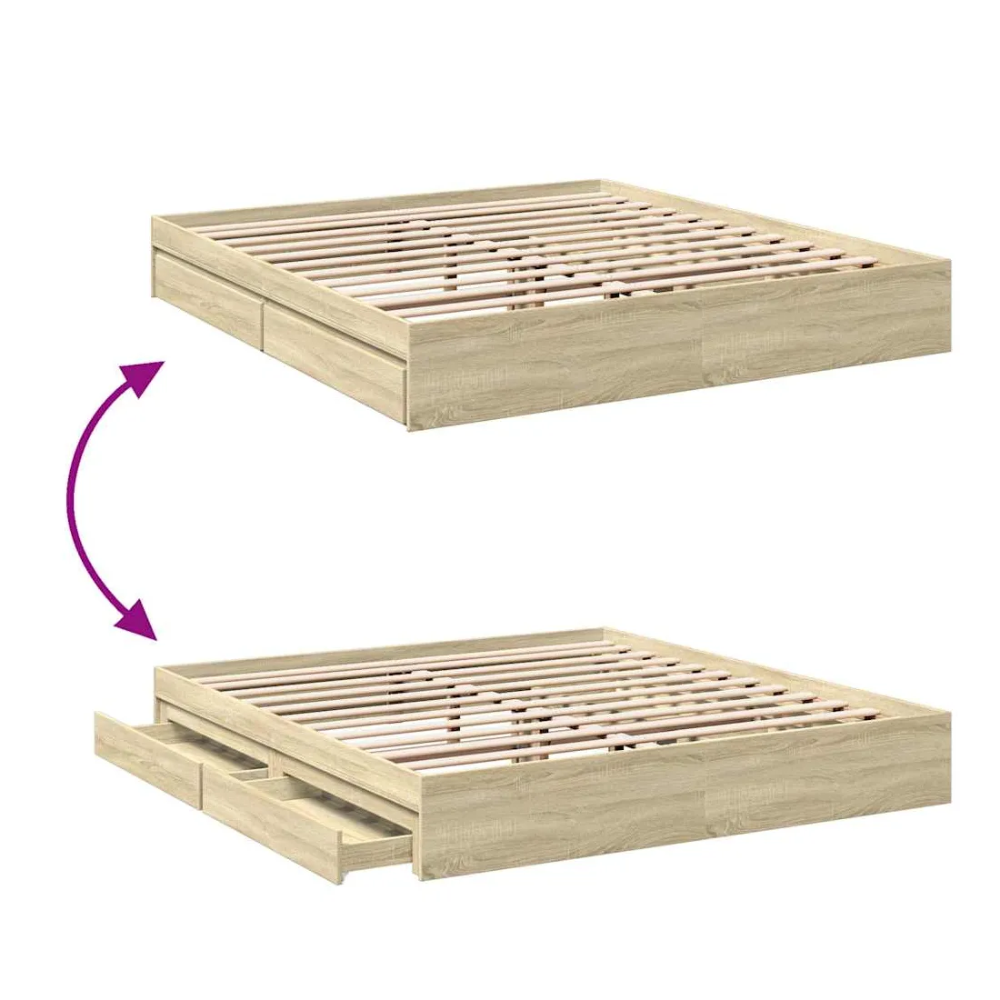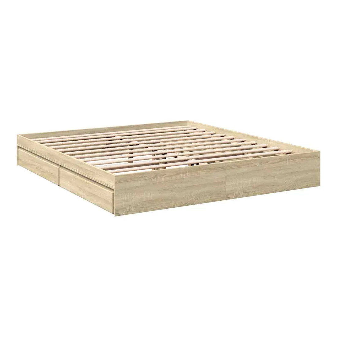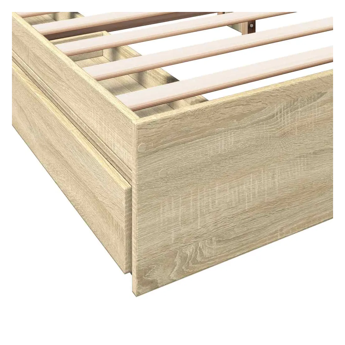 Ajoutez une touche moderne à votre chambre à coucher avec ce cadre de lit avec tiroirs ! Il apportera une touche pratique et décorative à votre espace de vie. Matériau durable : le cadre de lit est fabriquée en bois d'ingénierie. Le bois d'ingénierie est d'une qualité exceptionnelle avec une surface lisse et présente également de la résistance, de la stabilité et de la résistance à l'humidité.Lattes robustes : les lattes de contreplaqué assurent une bonne répartition du poids, garantissant que le matelas reste en place à chaque torsion de votre corps pendant le sommeil.Fonction de rangement : les tiroirs de lit inclus offrent suffisamment d'espace de rangement pour ranger vos articles essentiels, gardant votre pièce propre et bien rangée. Bon à savoir :Un matelas n'est pas inclus avec ce lit. Nous offrons une sélection variée de matelas. Vous pouvez consulter notre boutique pour trouver un matelas assorti.