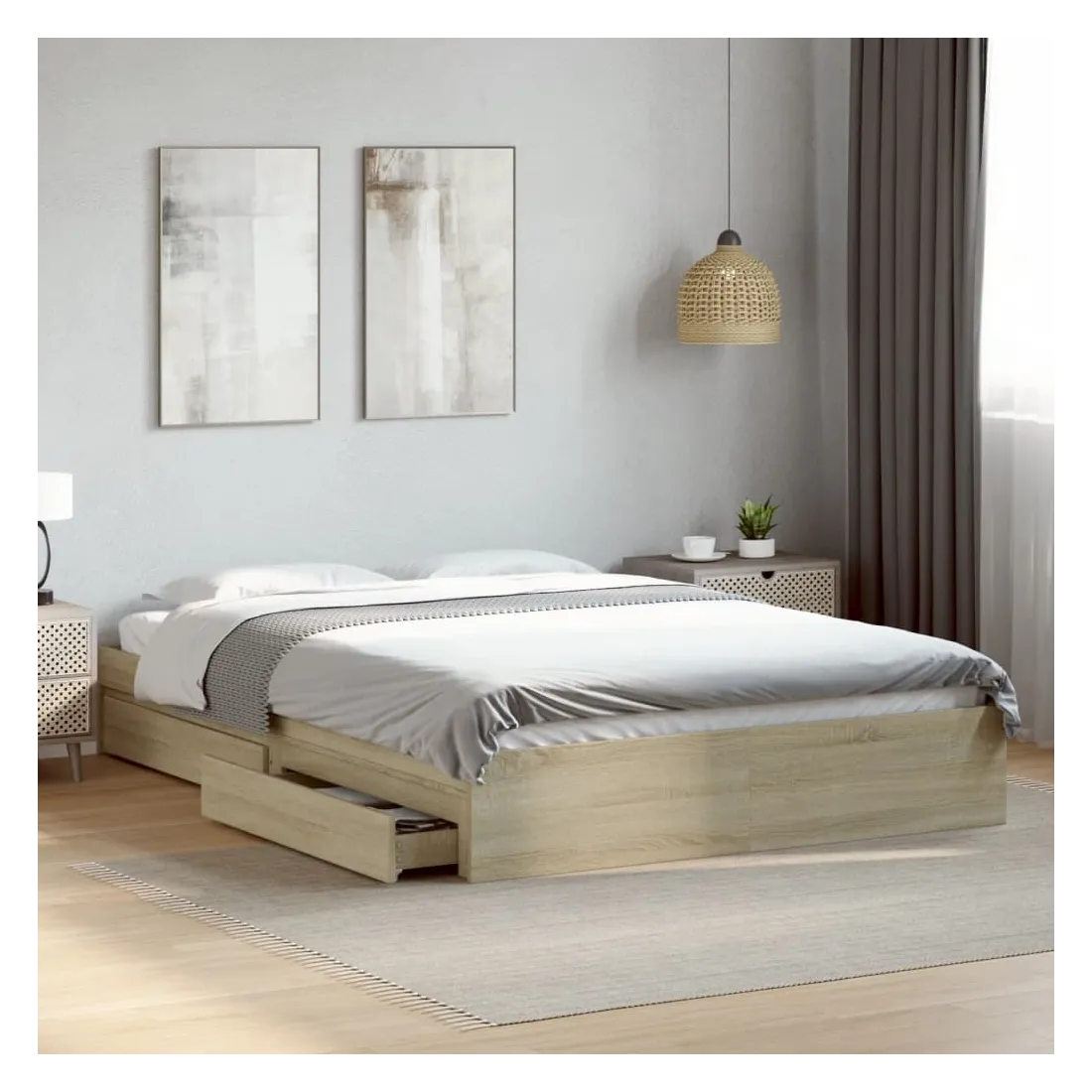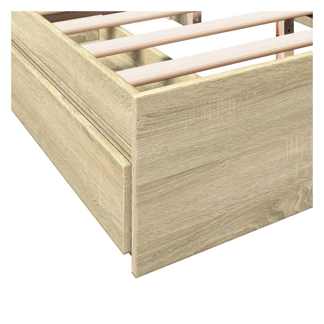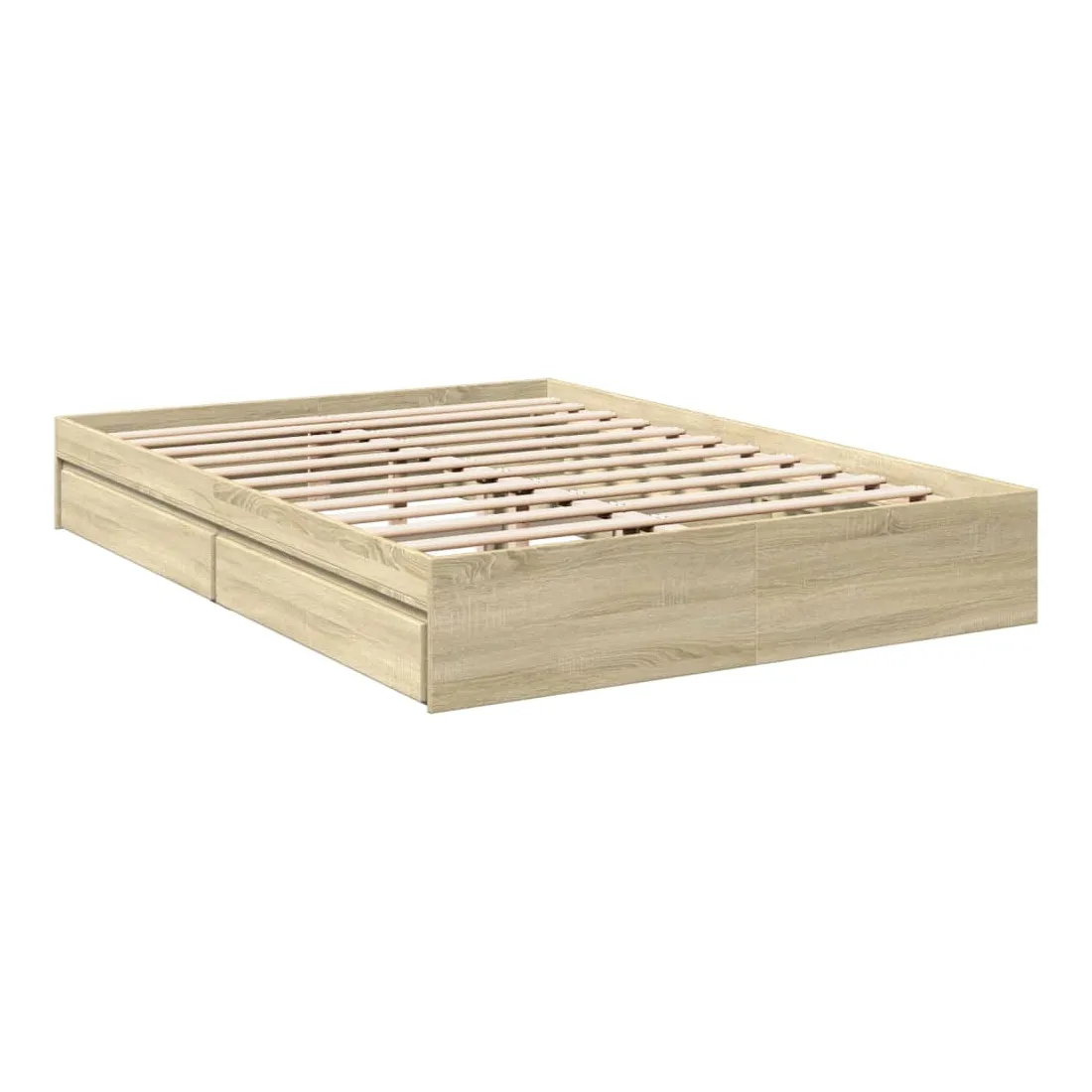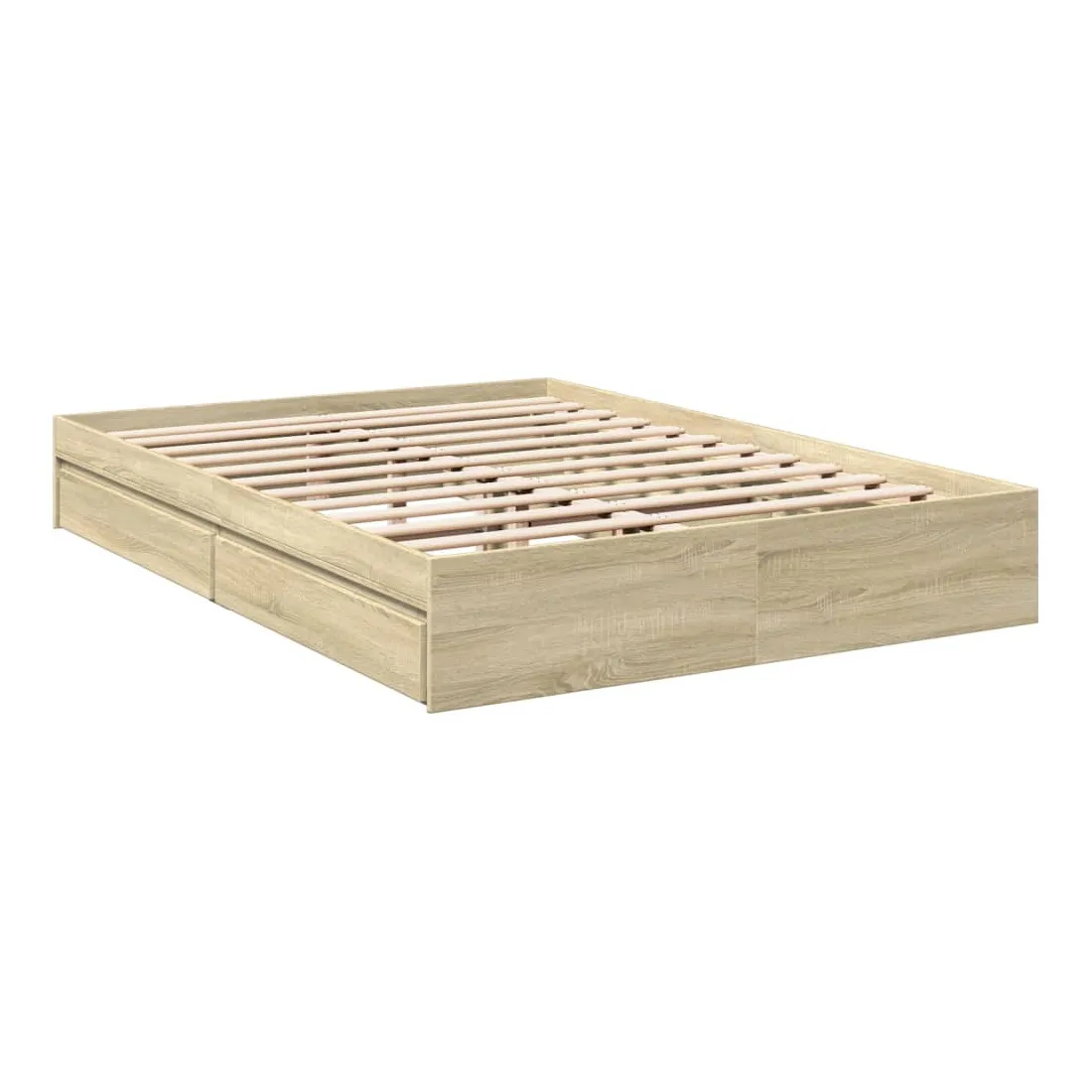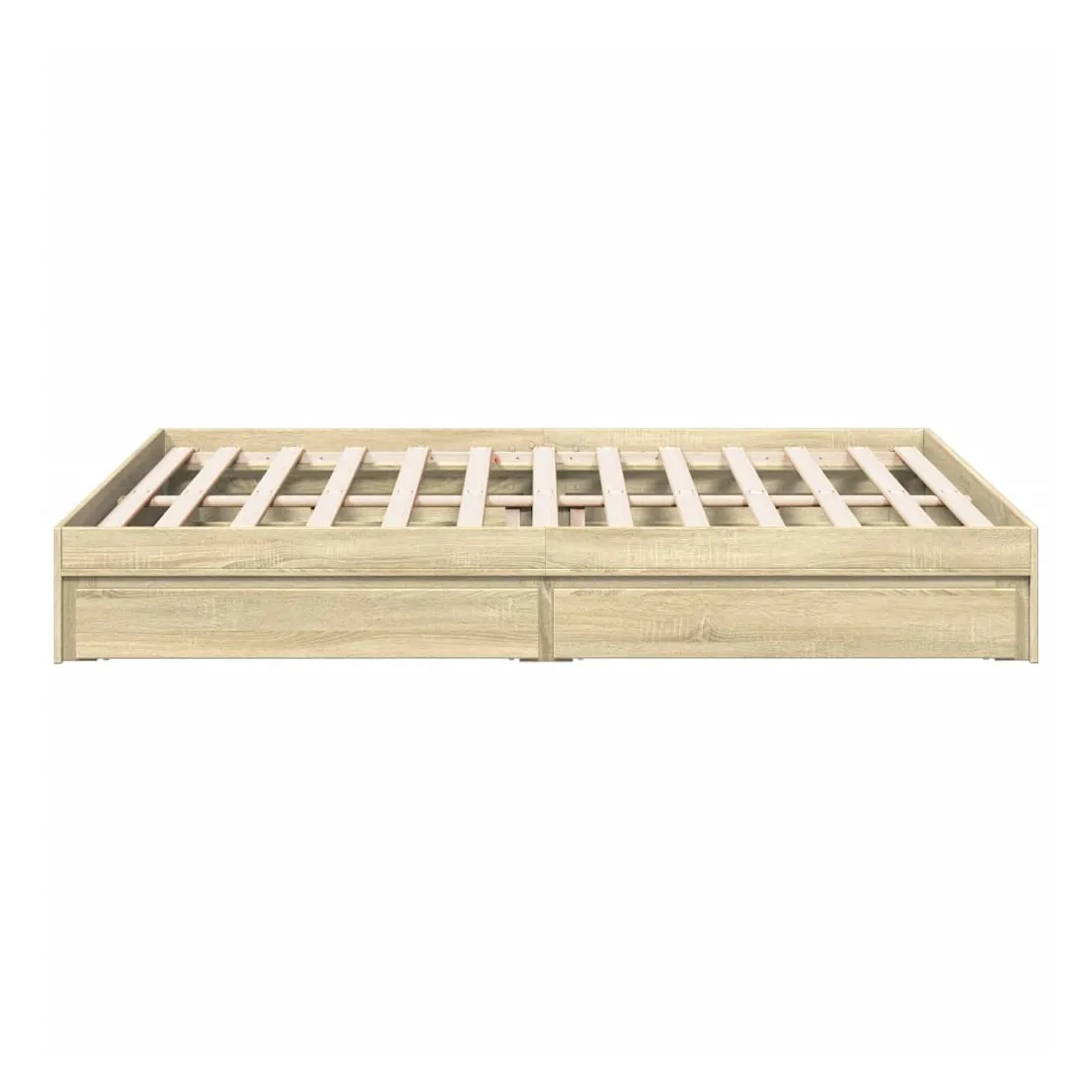 Ajoutez une touche moderne à votre chambre à coucher avec ce cadre de lit avec tiroirs ! Il apportera une touche pratique et décorative à votre espace de vie. Matériau durable : le cadre de lit est fabriquée en bois d'ingénierie. Le bois d'ingénierie est d'une qualité exceptionnelle avec une surface lisse et présente également de la résistance, de la stabilité et de la résistance à l'humidité.Lattes robustes : les lattes de contreplaqué assurent une bonne répartition du poids, garantissant que le matelas reste en place à chaque torsion de votre corps pendant le sommeil.Fonction de rangement : les tiroirs de lit inclus offrent suffisamment d'espace de rangement pour ranger vos articles essentiels, gardant votre pièce propre et bien rangée. Bon à savoir :Un matelas n'est pas inclus avec ce lit. Nous offrons une sélection variée de matelas. Vous pouvez consulter notre boutique pour trouver un matelas assorti.