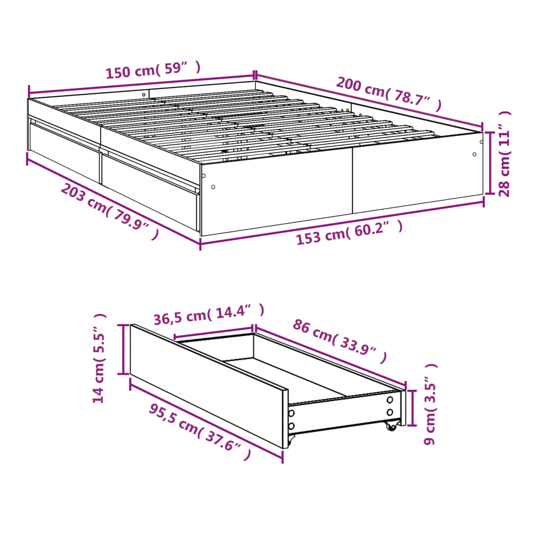 Ajoutez une touche moderne à votre chambre à coucher avec ce cadre de lit avec tiroirs ! Il apportera une touche pratique et décorative à votre espace de vie. Matériau durable : le cadre de lit est fabriquée en bois d'ingénierie. Le bois d'ingénierie est d'une qualité exceptionnelle avec une surface lisse et présente également de la résistance, de la stabilité et de la résistance à l'humidité.Lattes robustes : les lattes de contreplaqué assurent une bonne répartition du poids, garantissant que le matelas reste en place à chaque torsion de votre corps pendant le sommeil.Fonction de rangement : les tiroirs de lit inclus offrent suffisamment d'espace de rangement pour ranger vos articles essentiels, gardant votre pièce propre et bien rangée. Bon à savoir :Un matelas n'est pas inclus avec ce lit. Nous offrons une sélection variée de matelas. Vous pouvez consulter notre boutique pour trouver un matelas assorti.