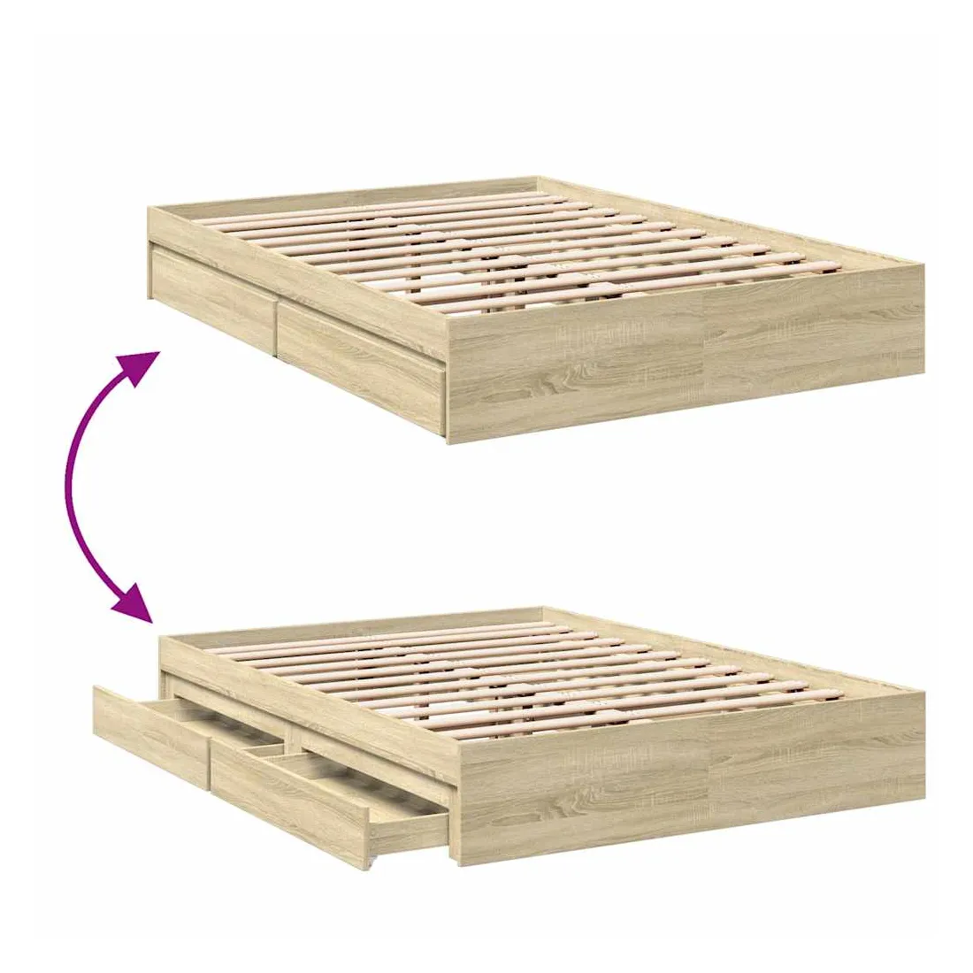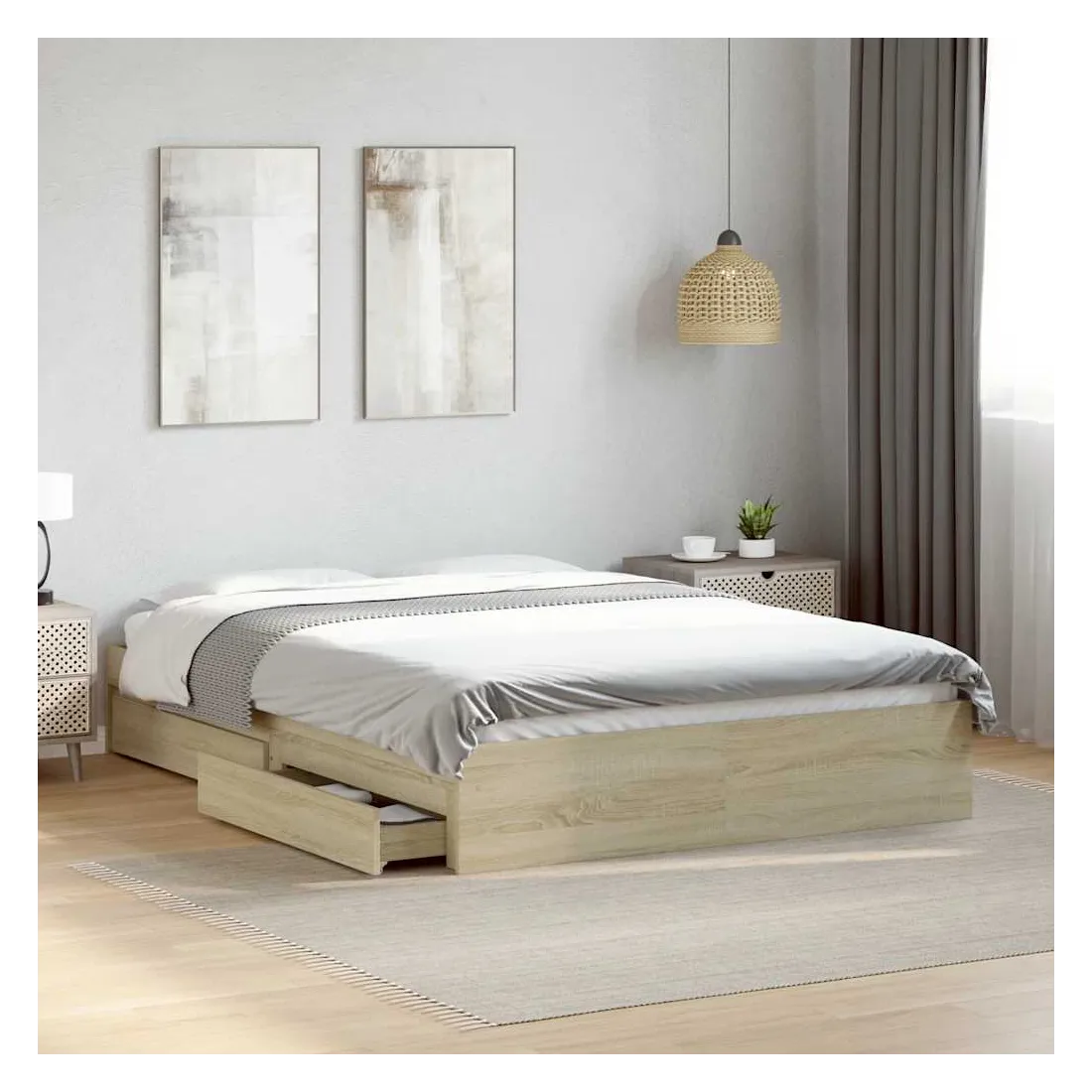 Ajoutez une touche moderne à votre chambre à coucher avec ce cadre de lit avec tiroirs ! Il apportera une touche pratique et décorative à votre espace de vie. Matériau durable : le cadre de lit est fabriquée en bois d'ingénierie. Le bois d'ingénierie est d'une qualité exceptionnelle avec une surface lisse et présente également de la résistance, de la stabilité et de la résistance à l'humidité.Lattes robustes : les lattes de contreplaqué assurent une bonne répartition du poids, garantissant que le matelas reste en place à chaque torsion de votre corps pendant le sommeil.Fonction de rangement : les tiroirs de lit inclus offrent suffisamment d'espace de rangement pour ranger vos articles essentiels, gardant votre pièce propre et bien rangée. Bon à savoir :Un matelas n'est pas inclus avec ce lit. Nous offrons une sélection variée de matelas. Vous pouvez consulter notre boutique pour trouver un matelas assorti.