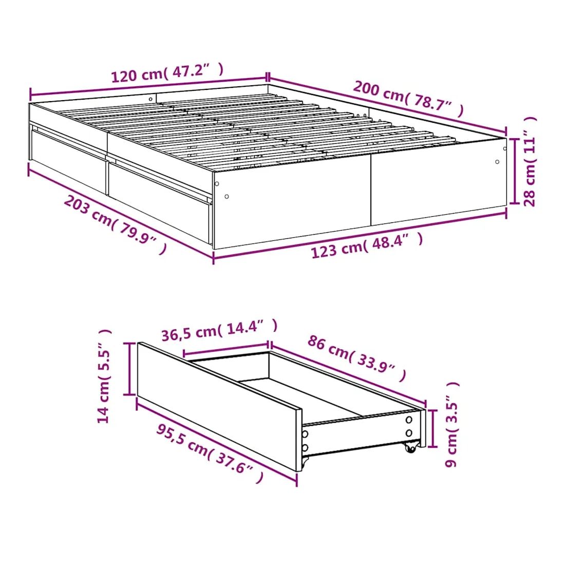 - Dimensions des tiroirs de lit (chacun) : 95,5 x 36,5 x 14 cm (L x l x H)
