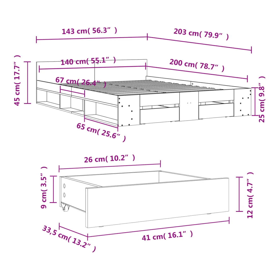 - Dimensions du tiroir de lit (chacun) : 41 x 33,5 x 12 cm (L x l x H)