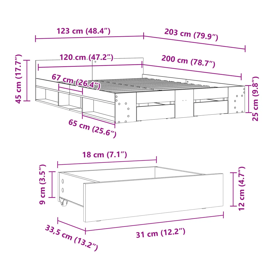 - Dimensions du tiroir de lit : 31 x 33,5 x 12 cm (L x l x H)