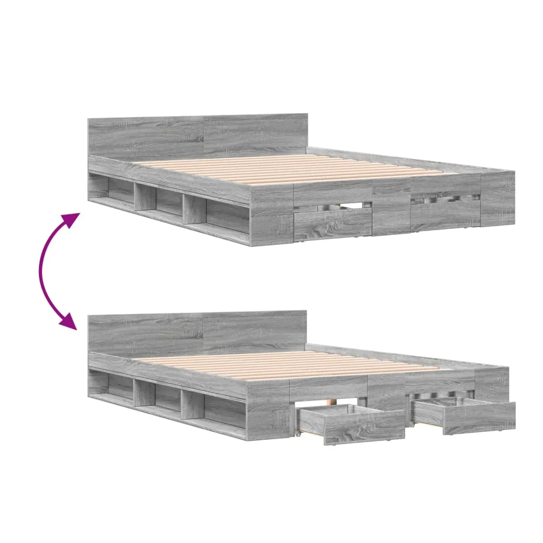 Ajoutez une touche moderne à votre chambre à coucher avec ce cadre de lit avec tiroirs ! Il apportera une touche pratique et décorative à votre espace de vie. Matériau durable : le cadre de lit est fabriquée en bois d'ingénierie. Le bois d'ingénierie est d'une qualité exceptionnelle avec une surface lisse et présente également de la résistance, de la stabilité et de la résistance à l'humidité.Lattes robustes : les lattes de contreplaqué assurent une bonne répartition du poids, garantissant que le matelas reste en place à chaque torsion de votre corps pendant le sommeil.Fonction de rangement : les tiroirs de lit et les compartiments latéraux inclus offrent suffisamment d'espace de rangement pour ranger vos articles essentiels, gardant votre pièce propre et bien rangée. Bon à savoir :Un matelas n'est pas inclus avec ce lit. Nous offrons une sélection variée de matelas. Vous pouvez consulter notre boutique pour trouver un matelas assorti.