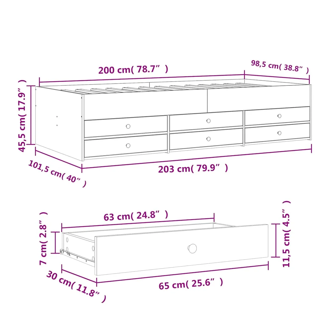 - Dimensions des tiroirs de lit (chacun) : 65 x 30 x 11,5 cm (L x l x H)