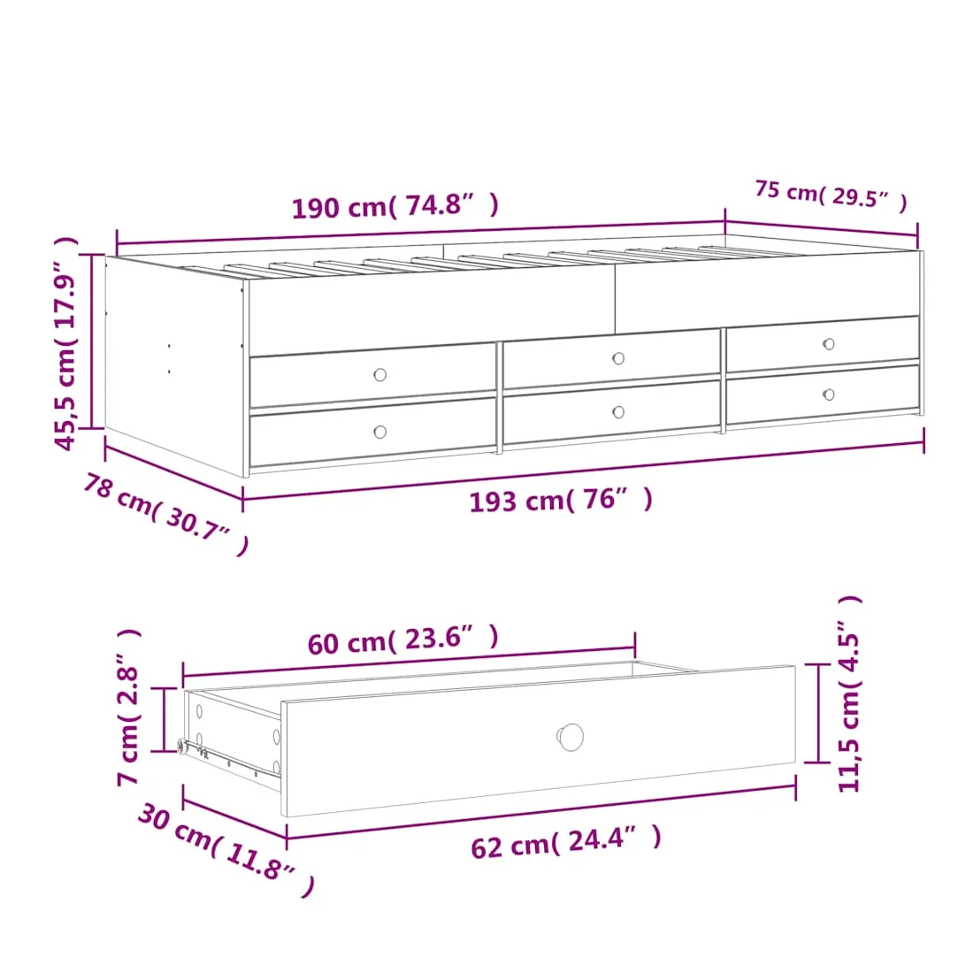 Ce lit de repos 2 en 1 avec tiroirs, servant à la fois de canapé et de lit, constitue un ajout pratique et accrocheur à votre salon ou chambre à coucher. Méridienne polyvalente : Le canapé-lit fait office de canapé le jour ou de lit la nuit, ce qui constitue une solution pratique pour accueillir des invités et optimiser l'espace. Grand espace de rangement : ce lit d'appoint dispose de 6 tiroirs à roulettes qui offrent suffisamment d'espace pour ranger vos vêtements, chaussettes, jouets, coussins, etc.Construction solide : ce canapé-lit est doté d'un cadre robuste en bois d'ingénierie. Le bois d'ingénierie est d'une qualité exceptionnelle avec une surface lisse et se caractérise par sa solidité, sa stabilité et sa résistance à l'humidité. Bon à savoir :La livraison comprend uniquement un cadre de lit de jour. Le matelas n'est pas inclus. Vous pouvez consulter notre boutique pour trouver les matelas assortis.