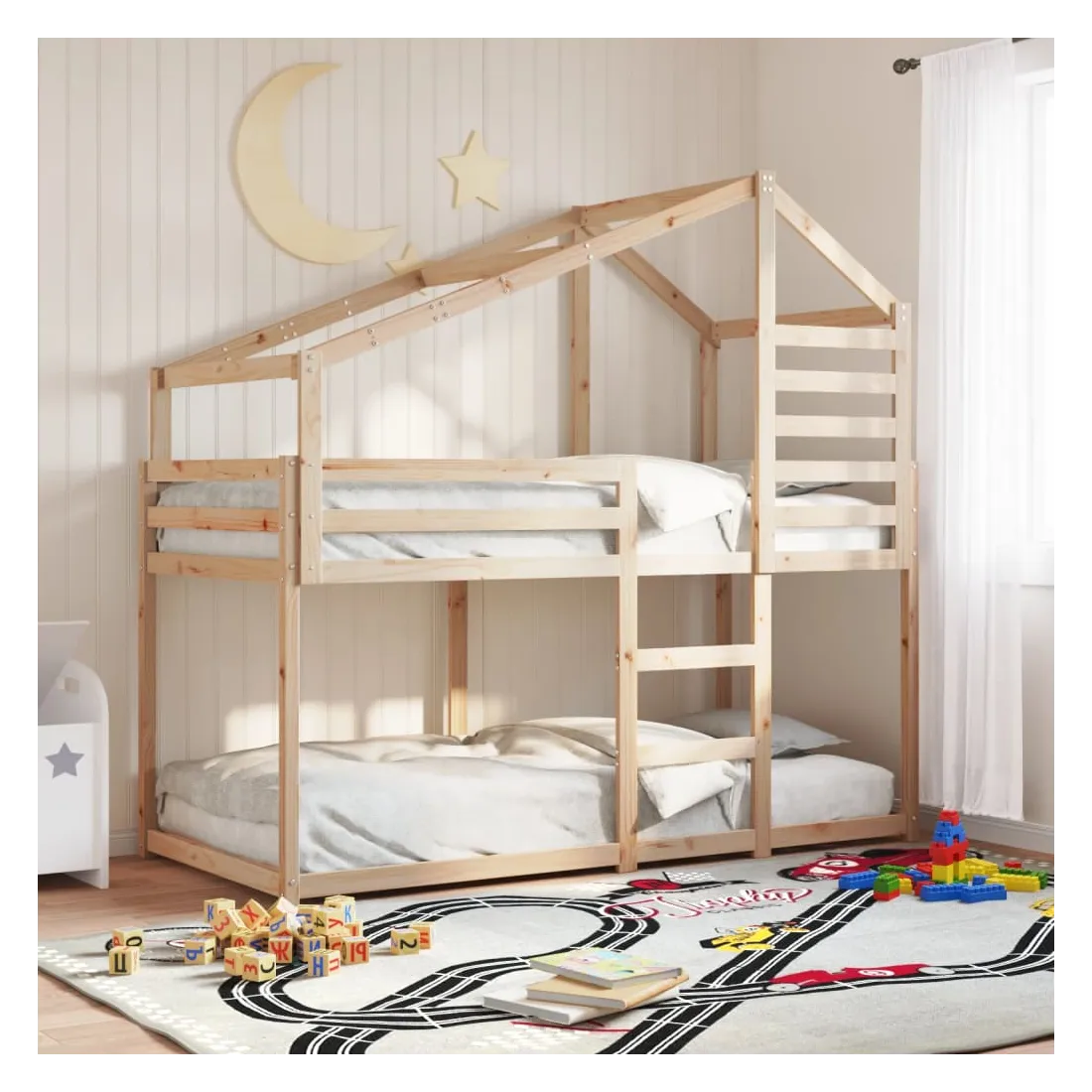 Ce lit superposé pour enfants avec toit est élégant et fonctionnel, ce qui en fait un ajout parfait à toute pièce avec un espace limité. Bois de pin massif : le bois de pin massif est un matériau naturel magnifique. Le bois de pin a un grain droit et les nœuds donnent au matériau son aspect caractéristique et rustique.Design sûr : le lit surélevé est conçu dans un souci de sécurité. Il comprend des garde-corps qui empêchent l'utilisateur de rouler pendant son sommeil.Lattes de contreplaqué : les lattes de contreplaqué assurent une bonne répartition du poids, garantissant que le matelas reste en place à chaque torsion de votre corps pendant le sommeil.Très amusant : en combinant le toit avec le lit de votre enfant, vous pouvez créer une cachette qui permettra à votre enfant de s'amuser à l'heure du coucher. Cette addition innovante non seulement sera un point focal passionnant, mais aussi apportera de la fantaisie et de l'amusement dans la chambre d'enfant.Convient aux espaces limités : le cadre de lit est un excellent choix pour toute pièce dont l'espace est limité, il fournit deux lits individuels avec un design compact.Porte latérale ouverte : le toit est doté d'une porte latérale ouverte qui permet à vos enfants d'entrer et de sortir facilement du lit. Bon à savoir :Un matelas n'est pas inclus avec ce lit. Nous offrons une sélection variée de matelas. Vous pouvez consulter notre boutique pour trouver un matelas assorti.