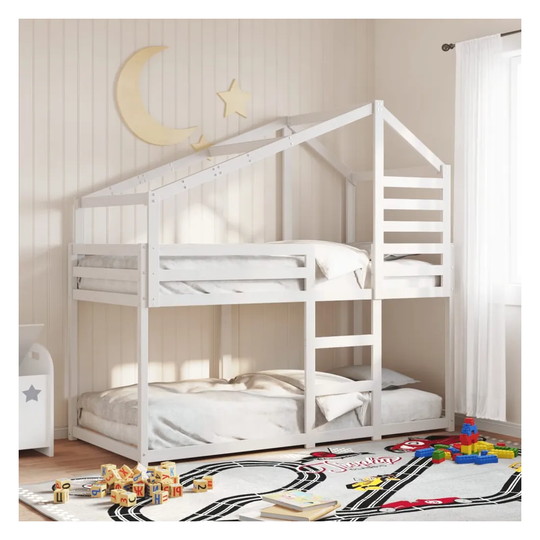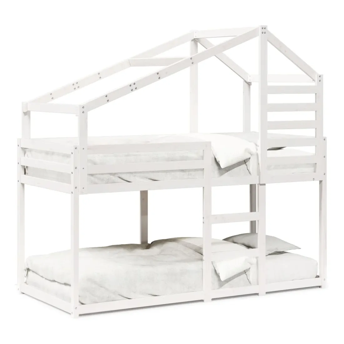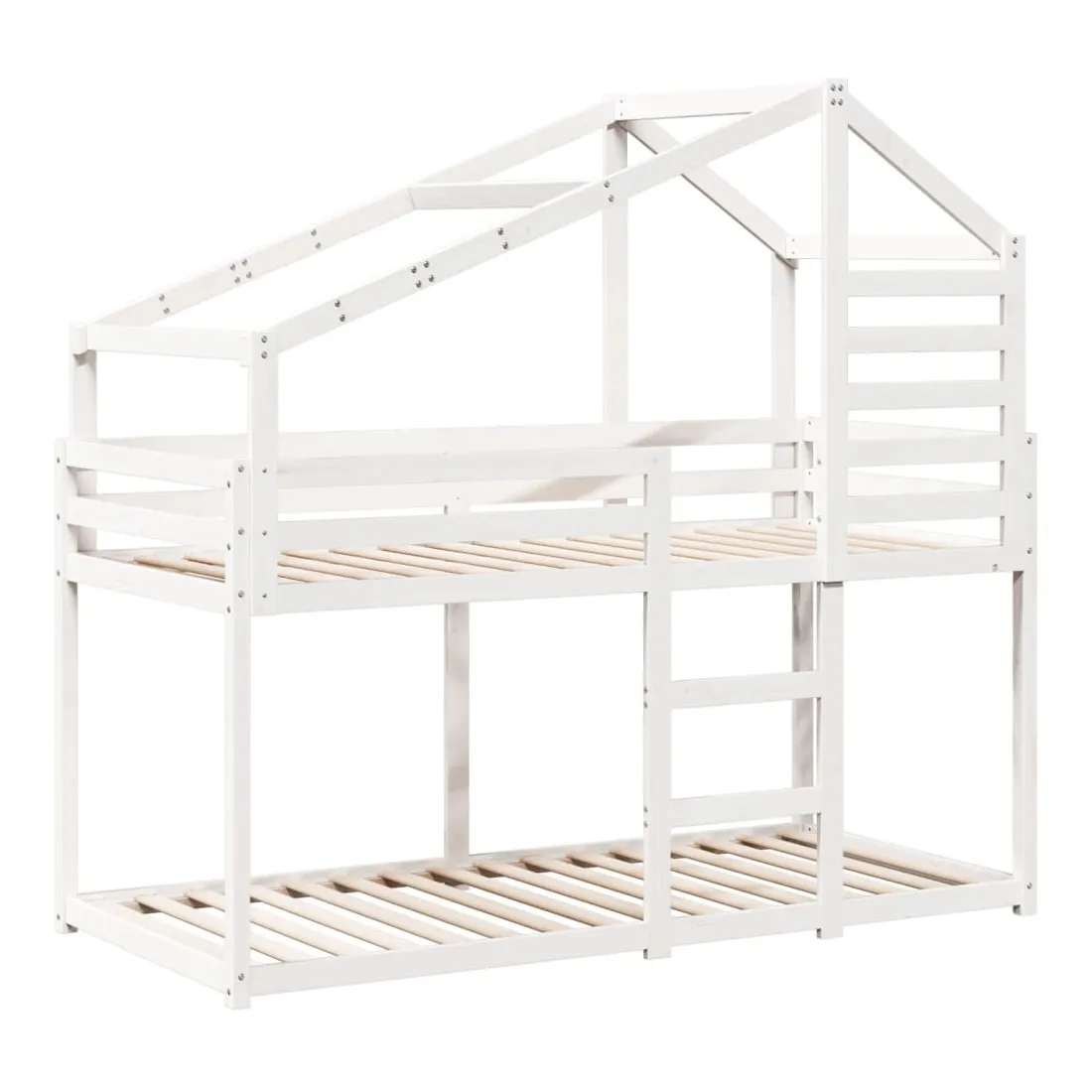 Ce lit superposé pour enfants avec toit est élégant et fonctionnel, ce qui en fait un ajout parfait à toute pièce avec un espace limité. Bois de pin massif : le bois de pin massif est un matériau naturel magnifique. Le bois de pin a un grain droit et les nœuds donnent au matériau son aspect caractéristique et rustique.Design sûr : le lit surélevé est conçu dans un souci de sécurité. Il comprend des garde-corps qui empêchent l'utilisateur de rouler pendant son sommeil.Lattes de contreplaqué : les lattes de contreplaqué assurent une bonne répartition du poids, garantissant que le matelas reste en place à chaque torsion de votre corps pendant le sommeil.Très amusant : en combinant le toit avec le lit de votre enfant, vous pouvez créer une cachette qui permettra à votre enfant de s'amuser à l'heure du coucher. Cette addition innovante non seulement sera un point focal passionnant, mais aussi apportera de la fantaisie et de l'amusement dans la chambre d'enfant.Convient aux espaces limités : le cadre de lit est un excellent choix pour toute pièce dont l'espace est limité, il fournit deux lits individuels avec un design compact.Porte latérale ouverte : le toit est doté d'une porte latérale ouverte qui permet à vos enfants d'entrer et de sortir facilement du lit. Bon à savoir :Un matelas n'est pas inclus avec ce lit. Nous offrons une sélection variée de matelas. Vous pouvez consulter notre boutique pour trouver un matelas assorti.