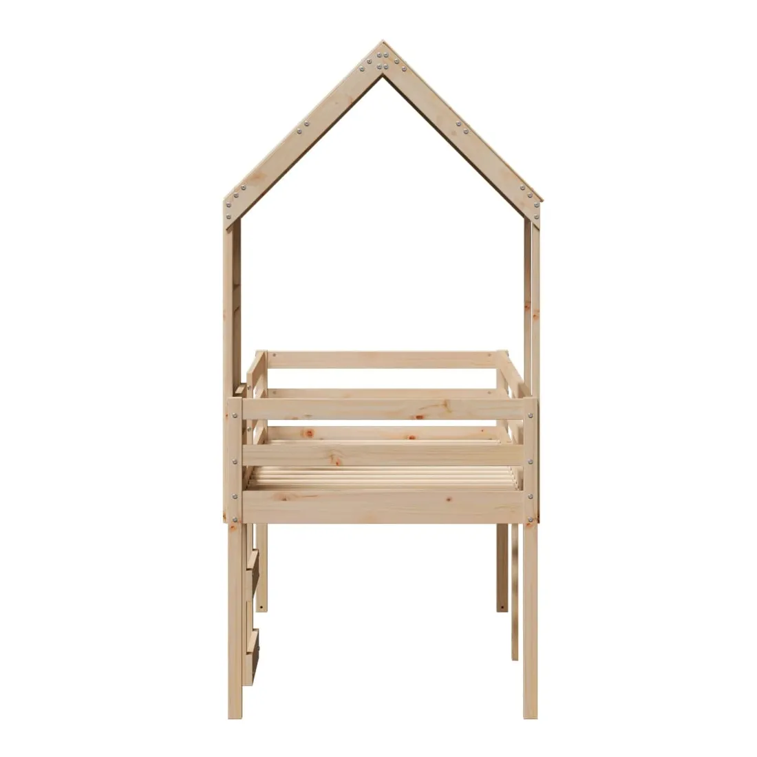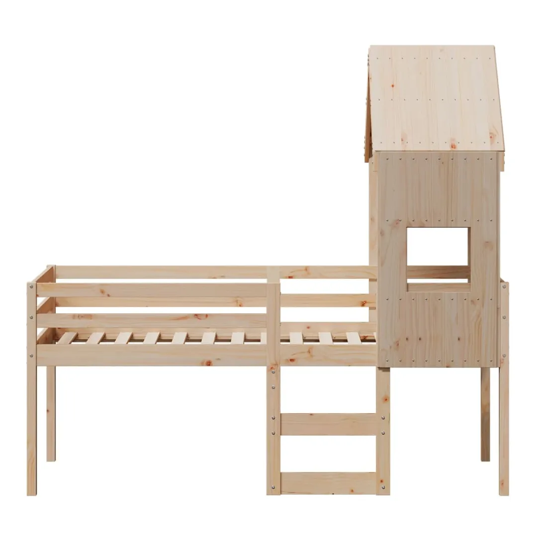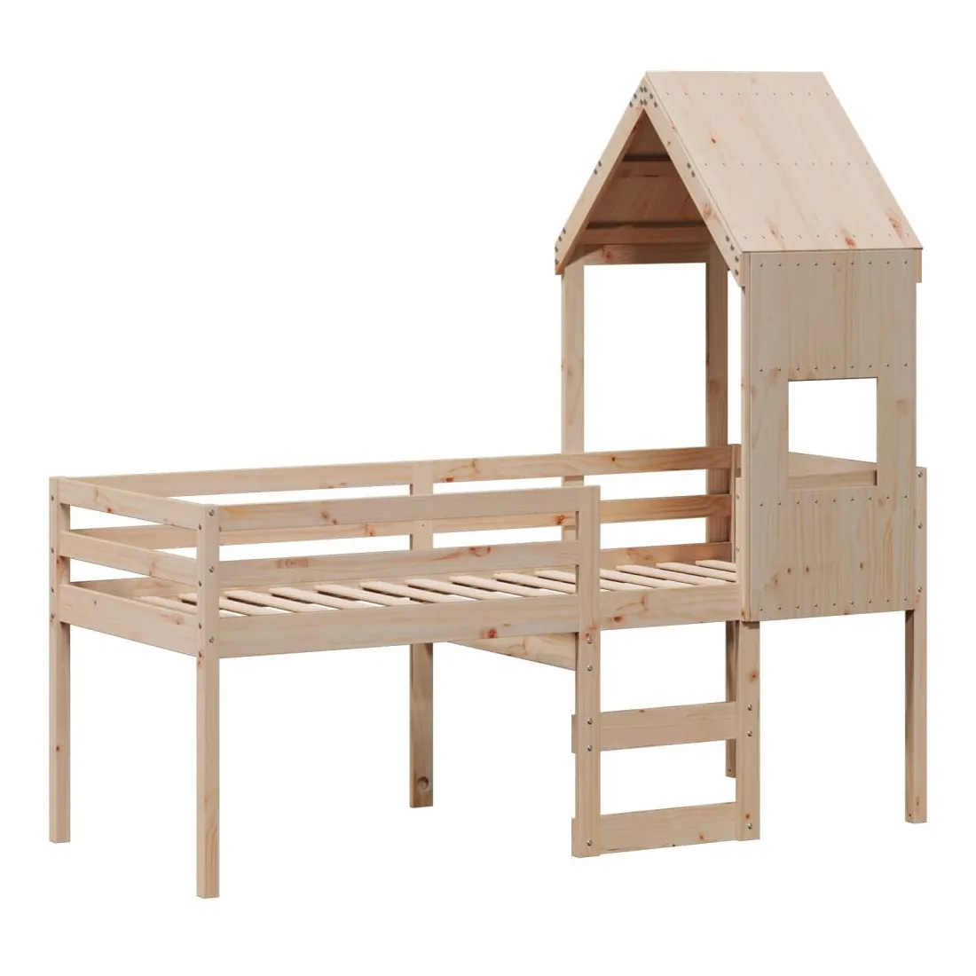 Ce lit haut, dont la polyvalence est au cœur de son design, est une combinaison parfaite de style moderne et élégant et de praticité. Il est idéal pour les petites pièces. Bois de pin massif : le bois de pin massif est un matériau naturel magnifique. Le bois de pin a un grain droit et les nœuds donnent au matériau son aspect caractéristique et rustique.Fonction pratique : le lit surélevé offre un excellent moyen d'utiliser l'espace au sol dans la chambre de votre enfant, vous pouvez le combiner avec un rideau de jeu cool, un matelas de jeu et un panneau d'abri comme un coin de jeu ou utiliser la zone en dessous pour le stockage. Les lattes en contreplaqué offrent un soutien supplémentaire à votre lit. Elles prolongent la durée de vie de votre matelas en absorbant la majeure partie de la tension et du poids du lit.Design sûr : l'échelle intégrée du lit surélevé facilite l'entrée et la sortie du lit, et les garde-corps garantissent la sécurité de vos jeunes pendant qu'ils dorment.Très amusant : en combinant le toit avec le lit de votre enfant, vous pouvez créer une cachette qui permettra à votre enfant de s'amuser à l'heure du coucher. Cette addition innovante non seulement sera un point focal passionnant, mais aussi apportera de la fantaisie et de l'amusement dans la chambre d'enfant.Porte latérale ouverte : le toit est doté d'une porte latérale ouverte qui permet à vos enfants d'entrer et de sortir facilement du lit. Bon à savoir :Un matelas n'est pas inclus avec ce lit. Nous offrons une sélection variée de matelas. Vous pouvez consulter notre boutique pour trouver un matelas assorti.