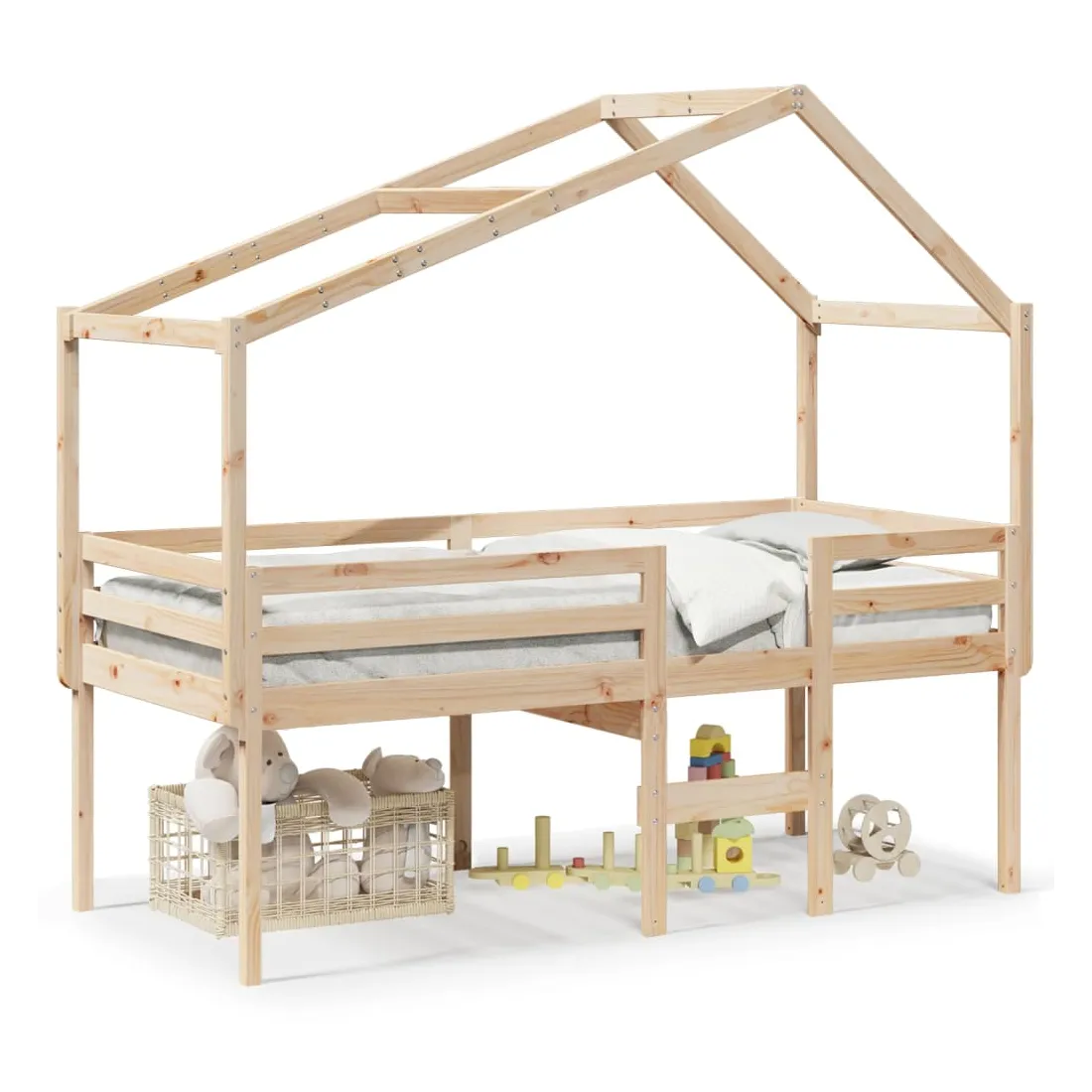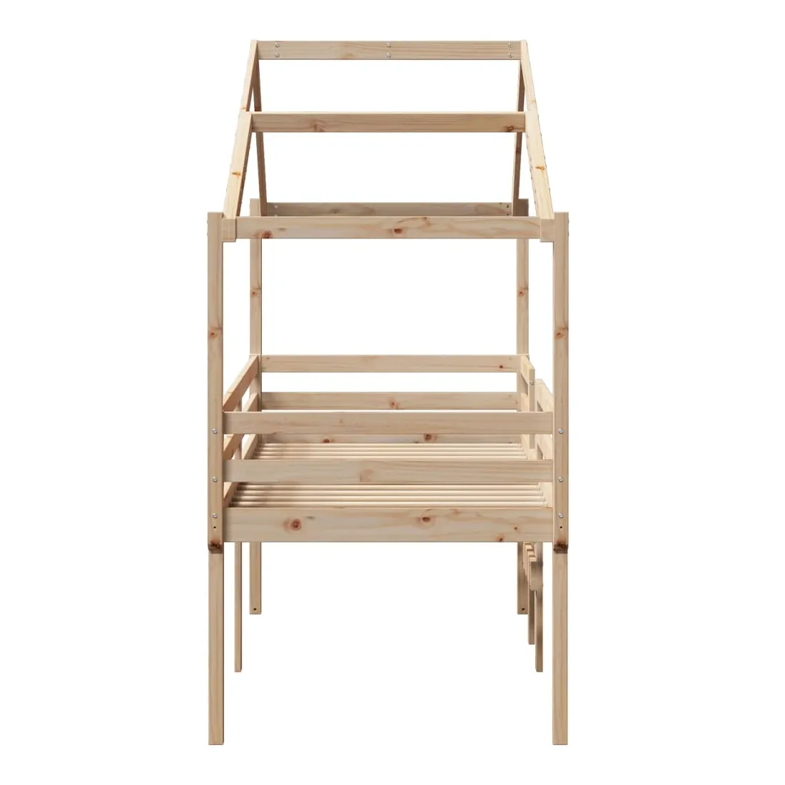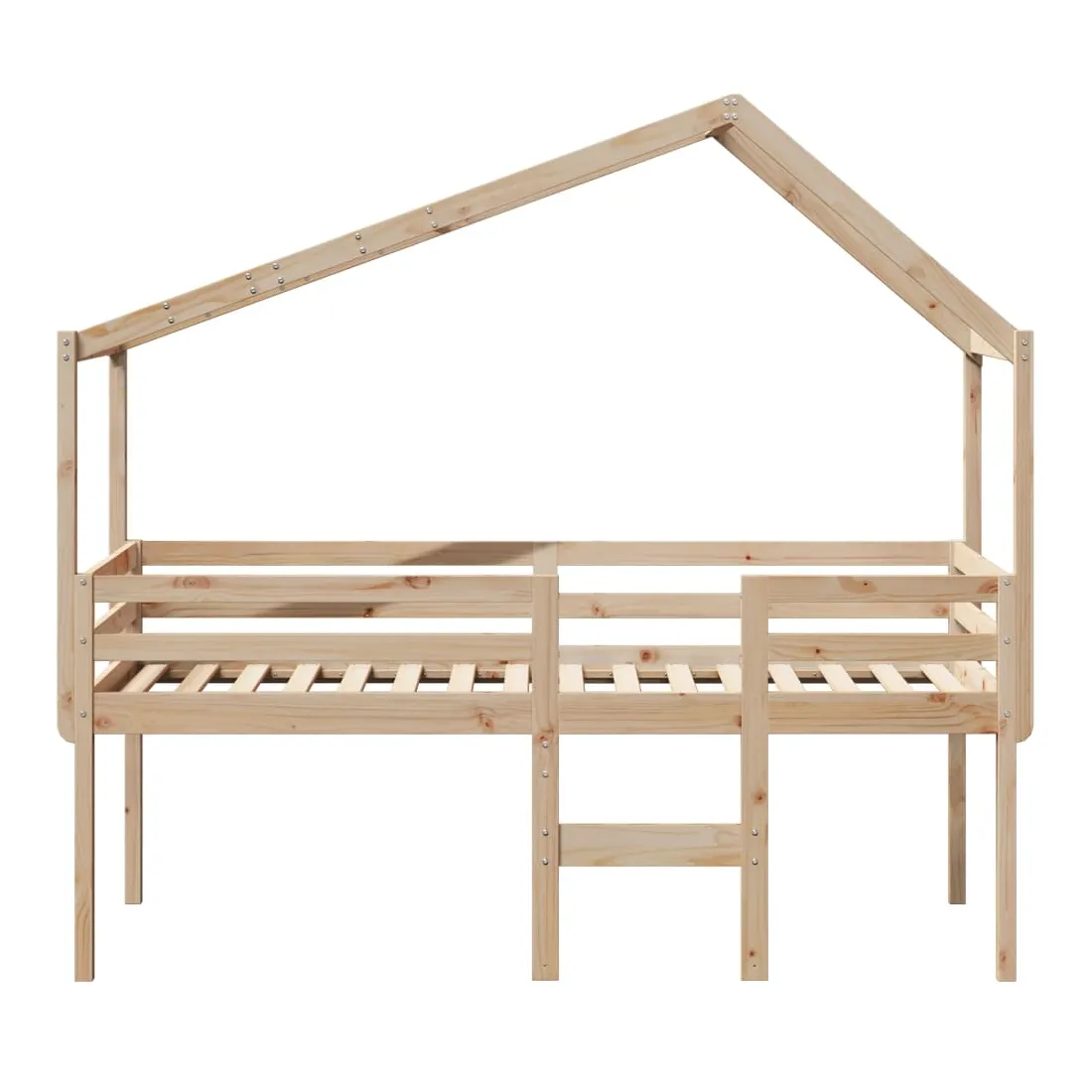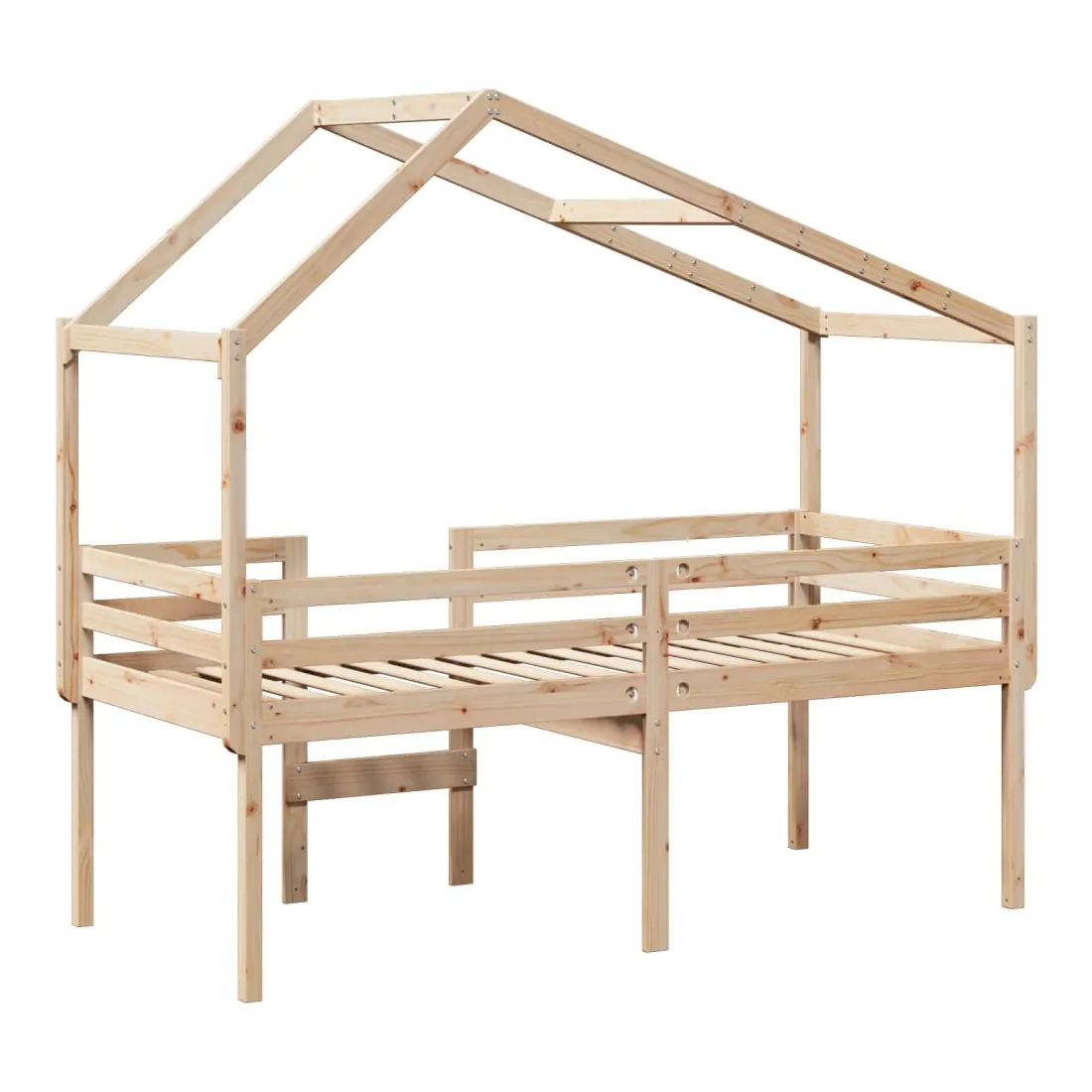 Ce lit haut, dont la polyvalence est au cœur de son design, est une combinaison parfaite de style moderne et élégant et de praticité. Il est idéal pour les petites pièces. Bois de pin massif : le bois de pin massif est un matériau naturel magnifique. Le bois de pin a un grain droit et les nœuds donnent au matériau son aspect caractéristique et rustique.Fonction pratique : le lit surélevé offre un excellent moyen d'utiliser l'espace au sol dans la chambre de votre enfant, vous pouvez le combiner avec un rideau de jeu cool, un matelas de jeu et un panneau d'abri comme un coin de jeu ou utiliser la zone en dessous pour le stockage. Les lattes en contreplaqué offrent un soutien supplémentaire à votre lit. Elles prolongent la durée de vie de votre matelas en absorbant la majeure partie de la tension et du poids du lit.Design sûr : l'échelle intégrée du lit surélevé facilite l'entrée et la sortie du lit, et les garde-corps garantissent la sécurité de vos jeunes pendant qu'ils dorment.Très amusant : en combinant le toit avec le lit de votre enfant, vous pouvez créer une cachette qui permettra à votre enfant de s'amuser à l'heure du coucher. Cette addition innovante non seulement sera un point focal passionnant, mais aussi apportera de la fantaisie et de l'amusement dans la chambre d'enfant.Porte latérale ouverte : le toit est doté d'une porte latérale ouverte qui permet à vos enfants d'entrer et de sortir facilement du lit. Bon à savoir :Un matelas n'est pas inclus avec ce lit. Nous offrons une sélection variée de matelas. Vous pouvez consulter notre boutique pour trouver un matelas assorti.