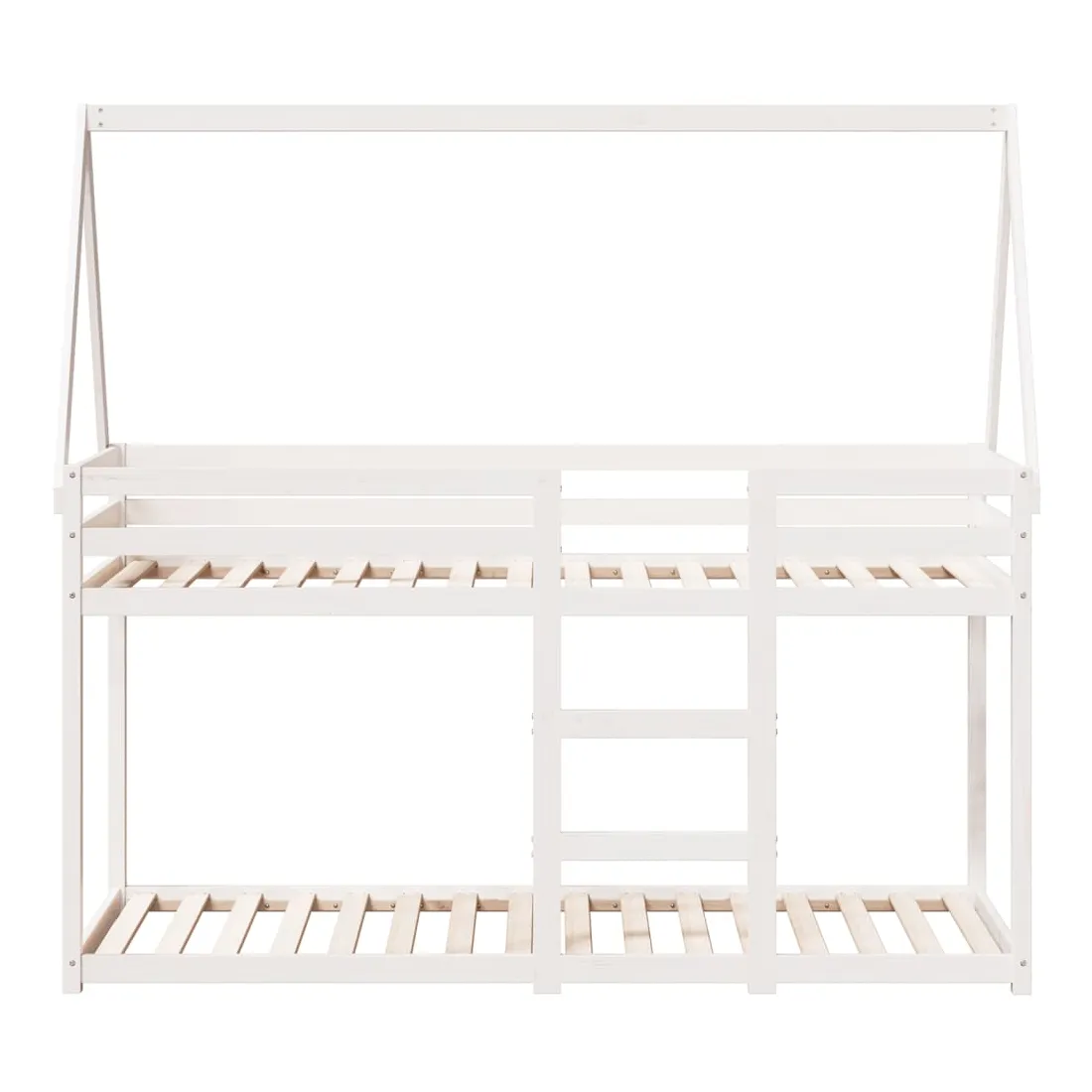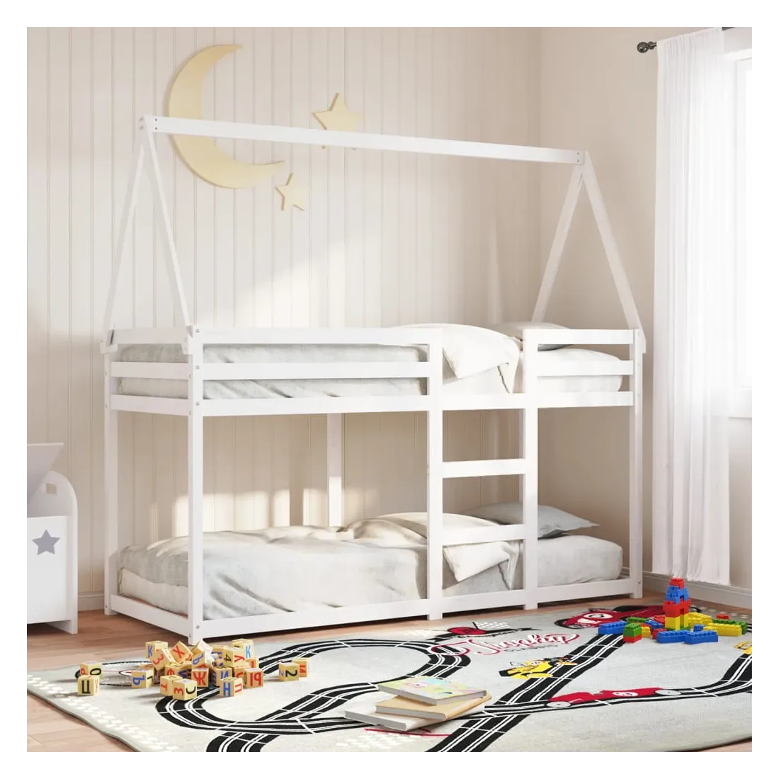 Ce lit superposé pour enfants avec toit est élégant et fonctionnel, ce qui en fait un ajout parfait à toute pièce avec un espace limité. Bois de pin massif : le bois de pin massif est un matériau naturel magnifique. Le bois de pin a un grain droit et les nœuds donnent au matériau son aspect caractéristique et rustique.Design sûr : le lit surélevé est conçu dans un souci de sécurité. Il comprend des garde-corps qui empêchent l'utilisateur de rouler pendant son sommeil.Lattes de contreplaqué : les lattes de contreplaqué assurent une bonne répartition du poids, garantissant que le matelas reste en place à chaque torsion de votre corps pendant le sommeil.Très amusant : en combinant le toit avec le lit de votre enfant, vous pouvez créer une cachette qui permettra à votre enfant de s'amuser à l'heure du coucher. Cette addition innovante non seulement sera un point focal passionnant, mais aussi apportera de la fantaisie et de l'amusement dans la chambre d'enfant.Convient aux espaces limités : le cadre de lit est un excellent choix pour toute pièce dont l'espace est limité, il fournit deux lits individuels avec un design compact.Porte latérale ouverte : le toit est doté d'une porte latérale ouverte qui permet à vos enfants d'entrer et de sortir facilement du lit. Bon à savoir :Un matelas n'est pas inclus avec ce lit. Nous offrons une sélection variée de matelas. Vous pouvez consulter notre boutique pour trouver un matelas assorti.