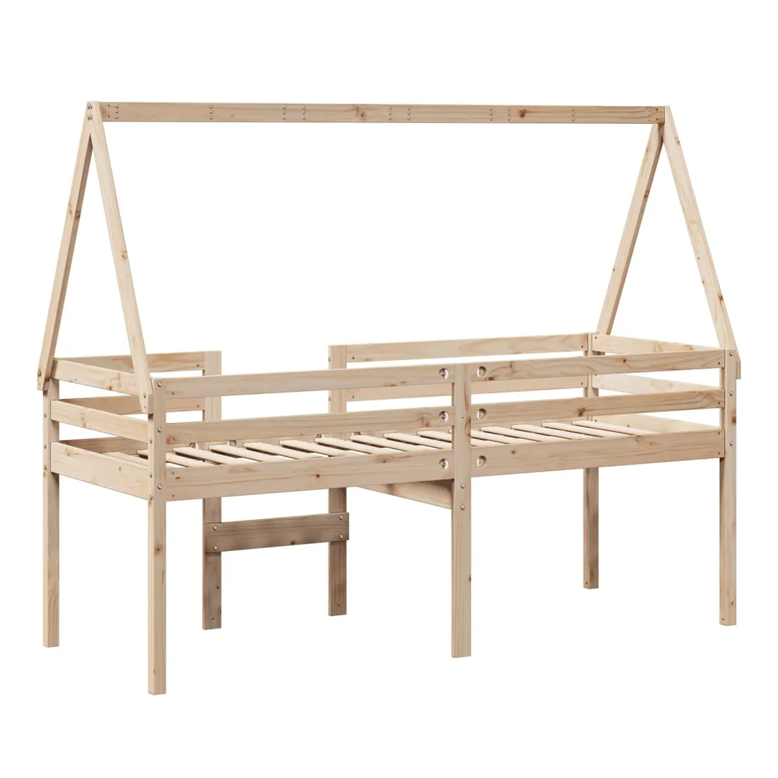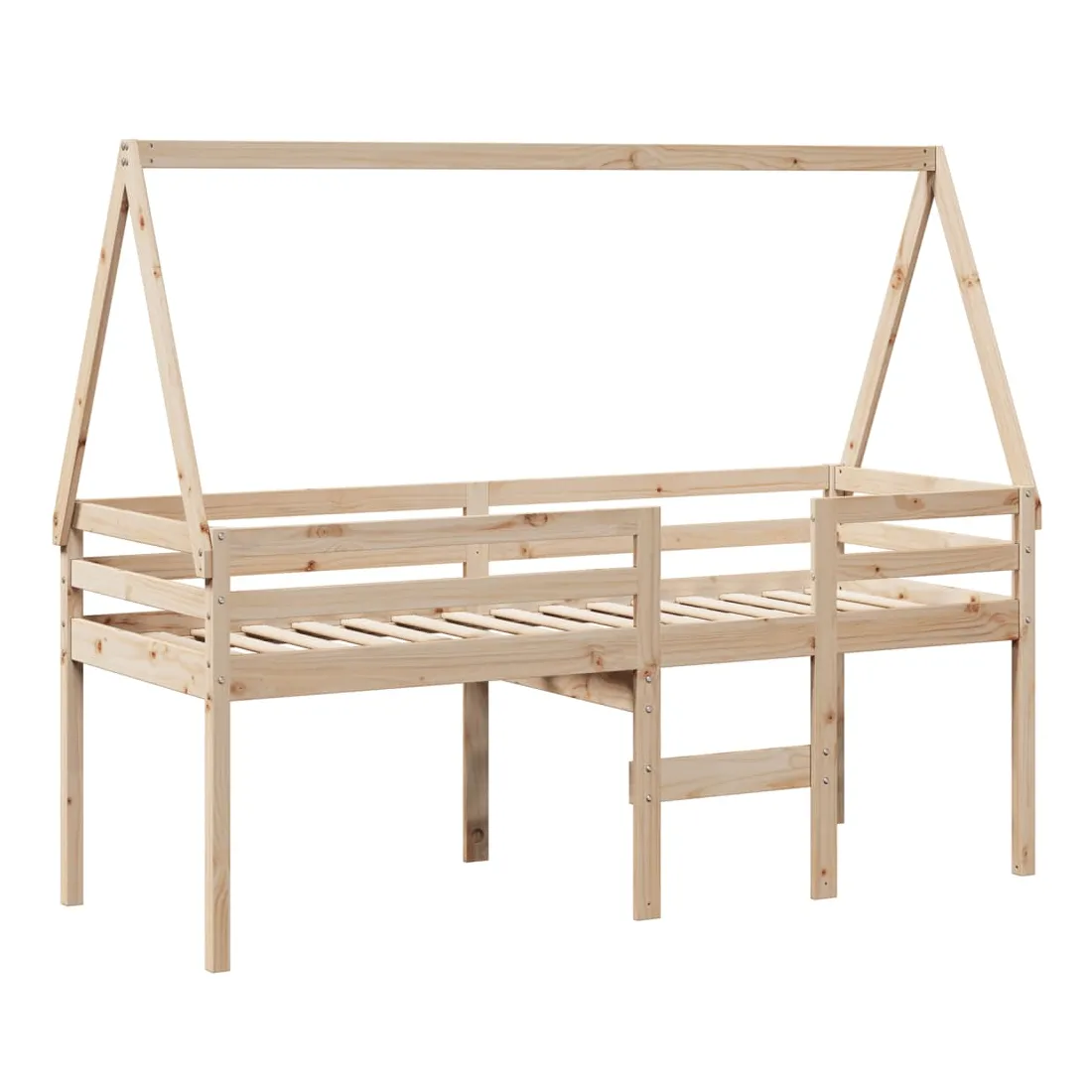Ce lit haut, dont la polyvalence est au cœur de son design, est une combinaison parfaite de style moderne et élégant et de praticité. Il est idéal pour les petites pièces. Bois de pin massif : le bois de pin massif est un matériau naturel magnifique. Le bois de pin a un grain droit et les nœuds donnent au matériau son aspect caractéristique et rustique.Fonction pratique : le lit surélevé offre un excellent moyen d'utiliser l'espace au sol dans la chambre de votre enfant, vous pouvez le combiner avec un rideau de jeu cool, un matelas de jeu et un panneau d'abri comme un coin de jeu ou utiliser la zone en dessous pour le stockage. Les lattes en contreplaqué offrent un soutien supplémentaire à votre lit. Elles prolongent la durée de vie de votre matelas en absorbant la majeure partie de la tension et du poids du lit.Design sûr : l'échelle intégrée du lit surélevé facilite l'entrée et la sortie du lit, et les garde-corps garantissent la sécurité de vos jeunes pendant qu'ils dorment.Très amusant : en combinant le toit avec le lit de votre enfant, vous pouvez créer une cachette qui permettra à votre enfant de s'amuser à l'heure du coucher. Cette addition innovante non seulement sera un point focal passionnant, mais aussi apportera de la fantaisie et de l'amusement dans la chambre d'enfant.Porte latérale ouverte : le toit est doté d'une porte latérale ouverte qui permet à vos enfants d'entrer et de sortir facilement du lit. Bon à savoir :Un matelas n'est pas inclus avec ce lit. Nous offrons une sélection variée de matelas. Vous pouvez consulter notre boutique pour trouver un matelas assorti.