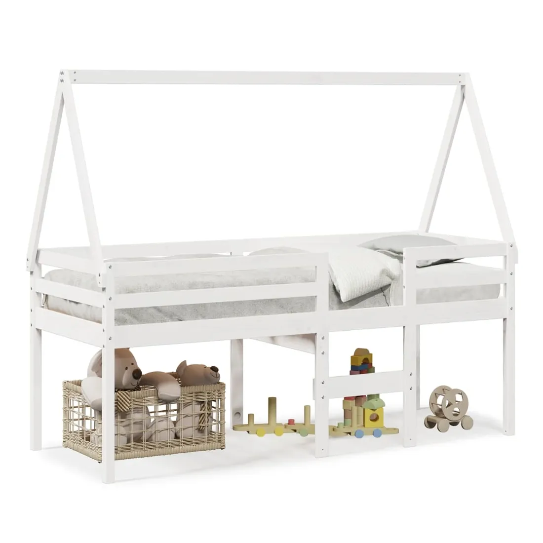 Ce lit haut, dont la polyvalence est au cœur de son design, est une combinaison parfaite de style moderne et élégant et de praticité. Il est idéal pour les petites pièces. Bois de pin massif : le bois de pin massif est un matériau naturel magnifique. Le bois de pin a un grain droit et les nœuds donnent au matériau son aspect caractéristique et rustique.Fonction pratique : le lit surélevé offre un excellent moyen d'utiliser l'espace au sol dans la chambre de votre enfant, vous pouvez le combiner avec un rideau de jeu cool, un matelas de jeu et un panneau d'abri comme un coin de jeu ou utiliser la zone en dessous pour le stockage. Les lattes en contreplaqué offrent un soutien supplémentaire à votre lit. Elles prolongent la durée de vie de votre matelas en absorbant la majeure partie de la tension et du poids du lit.Design sûr : l'échelle intégrée du lit surélevé facilite l'entrée et la sortie du lit, et les garde-corps garantissent la sécurité de vos jeunes pendant qu'ils dorment.Très amusant : en combinant le toit avec le lit de votre enfant, vous pouvez créer une cachette qui permettra à votre enfant de s'amuser à l'heure du coucher. Cette addition innovante non seulement sera un point focal passionnant, mais aussi apportera de la fantaisie et de l'amusement dans la chambre d'enfant.Porte latérale ouverte : le toit est doté d'une porte latérale ouverte qui permet à vos enfants d'entrer et de sortir facilement du lit. Bon à savoir :Un matelas n'est pas inclus avec ce lit. Nous offrons une sélection variée de matelas. Vous pouvez consulter notre boutique pour trouver un matelas assorti.