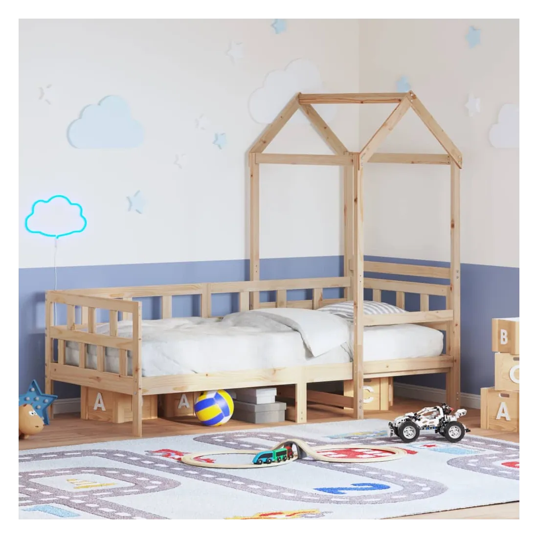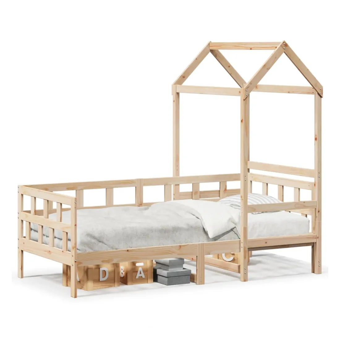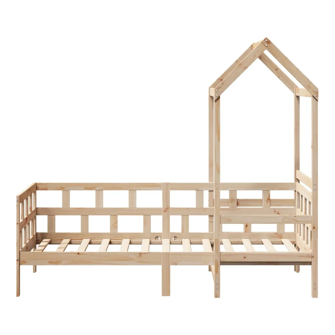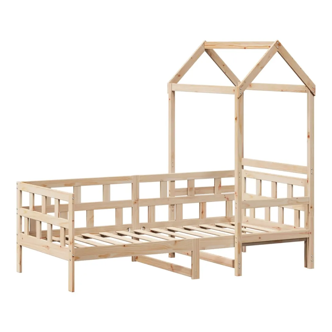 Ce lit de jour polyvalent en bois peut être utilisé comme un lit dans la chambre à coucher et est également idéal comme un canapé dans le salon. Il s'adapte parfaitement à vos différents besoins, vous offrant beaucoup d'espace pour dormir et vous reposer. Bois de pin massif : le bois de pin massif est un matériau naturel magnifique. Le bois de pin a un grain droit et les nœuds donnent au matériau son aspect caractéristique et rustique.Barres de lit sur 3 côtés : ce lit d'appoint présente un design unique sur le côté du lit, ce qui offre un sentiment de sécurité et ajoute une touche de style sophistiqué à votre intérieur.Design à lattes : le sommier à lattes en bois permet une meilleure circulation de l'air pour garder le matelas frais plus longtemps, améliorant la capacité de poids du lit et assurant la stabilité.Espace de rangement supplémentaire : profitez de l'espace sous le canapé pour ranger divers objets. Parfait pour ranger des boîtes pour organiser des vêtements, des jouets ou des couettes.Très amusant : en combinant le toit avec votre canapé-lit, vous pouvez créer une cachette qui permettra à votre enfant de s'amuser à l'heure du coucher. Cette addition innovante non seulement sera un point focal passionnant, mais aussi apportera de la fantaisie et de l'amusement dans la chambre.Porte latérale ouverte : le toit est doté d'une porte latérale ouverte qui permet à vos enfants d'entrer et de sortir facilement du lit. Bon à savoir :Un matelas n'est pas inclus avec ce lit. Nous offrons une sélection variée de matelas. Vous pouvez consulter notre boutique pour trouver un matelas assorti.