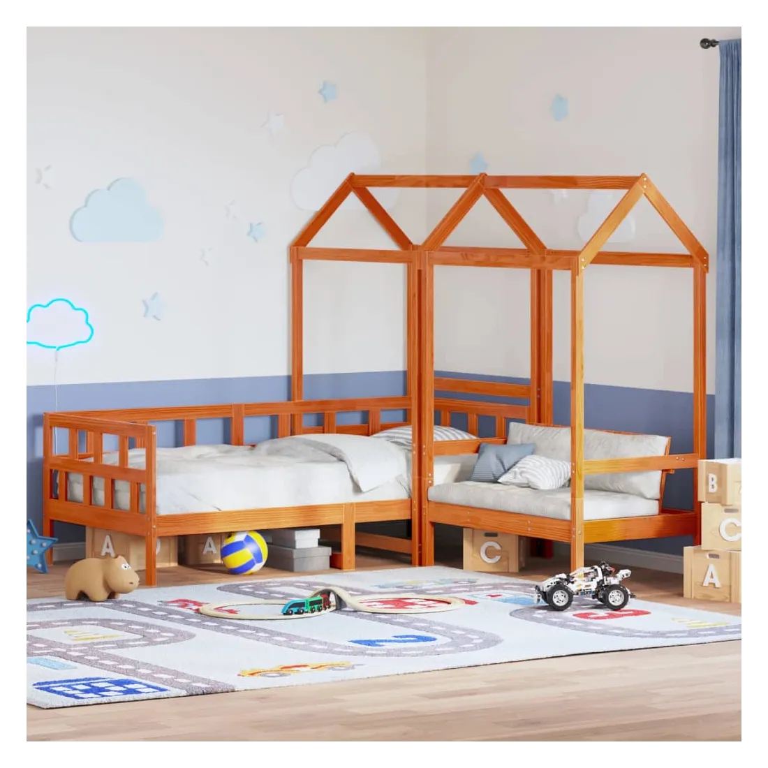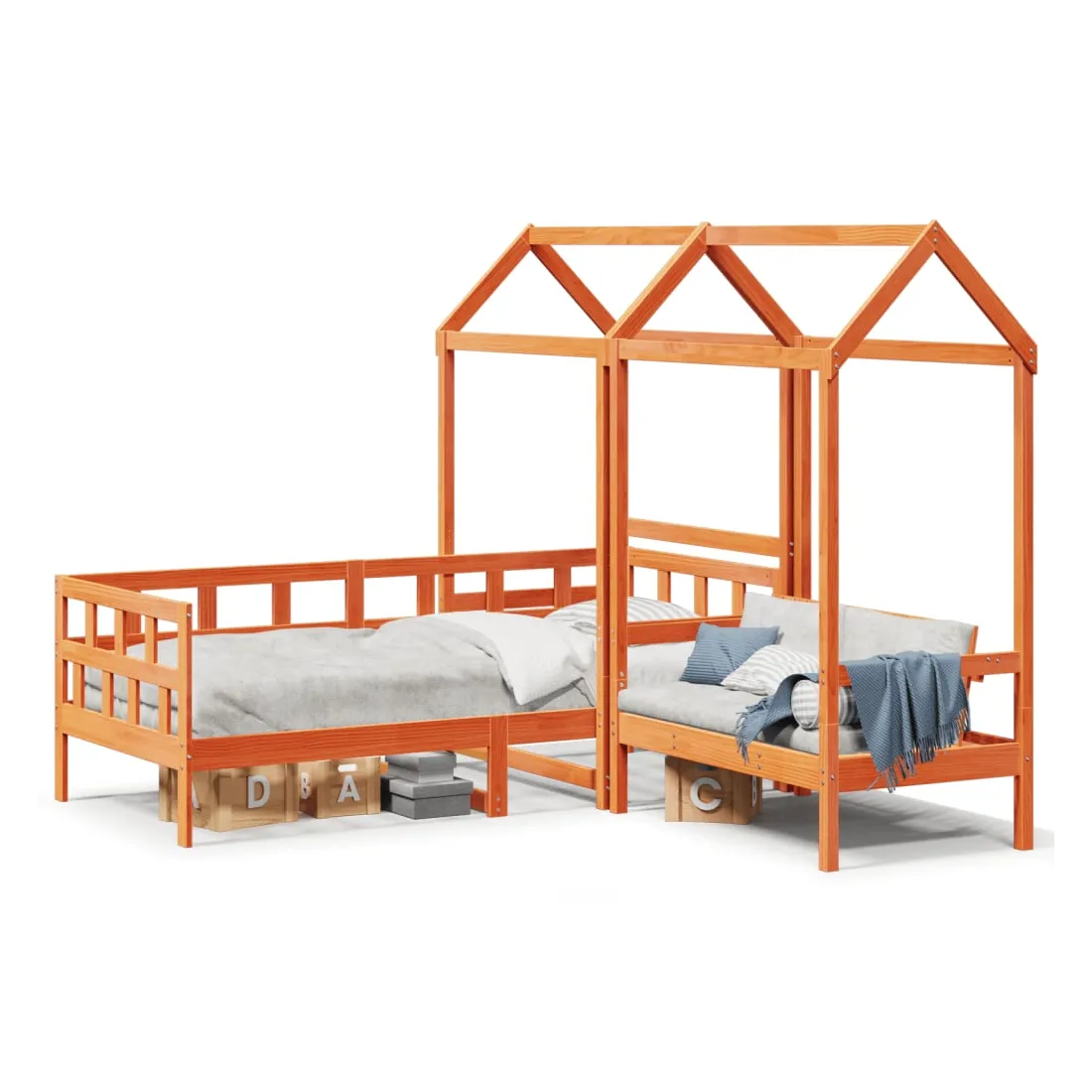 Cet ensemble de lit de jour polyvalent en bois peut être utilisé comme ensemble de lit dans la chambre à coucher et est également idéal comme ensemble de canapé dans le salon. Il s'adapte parfaitement à vos différents besoins, vous offrant beaucoup d'espace pour dormir et vous reposer. Bois de pin massif : le bois de pin massif est un matériau naturel magnifique. Le bois de pin a un grain droit et les nœuds donnent au matériau son aspect caractéristique et rustique.Barres de lit sur 3 côtés : ce lit d'appoint présente un design unique sur le côté du lit, ce qui offre un sentiment de sécurité et ajoute une touche de style sophistiqué à votre intérieur.Design à lattes : le sommier à lattes en bois permet une meilleure circulation de l'air pour garder le matelas frais plus longtemps, améliorant la capacité de poids du lit et assurant la stabilité.Espace de rangement supplémentaire : profitez de l'espace sous le canapé pour ranger divers objets. Parfait pour ranger des boîtes pour organiser des vêtements, des jouets ou des couettes.Très amusant : en combinant le toit avec votre canapé-lit, vous pouvez créer une cachette qui permettra à votre enfant de s'amuser à l'heure du coucher. Cette addition innovante non seulement sera un point focal passionnant, mais aussi apportera de la fantaisie et de l'amusement dans la chambre.Porte latérale ouverte : le toit est doté d'une porte latérale ouverte qui permet à vos enfants d'entrer et de sortir facilement du lit. Bon à savoir :Un matelas n'est pas inclus avec ce lit. Nous offrons une sélection variée de matelas. Vous pouvez consulter notre boutique pour trouver un matelas assorti.