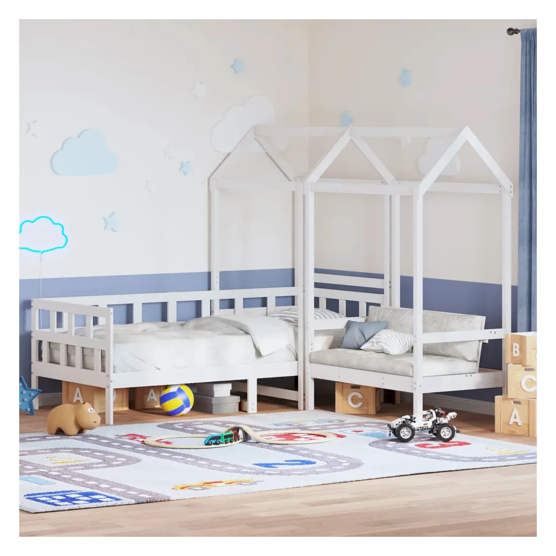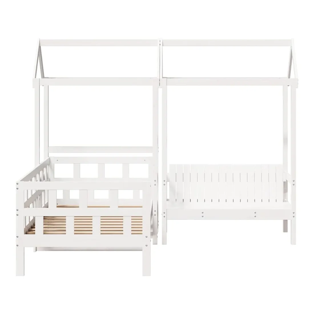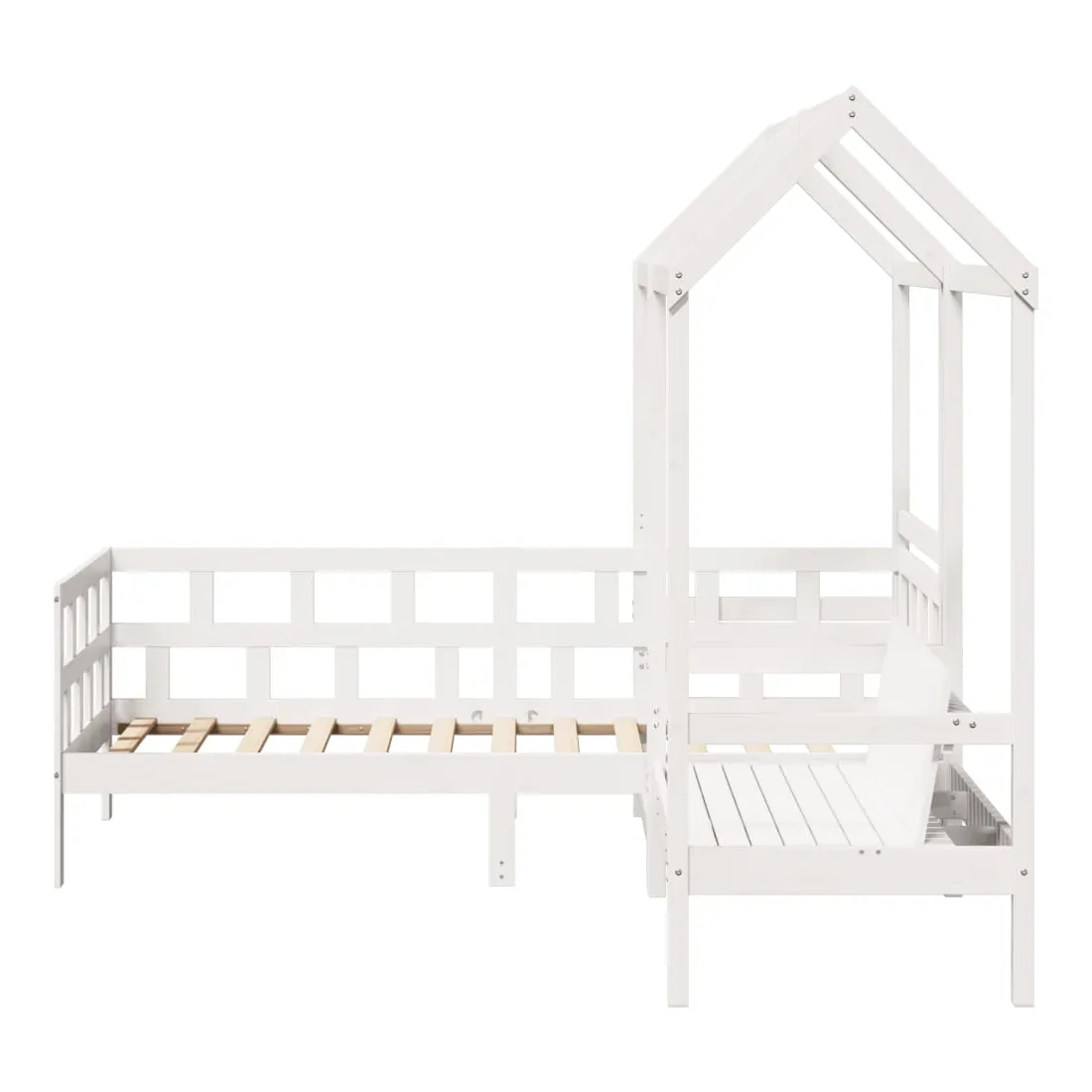 Cet ensemble de lit de jour polyvalent en bois peut être utilisé comme ensemble de lit dans la chambre à coucher et est également idéal comme ensemble de canapé dans le salon. Il s'adapte parfaitement à vos différents besoins, vous offrant beaucoup d'espace pour dormir et vous reposer. Bois de pin massif : le bois de pin massif est un matériau naturel magnifique. Le bois de pin a un grain droit et les nœuds donnent au matériau son aspect caractéristique et rustique.Barres de lit sur 3 côtés : ce lit d'appoint présente un design unique sur le côté du lit, ce qui offre un sentiment de sécurité et ajoute une touche de style sophistiqué à votre intérieur.Design à lattes : le sommier à lattes en bois permet une meilleure circulation de l'air pour garder le matelas frais plus longtemps, améliorant la capacité de poids du lit et assurant la stabilité.Espace de rangement supplémentaire : profitez de l'espace sous le canapé pour ranger divers objets. Parfait pour ranger des boîtes pour organiser des vêtements, des jouets ou des couettes.Très amusant : en combinant le toit avec votre canapé-lit, vous pouvez créer une cachette qui permettra à votre enfant de s'amuser à l'heure du coucher. Cette addition innovante non seulement sera un point focal passionnant, mais aussi apportera de la fantaisie et de l'amusement dans la chambre.Porte latérale ouverte : le toit est doté d'une porte latérale ouverte qui permet à vos enfants d'entrer et de sortir facilement du lit. Bon à savoir :Un matelas n'est pas inclus avec ce lit. Nous offrons une sélection variée de matelas. Vous pouvez consulter notre boutique pour trouver un matelas assorti.