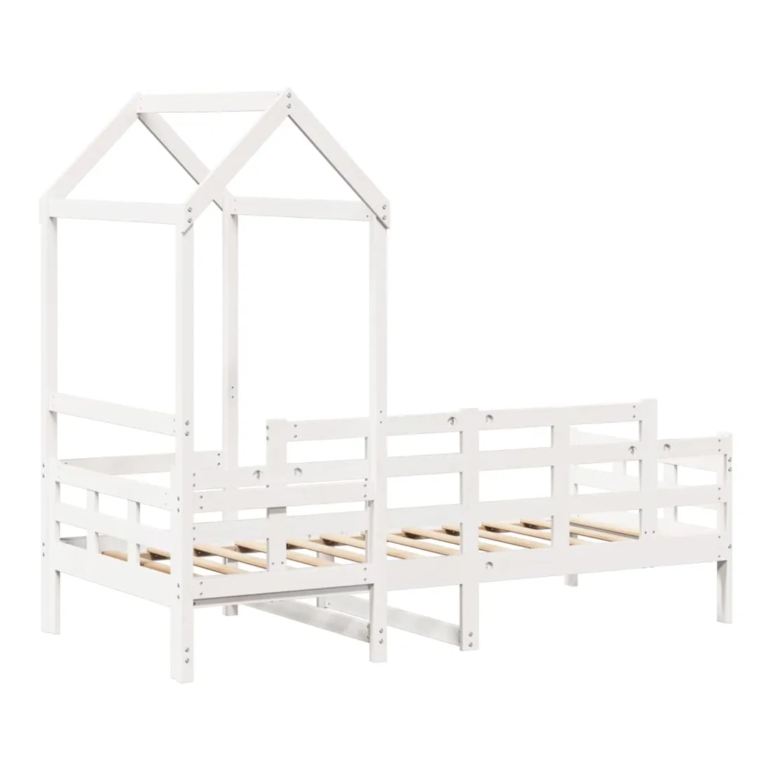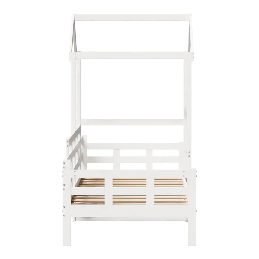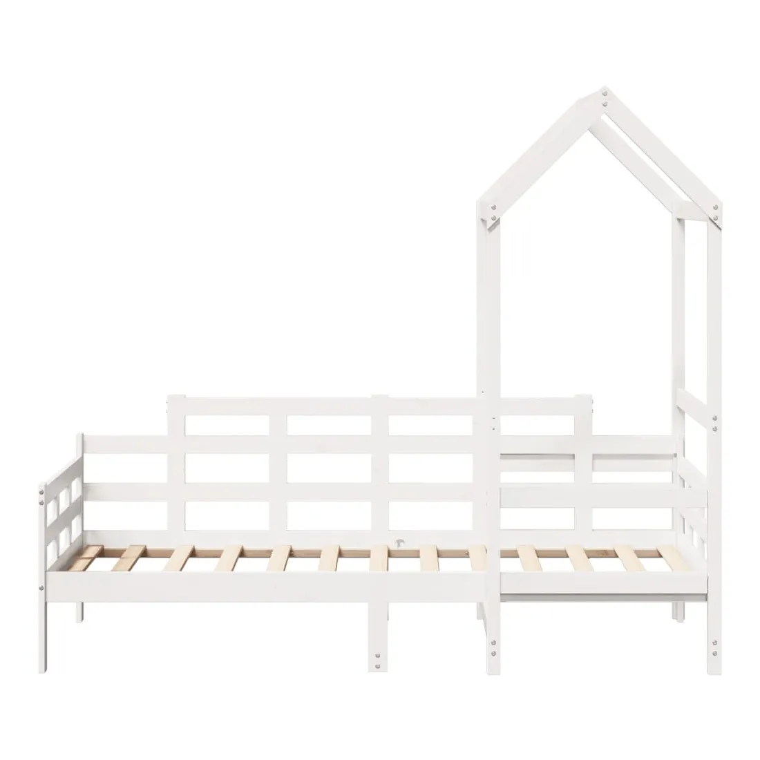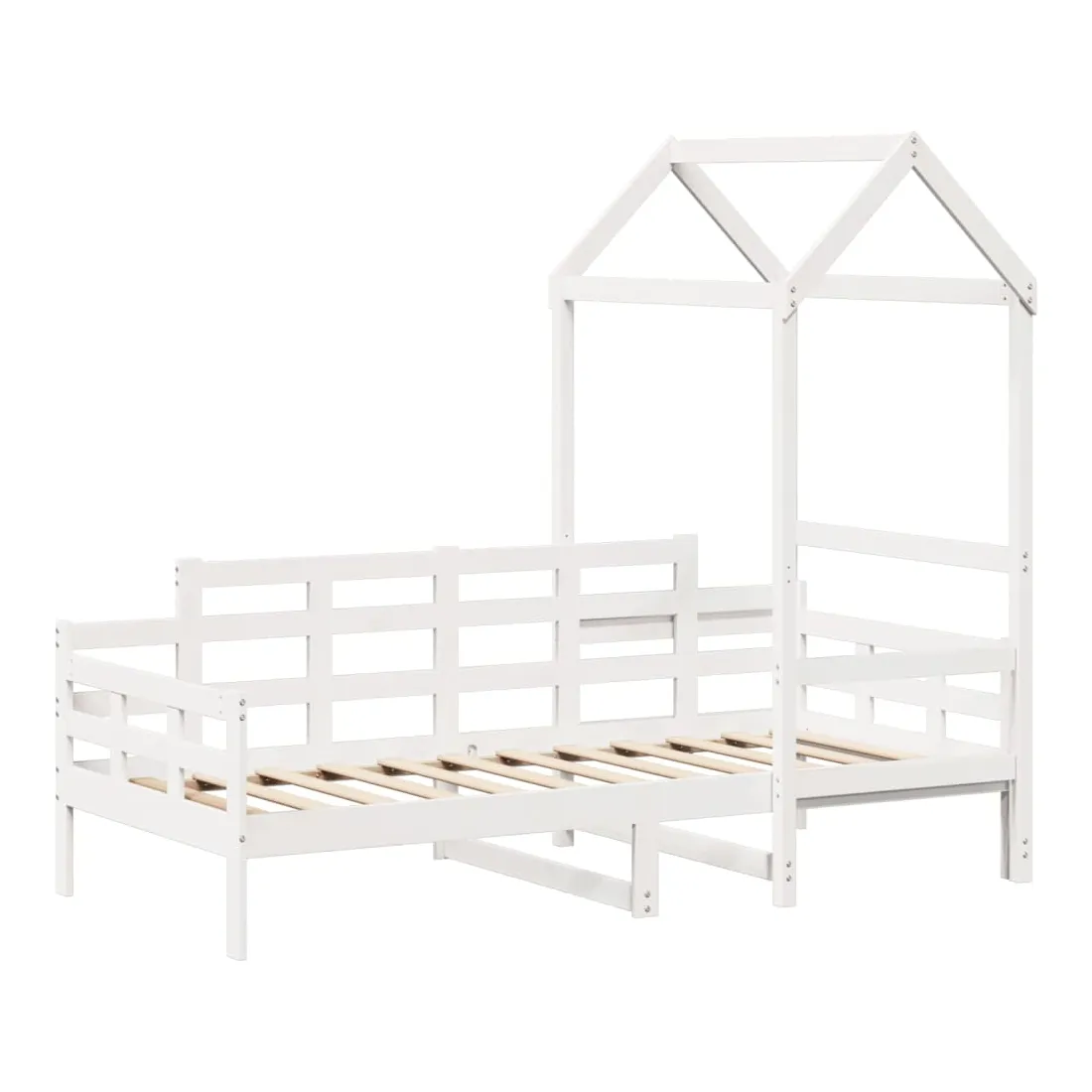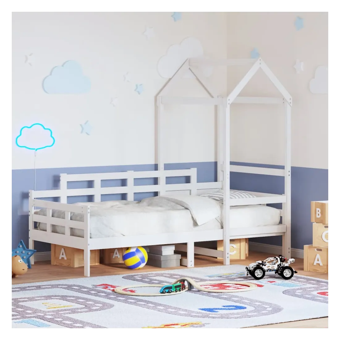Ce lit de jour polyvalent en bois peut être utilisé comme un lit dans la chambre à coucher et est également idéal comme un canapé dans le salon. Il s'adapte parfaitement à vos différents besoins, vous offrant beaucoup d'espace pour dormir et vous reposer. Bois de pin massif : le bois de pin massif est un matériau naturel magnifique. Le bois de pin a un grain droit et les nœuds donnent au matériau son aspect caractéristique et rustique.Barres de lit sur 3 côtés : ce lit d'appoint présente un design unique sur le côté du lit, ce qui offre un sentiment de sécurité et ajoute une touche de style sophistiqué à votre intérieur.Design à lattes : le sommier à lattes en bois permet une meilleure circulation de l'air pour garder le matelas frais plus longtemps, améliorant la capacité de poids du lit et assurant la stabilité.Espace de rangement supplémentaire : profitez de l'espace sous le canapé pour ranger divers objets. Parfait pour ranger des boîtes pour organiser des vêtements, des jouets ou des couettes.Très amusant : en combinant le toit avec votre canapé-lit, vous pouvez créer une cachette qui permettra à votre enfant de s'amuser à l'heure du coucher. Cette addition innovante non seulement sera un point focal passionnant, mais aussi apportera de la fantaisie et de l'amusement dans la chambre.Porte latérale ouverte : le toit est doté d'une porte latérale ouverte qui permet à vos enfants d'entrer et de sortir facilement du lit. Bon à savoir :Un matelas n'est pas inclus avec ce lit. Nous offrons une sélection variée de matelas. Vous pouvez consulter notre boutique pour trouver un matelas assorti.