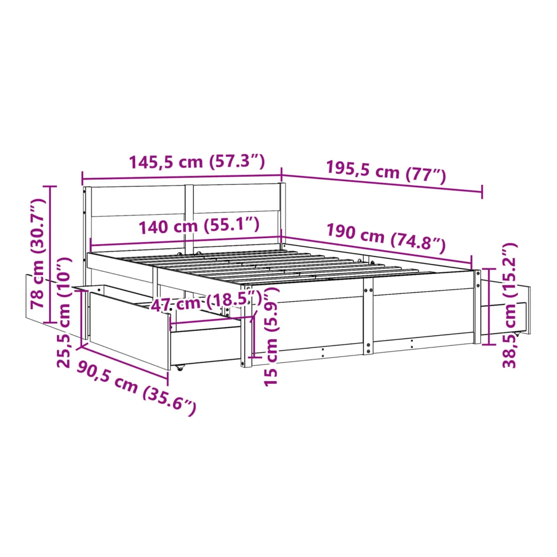 - Dimensions du tiroir de lit : 90,5 x 47 x 25,5 cm (L x l x H)