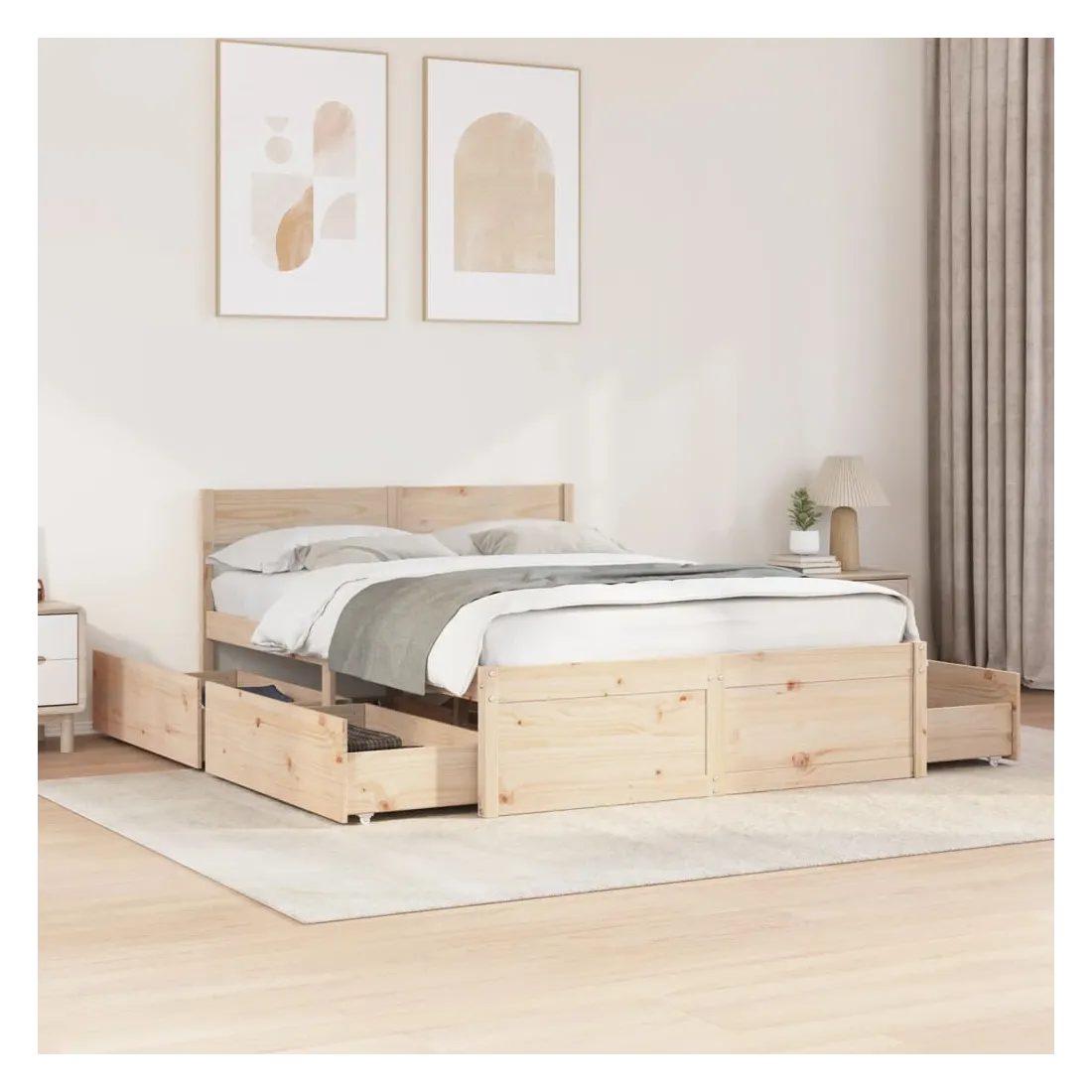 Ajoutez une touche moderne à votre chambre à coucher avec ce cadre de lit avec tiroirs ! Il apportera une touche pratique et décorative à votre espace de vie. Cadre stable et durable : le bois de pin massif est connu pour sa résistance et sa durabilité. Ses grains droits et ses nœuds distinctifs contribuent à son charme rustique.Lattes de contreplaqué : les lattes de contreplaqué assurent une bonne répartition du poids, garantissant que le matelas reste en place à chaque torsion de votre corps pendant le sommeil.Fonction de rangement : les tiroirs de lit inclus offrent suffisamment d'espace de rangement pour ranger vos articles essentiels, gardant votre pièce propre et bien rangée.Tête de lit polyvalente : ce cadre de lit est équipé d'une tête de lit qui offre un excellent soutien dorsal lorsque vous vous asseyez dans le lit pour lire ou regarder la télévision, tout en servant d'élément décoratif. Bon à savoir :Un matelas n'est pas inclus avec ce lit. Nous offrons une sélection variée de matelas. Vous pouvez consulter notre boutique pour trouver un matelas assorti.