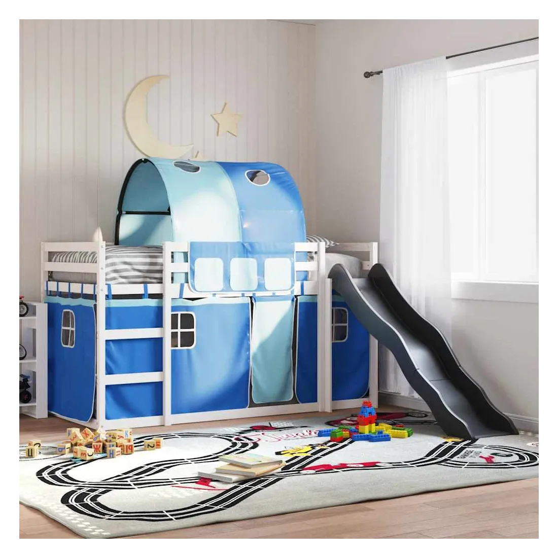 Ce lit superposé en bois est élégant et fonctionnel, ce qui en fait un supplément parfait à toute pièce dont l'espace est limité. Bois de pin massif : ce lit superposé est fabriqué en bois de pin massif pour plus de stabilité et de durabilité. Le bois de pin a un grain droit et les nœuds donnent au matériau son aspect rustique caractéristique.Très amusant : vous pouvez combiner les rideaux avec le lit superposé bas pour créer la base secrète de votre enfant, ce qui permet de s’amuser à l’heure du coucher et d’ajouter un point d'intérêt à la chambre à coucher !Barrières de sécurité : le lit supérieur est équipé de garde-corps de sécurité sur les 4 côtés, afin que votre enfant puisse dormir sans craindre de tomber.Échelle et toboggan pratiques : ce lit superposé est doté d'un toboggan amusant qui apporte de la joie et transforme leur chambre en une aire de jeux intérieure. La combinaison d'une échelle d'escalade et d'un toboggan rend l'heure du coucher plus vivante et plus intéressante pour les enfants.Lattes robustes : les lattes de contreplaqué assurent une bonne répartition du poids, garantissant que le matelas reste en place à chaque torsion de votre corps pendant le sommeil. Bon à savoir :Un matelas n'est pas inclus avec ce lit. Nous offrons une sélection variée de matelas. Vous pouvez consulter notre boutique pour trouver un matelas assorti. Attention :Pour éviter qu'il ne bascule, ce produit doit être utilisé avec le dispositif de fixation murale fourni.