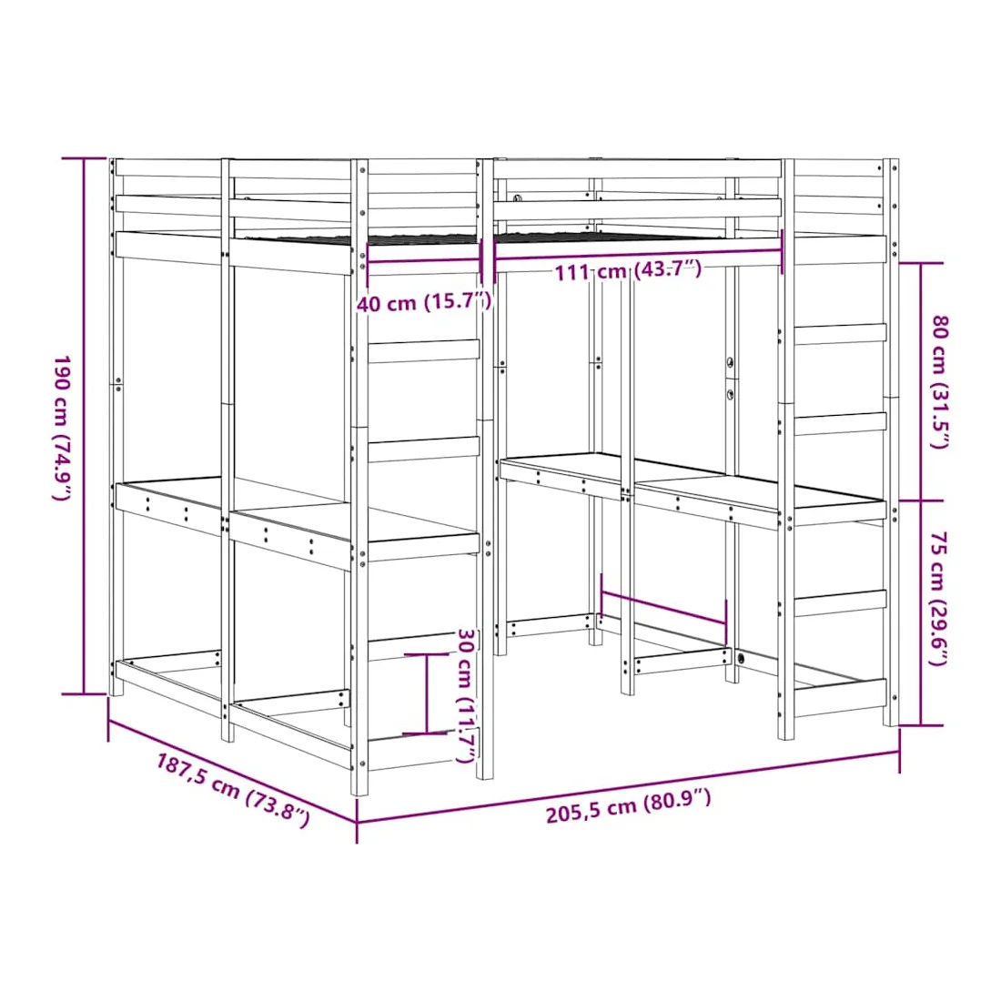 - Hauteur de la zone de couchage à partir du sol : 155 cm