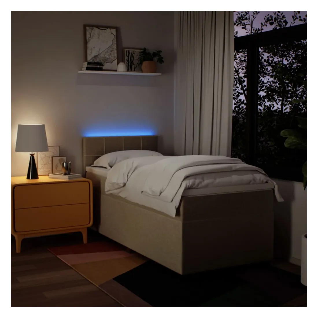 Utilisez ce lit à sommier pour profiter d'une nuit de sommeil réparatrice ! Il vous offre une relaxation maximale et un sommeil agréable. Matériau doux et durable : le tissu en polyester allie douceur, respirabilité et durabilité, vous garantissant un confort et une convivialité ultimes.Matelas à ressorts ensachés : ce matelas à ressorts ensachés comporte des ressorts ensachés individuels qui fonctionnent indépendamment pour offrir un soutien personnalisé en réagissant uniquement à la pression exercée dans chaque zone. Cette conception empêche « l'enroulement » et réduit le transfert de mouvement par rapport aux matelas traditionnels à ressorts ouverts. Chaque ressort ensaché soutient le corps individuellement.Lumières LED pour une ambiance agréable : ce lit est équipé de lumières LED qui peuvent être facilement réglées pour créer un spectacle lumineux personnalisé. Vous pouvez personnaliser les modes, les couleurs et la luminosité pour améliorer l'ambiance de votre espace intérieur.Surmatelas confortable : ce surmatelas améliore le soutien et le confort grâce à sa surface douce et respirante, tout en prolongeant la durée de vie de votre matelas. Sa housse amovible permet un lavage facile, ce qui facilite l'entretien. Bon à savoir :Ce produit est doté d'un connecteur USB qui nécessite une source d'alimentation USB de 5V certifiée (non incluse).Pour des raisons d'hygiène, le matelas ne peut pas être retourné si l'emballage est retiré ou ouvert.Seule la partie avec un symbole de ciseaux peut être coupée et seule la partie avec l'USB continuera à fonctionner comme avant.