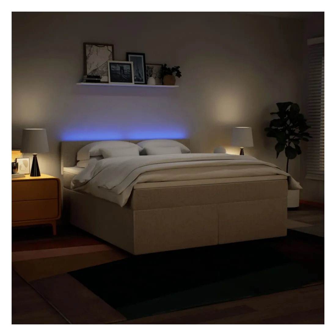 Utilisez ce lit à sommier pour profiter d'une nuit de sommeil réparatrice ! Il vous offre une relaxation maximale et un sommeil agréable. Matériau doux et durable : le tissu en polyester allie douceur, respirabilité et durabilité, vous garantissant un confort et une convivialité ultimes.Matelas à ressorts ensachés : ce matelas à ressorts ensachés comporte des ressorts ensachés individuels qui fonctionnent indépendamment pour offrir un soutien personnalisé en réagissant uniquement à la pression exercée dans chaque zone. Cette conception empêche « l'enroulement » et réduit le transfert de mouvement par rapport aux matelas traditionnels à ressorts ouverts. Chaque ressort ensaché soutient le corps individuellement.Lumières LED pour une ambiance agréable : ce lit est équipé de lumières LED qui peuvent être facilement réglées pour créer un spectacle lumineux personnalisé. Vous pouvez personnaliser les modes, les couleurs et la luminosité pour améliorer l'ambiance de votre espace intérieur.Surmatelas confortable : ce surmatelas améliore le soutien et le confort grâce à sa surface douce et respirante, tout en prolongeant la durée de vie de votre matelas. Sa housse amovible permet un lavage facile, ce qui facilite l'entretien. Bon à savoir :Ce produit est doté d'un connecteur USB qui nécessite une source d'alimentation USB de 5V certifiée (non incluse).Pour des raisons d'hygiène, le matelas ne peut pas être retourné si l'emballage est retiré ou ouvert.Seule la partie avec un symbole de ciseaux peut être coupée et seule la partie avec l'USB continuera à fonctionner comme avant.