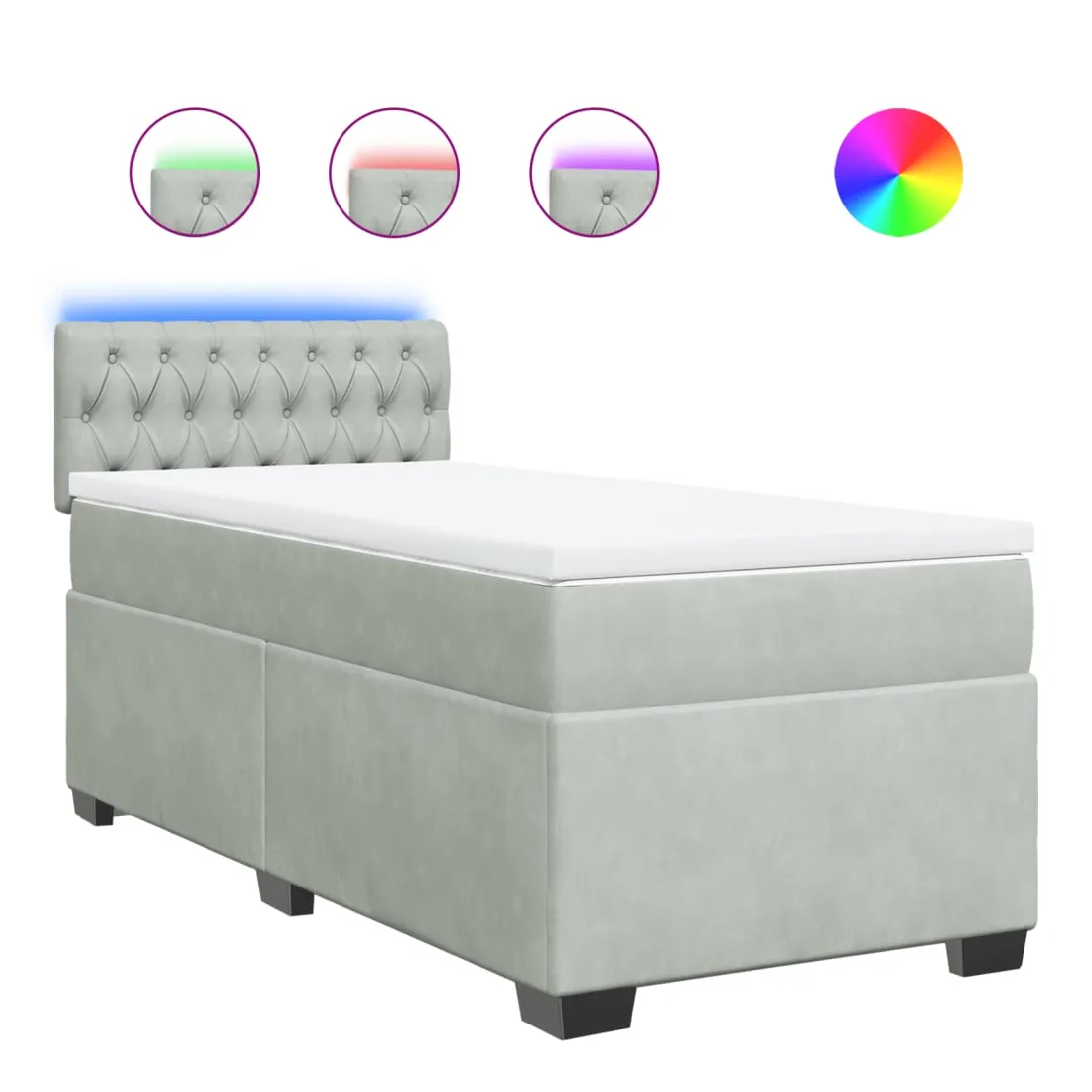 Utilisez ce lit à sommier pour profiter d'une nuit de sommeil réparatrice ! Il vous offre une relaxation maximale et un sommeil agréable. Matériau doux et confortable : le tissu en velours présente une surface douce et lisse qui offre une sensation agréable contre la peau, vous apportant chaleur et confort ultime.Matelas à ressorts ensachés : ce matelas à ressorts ensachés comporte des ressorts ensachés individuels qui fonctionnent indépendamment pour offrir un soutien personnalisé en réagissant uniquement à la pression exercée dans chaque zone. Cette conception empêche « l'enroulement » et réduit le transfert de mouvement par rapport aux matelas traditionnels à ressorts ouverts. Chaque ressort ensaché soutient le corps individuellement.Lumières LED pour une ambiance agréable : ce lit est équipé de lumières LED qui peuvent être facilement réglées pour créer un spectacle lumineux personnalisé. Vous pouvez personnaliser les modes, les couleurs et la luminosité pour améliorer l'ambiance de votre espace intérieur.Surmatelas confortable : ce surmatelas améliore le soutien et le confort grâce à sa surface douce et respirante, tout en prolongeant la durée de vie de votre matelas. Sa housse amovible permet un lavage facile, ce qui facilite l'entretien. Bon à savoir :Ce produit est doté d'un connecteur USB qui nécessite une source d'alimentation USB de 5V certifiée (non incluse).Pour des raisons d'hygiène, le matelas ne peut pas être retourné si l'emballage est retiré ou ouvert.Seule la partie avec un symbole de ciseaux peut être coupée et seule la partie avec l'USB continuera à fonctionner comme avant.